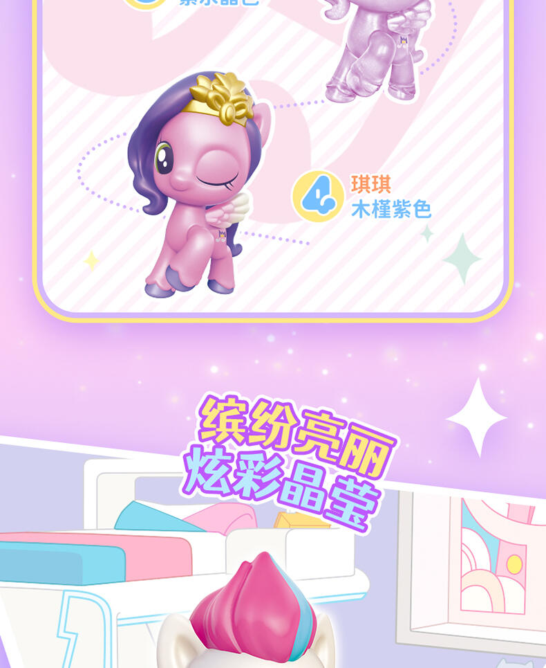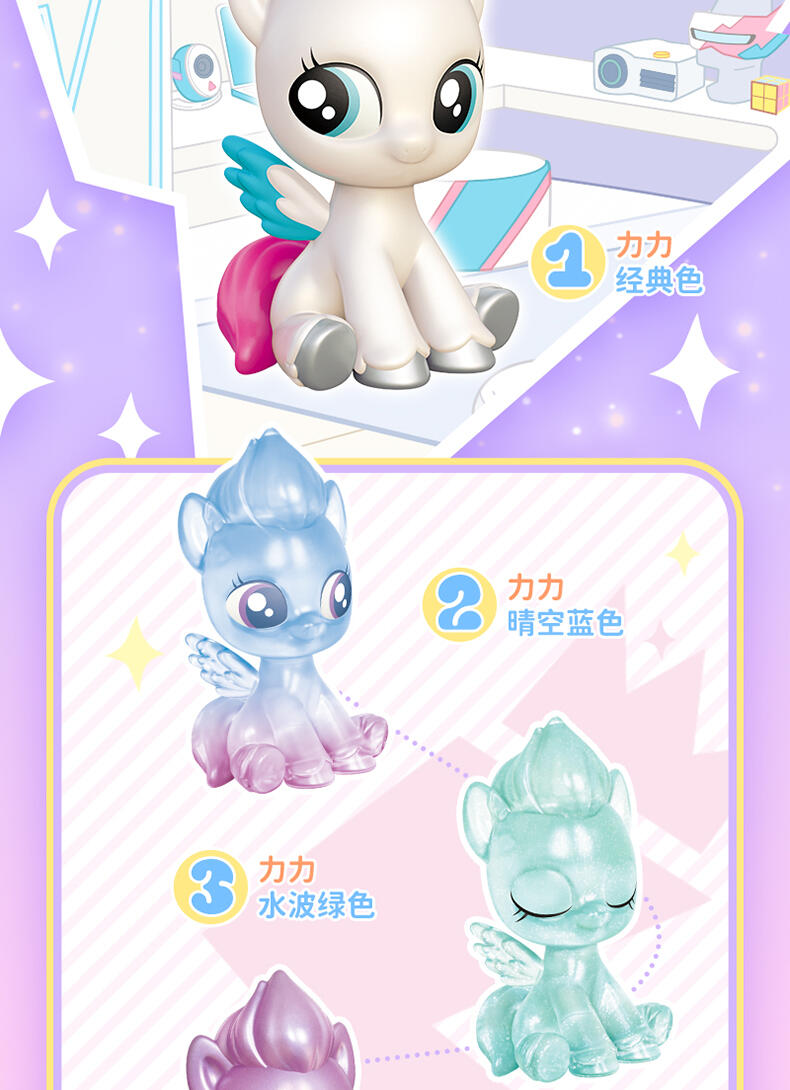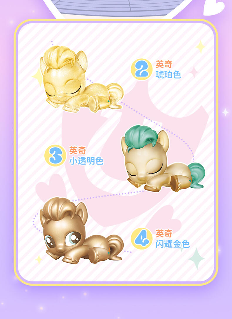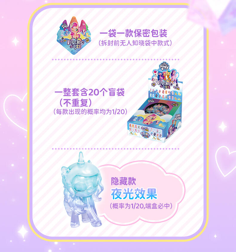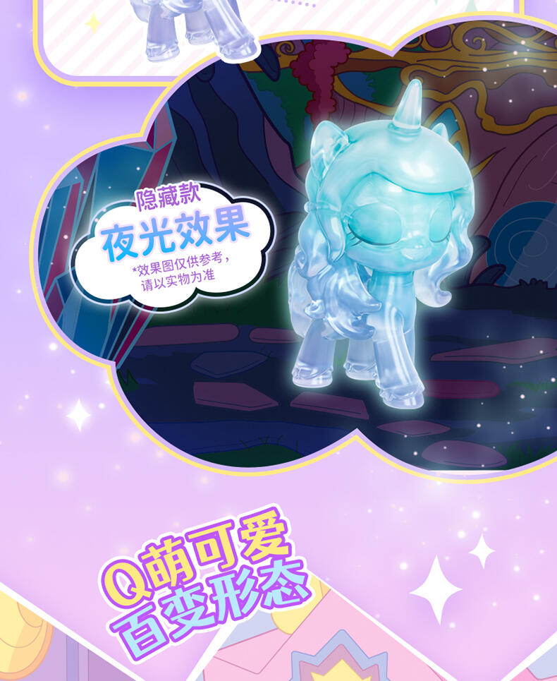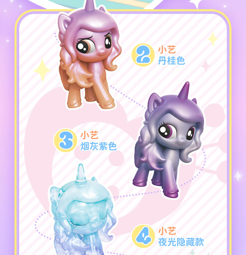 迷你Q版各种姿态的小马宝莉,每款形象有4种不同的外观工艺哦,5个角色共20款,隐藏款有夜光功能