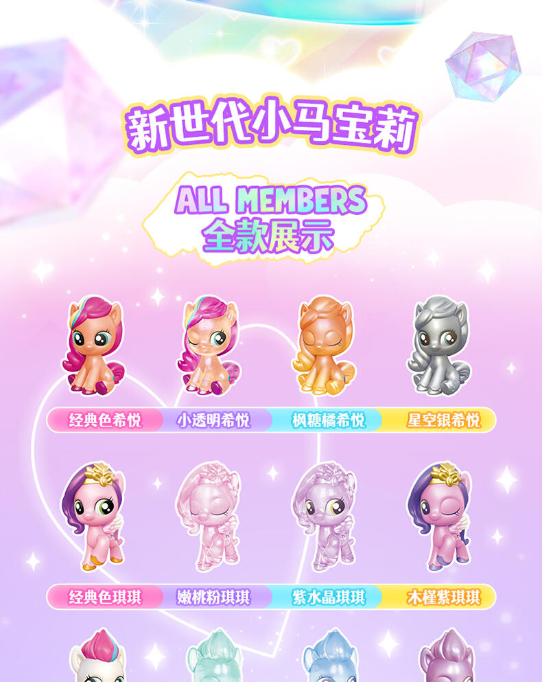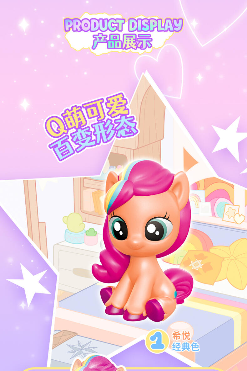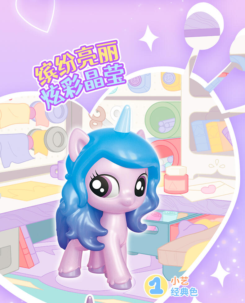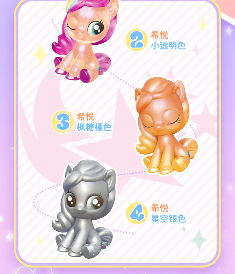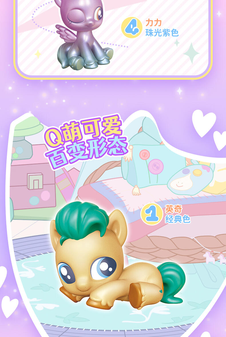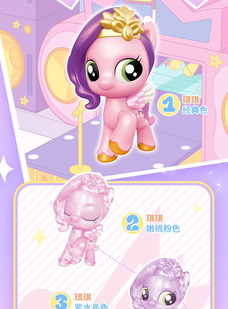 迷你Q版各种姿态的小马宝莉,每款形象有4种不同的外观工艺哦,5个角色共20款,隐藏款有夜光功能