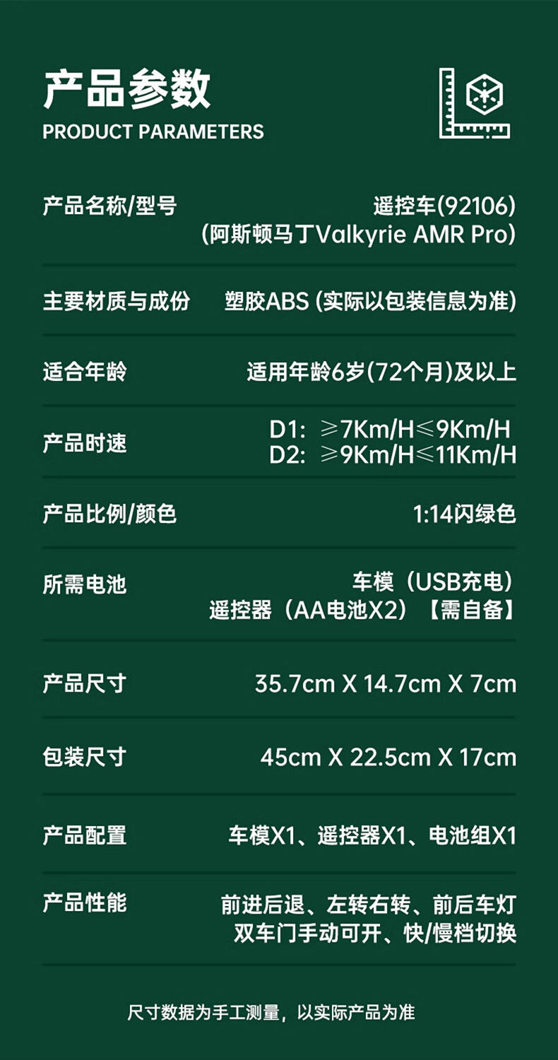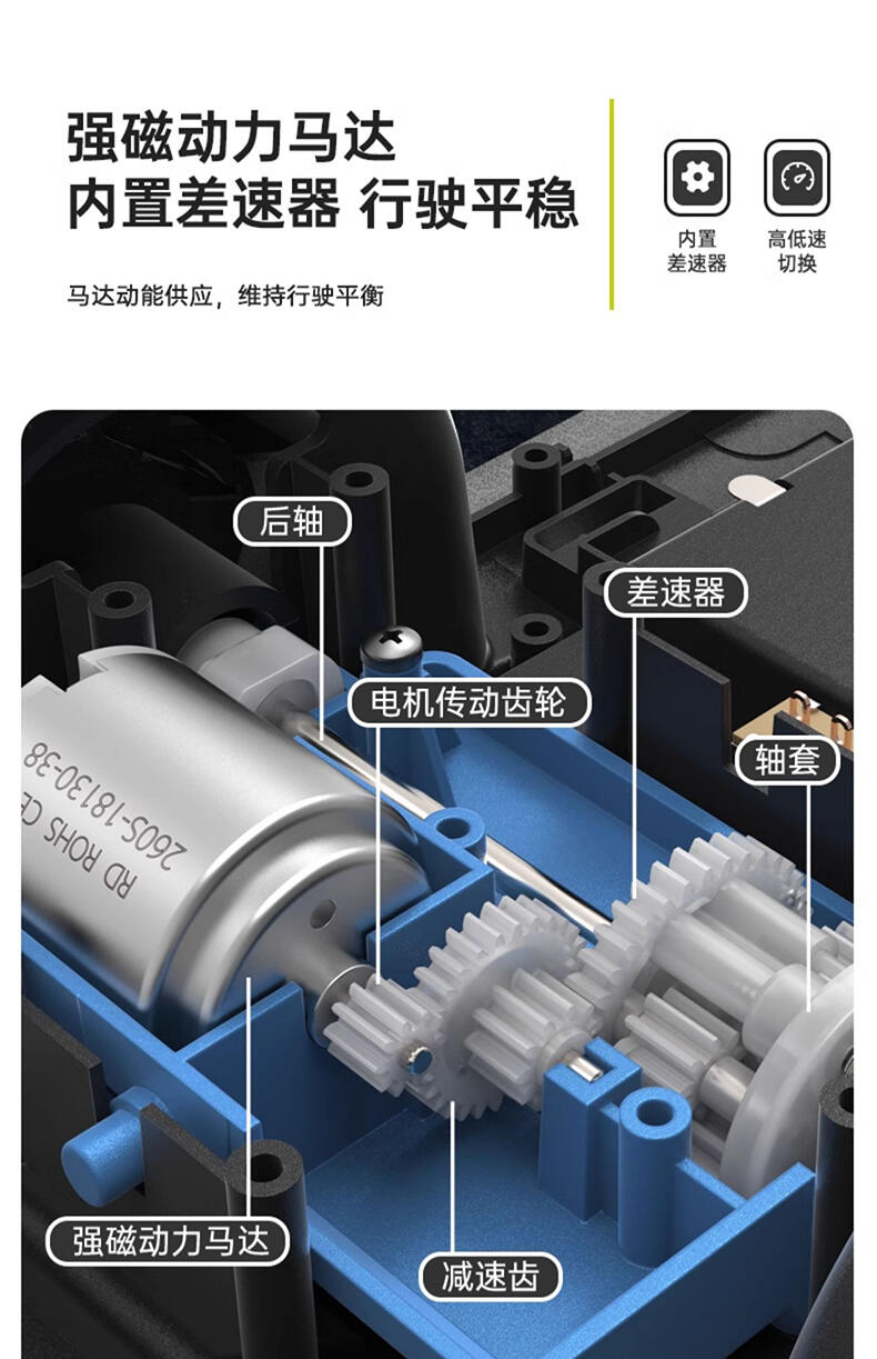遥控前进后退,左右转弯,前后车灯,双车门手动可开、快/慢档切换