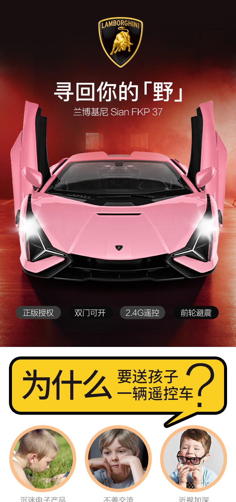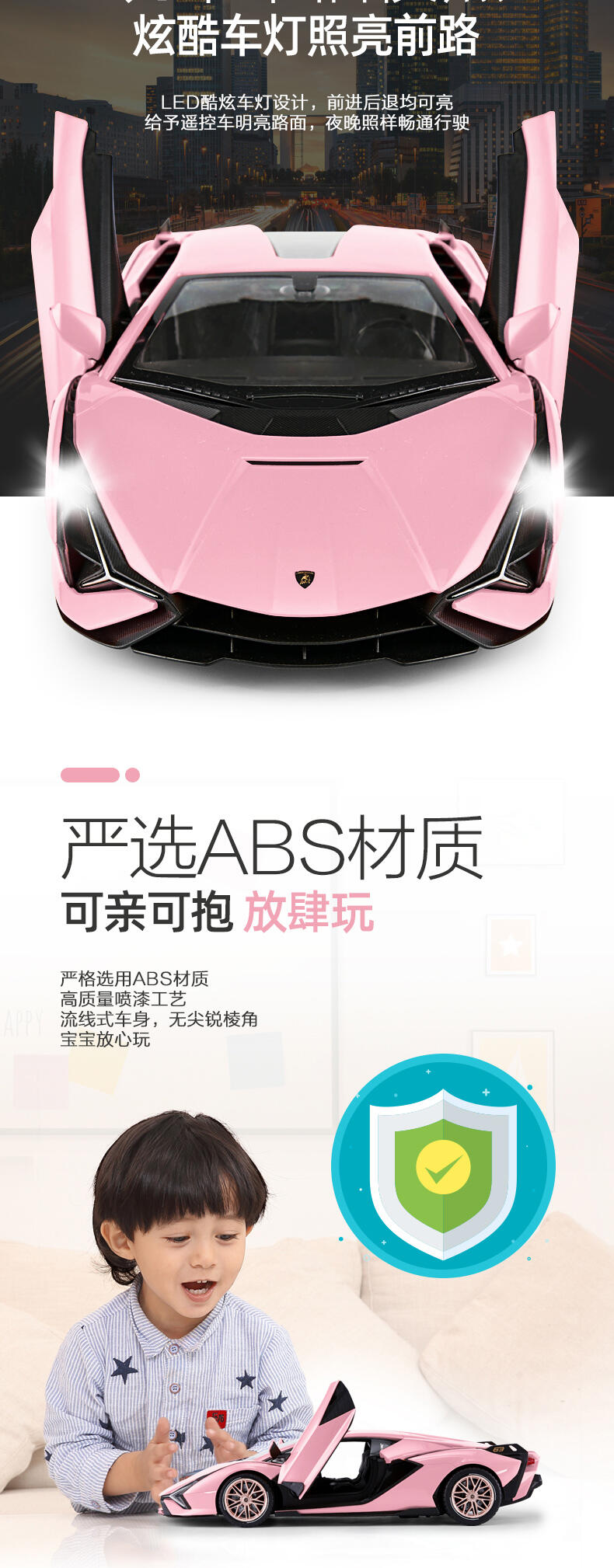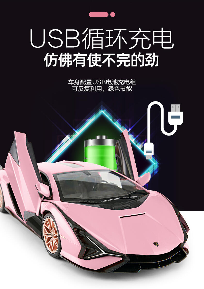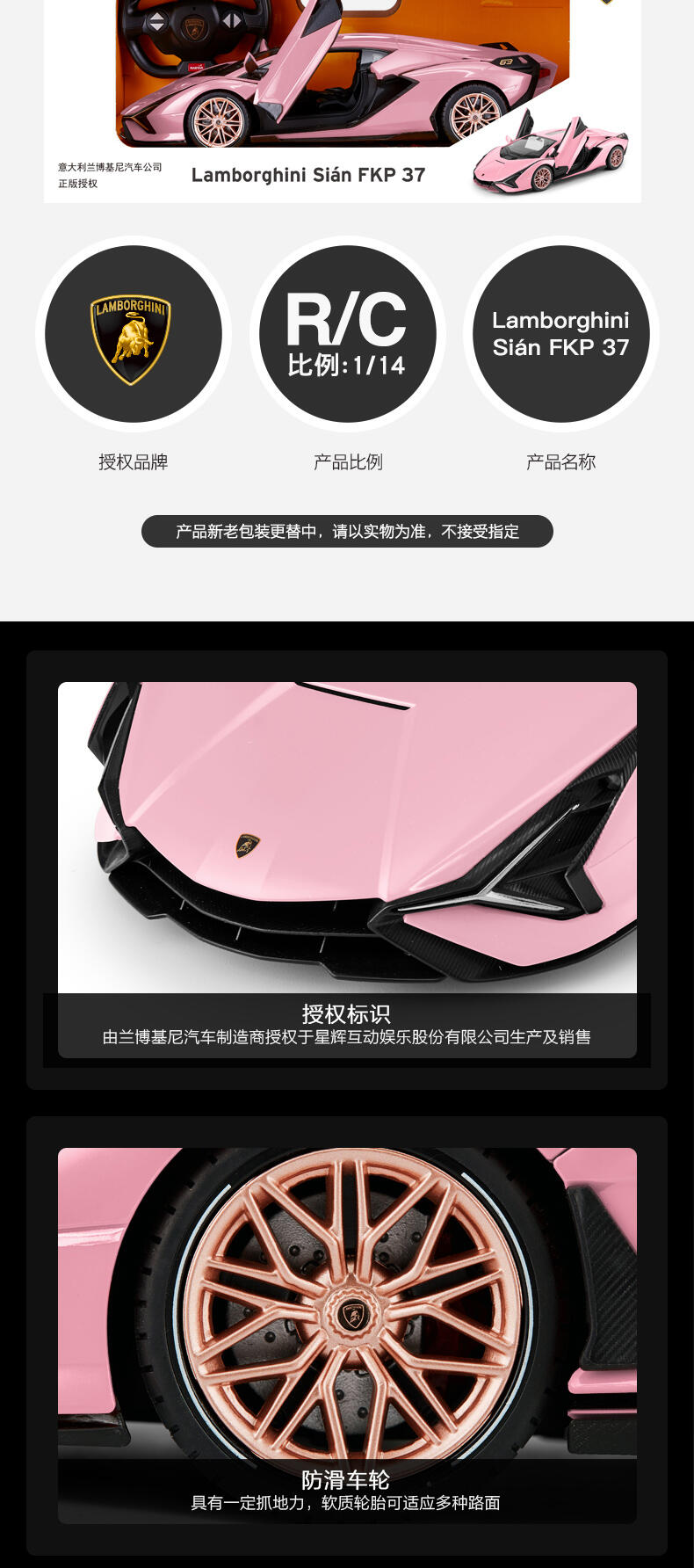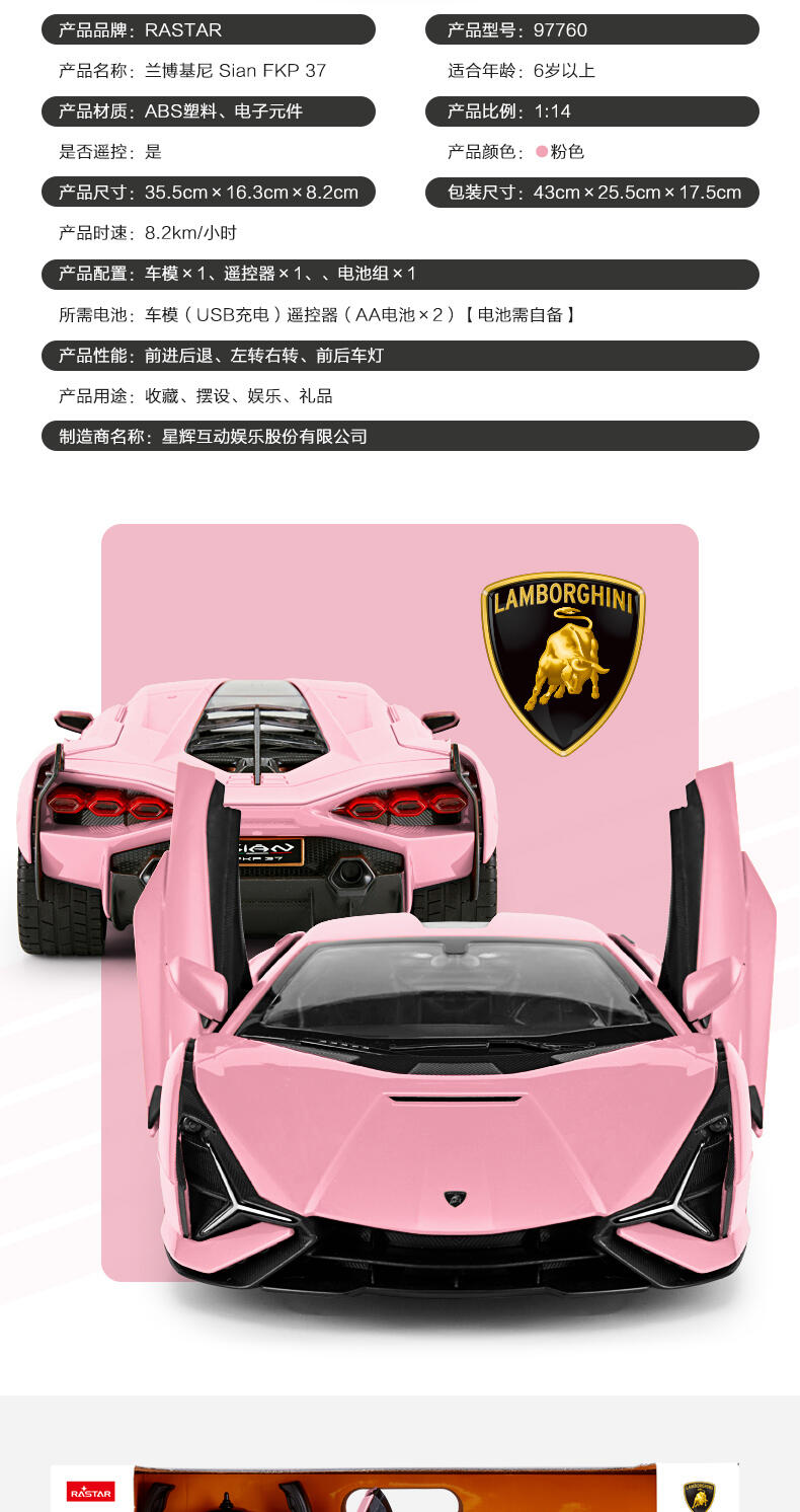 14兰博基尼 Sian FKP 37是由兰博基尼汽车制造商授权星辉互动娱乐股份有限公司制作与销售的一款遥控车,造型仿真,增强孩子对公路赛车的认知和向往。