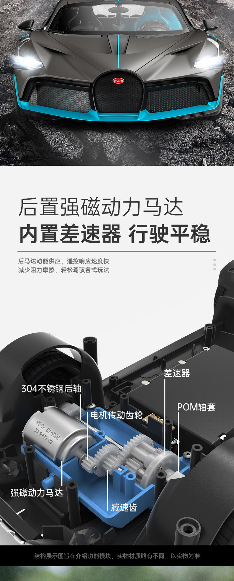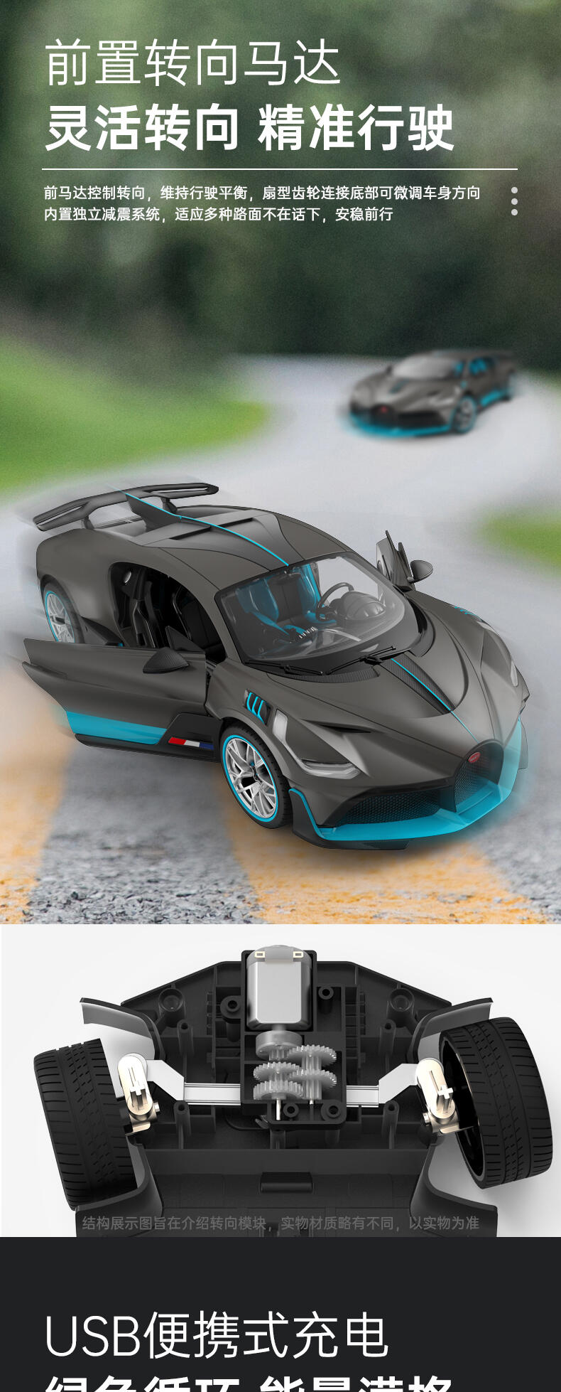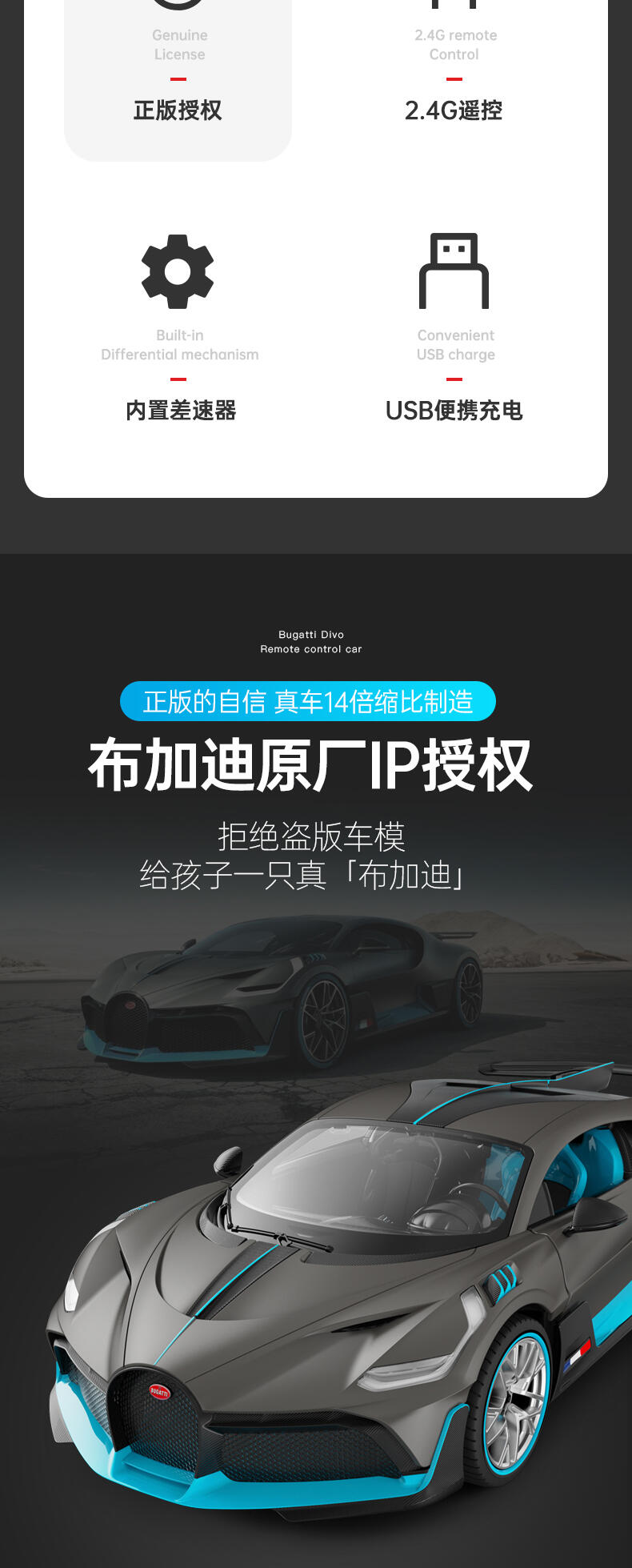 功能:可前进后退左右转弯,车身灯光可亮。正版授权,内置差速器,行驶平稳,USB便携式充电可循环利用。 本产品经过精心设计,优质材料制成,用心打磨细节,边缘光滑,制作精良。适合小朋友玩耍,也可以与其他小朋友一起分享,和父母同玩,促进亲子关系发展