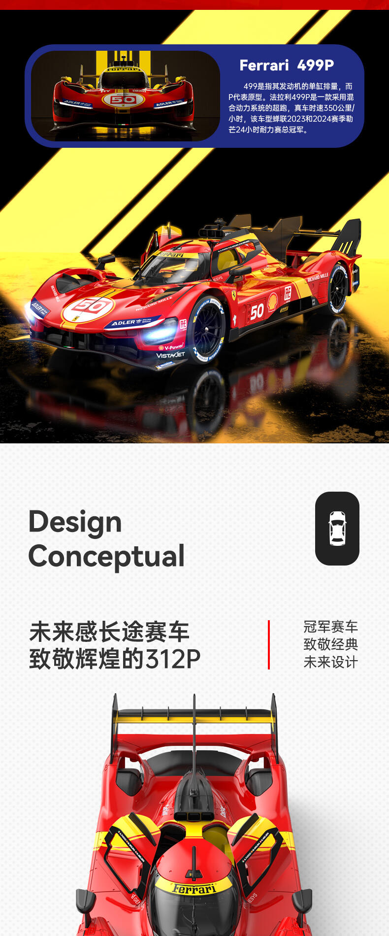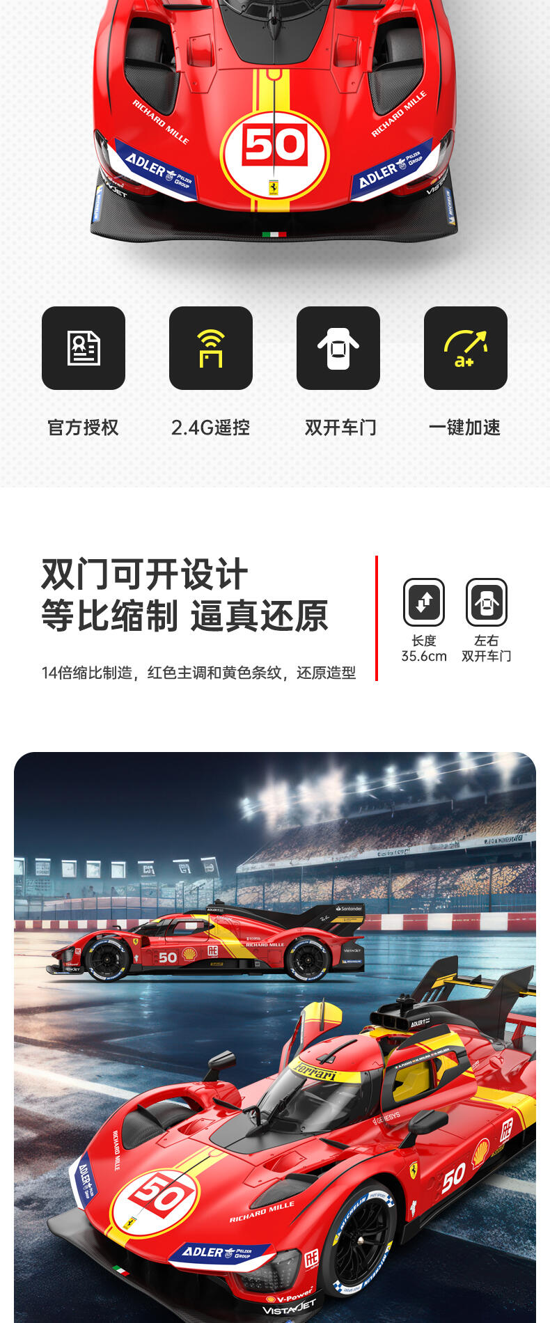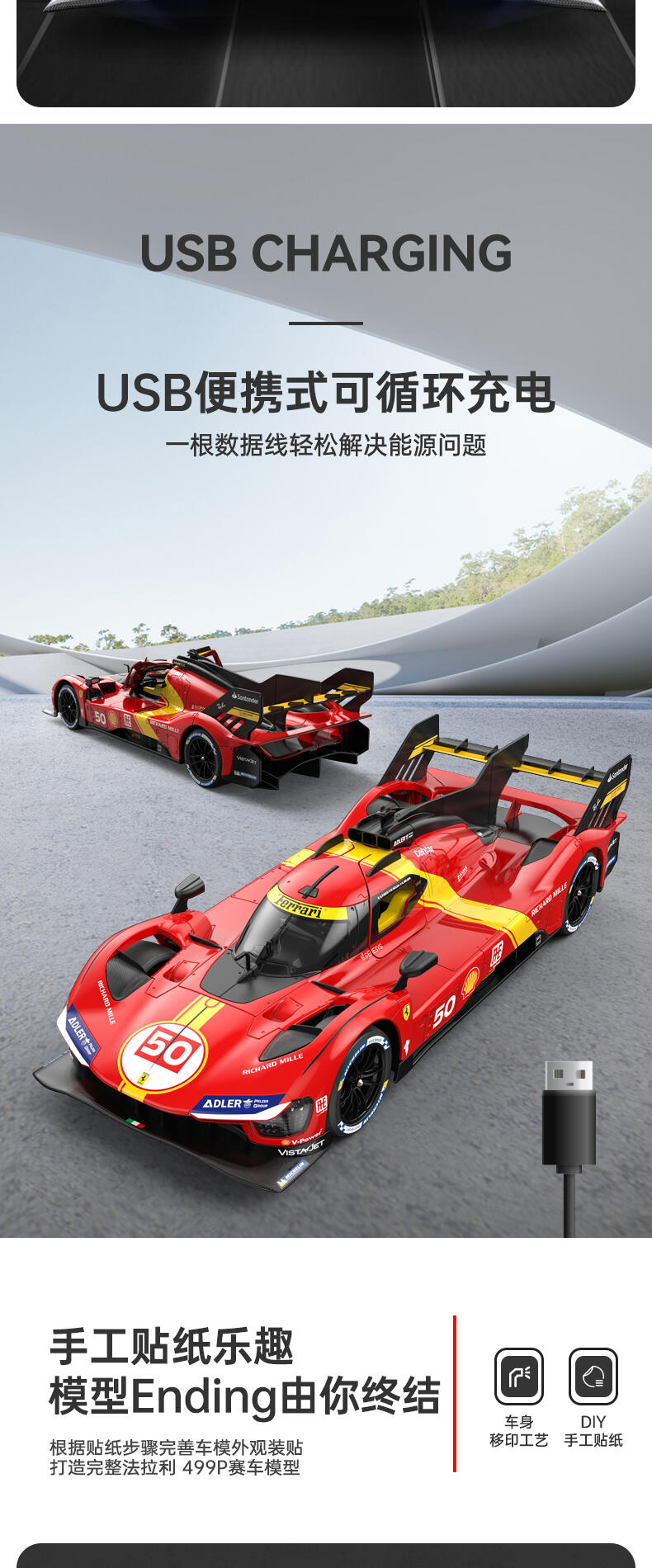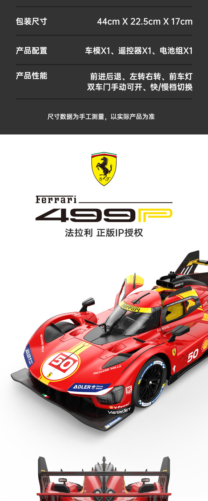 重返巅峰,法拉利499P勒芒超跑。官方授权,2.4G遥控防干扰,一车一控,操作顺畅易上手。双开车门,等比缩制,逼真还原。,一键加速,灵活变速。LED车灯,可黑夜玩耍。USB便携充电。手工贴纸DIY.四轮减震,平稳行驶。遥控前进后退,左右转弯,前车灯,双车门手动可开.