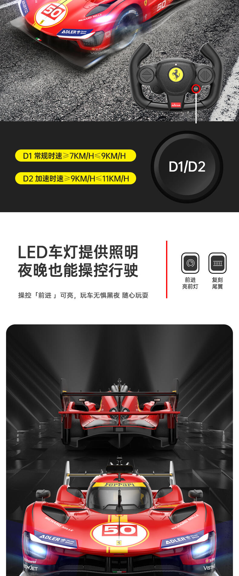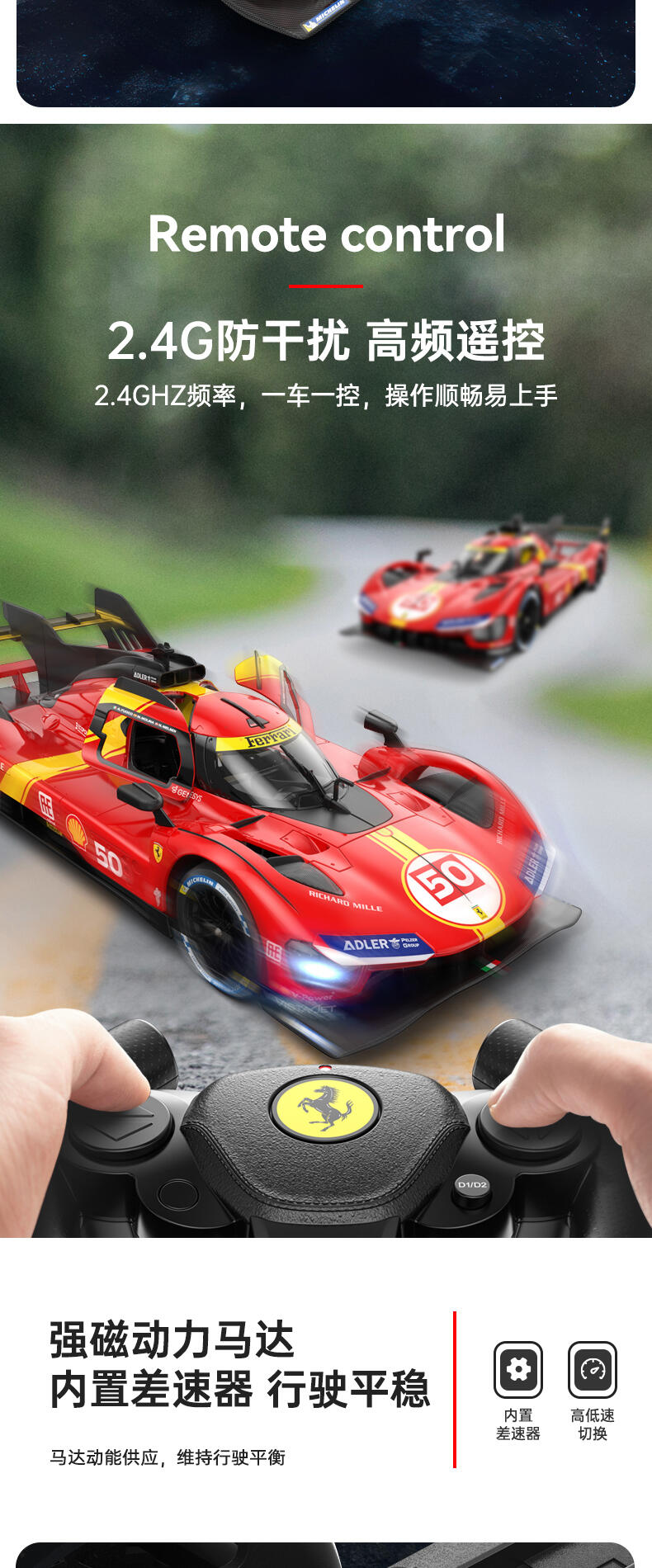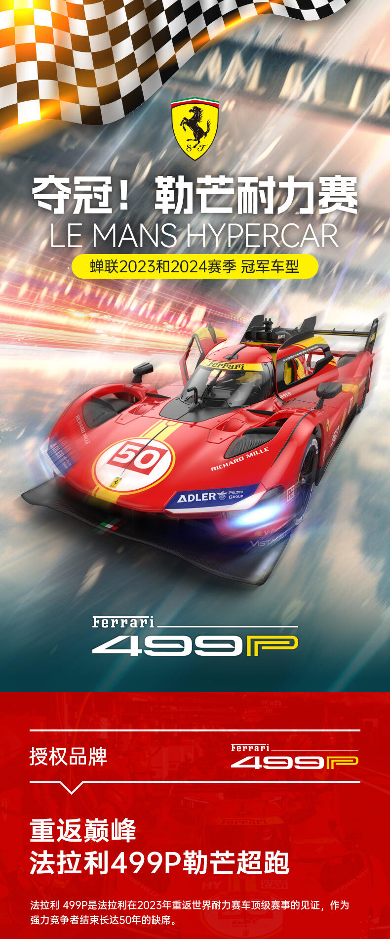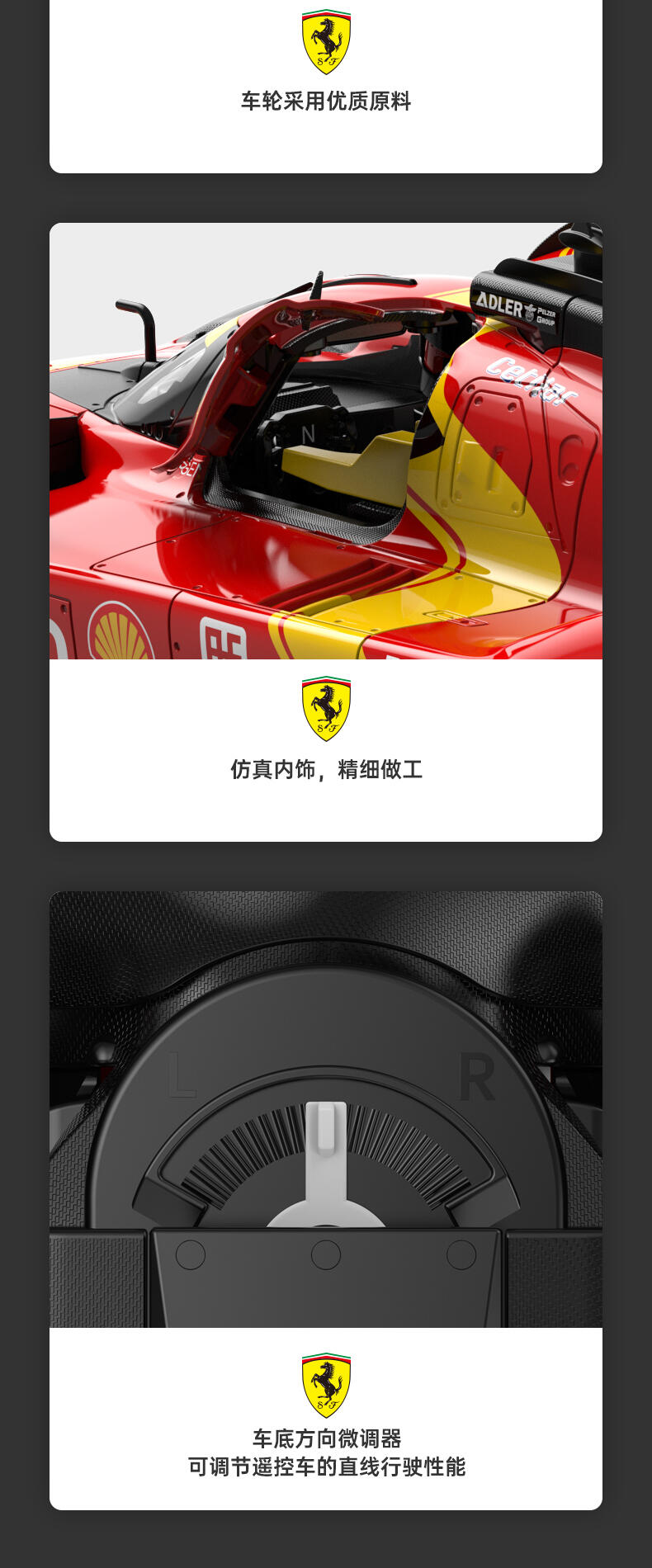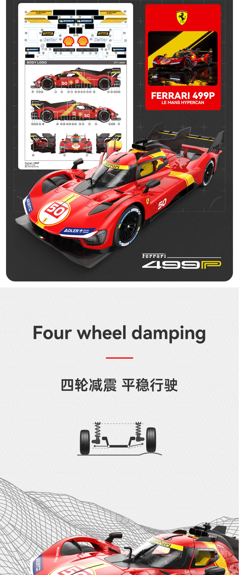 重返巅峰,法拉利499P勒芒超跑。官方授权,2.4G遥控防干扰,一车一控,操作顺畅易上手。双开车门,等比缩制,逼真还原。,一键加速,灵活变速。LED车灯,可黑夜玩耍。USB便携充电。手工贴纸DIY.四轮减震,平稳行驶。遥控前进后退,左右转弯,前车灯,双车门手动可开.