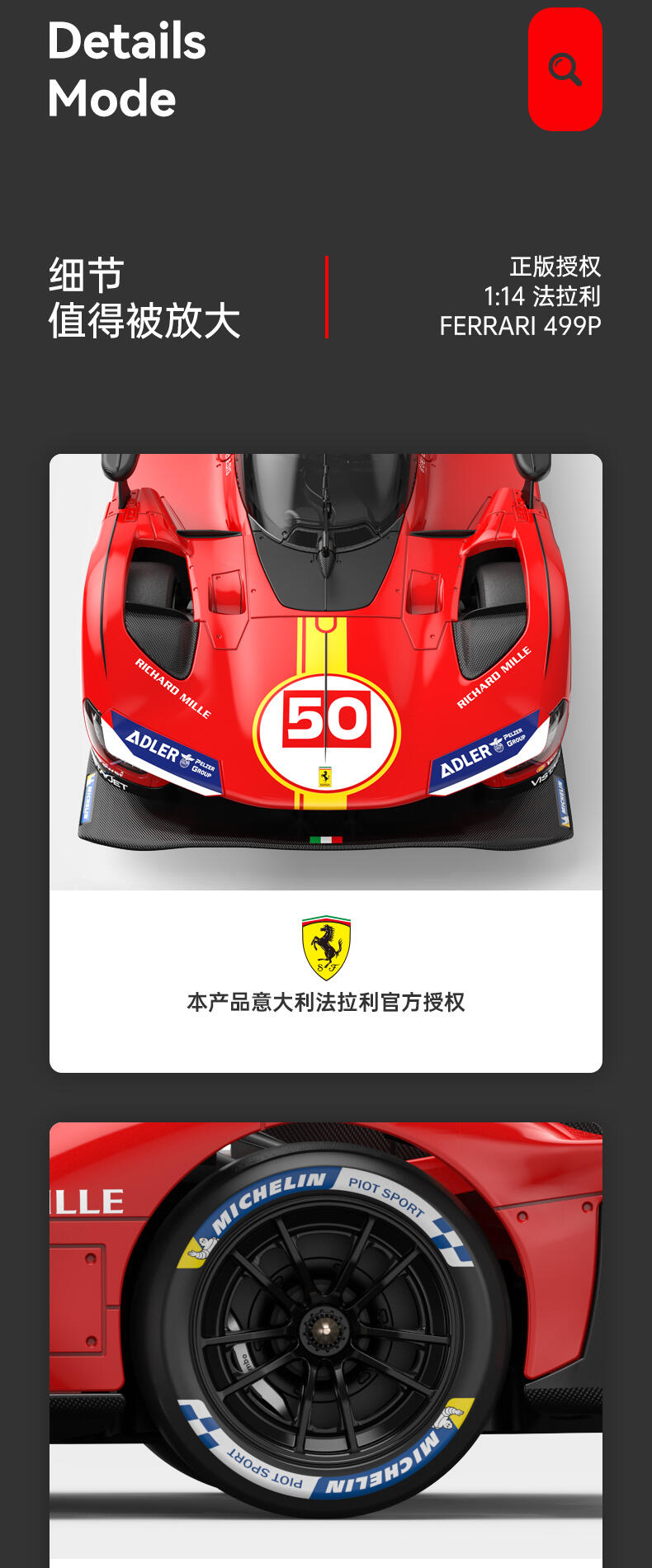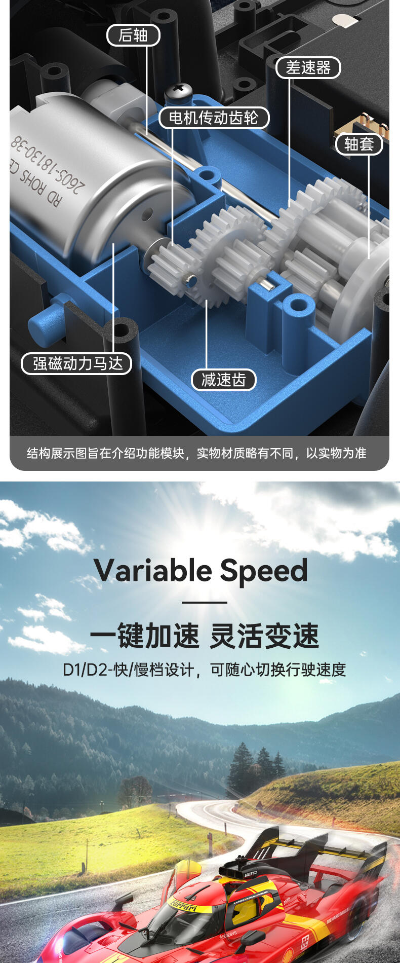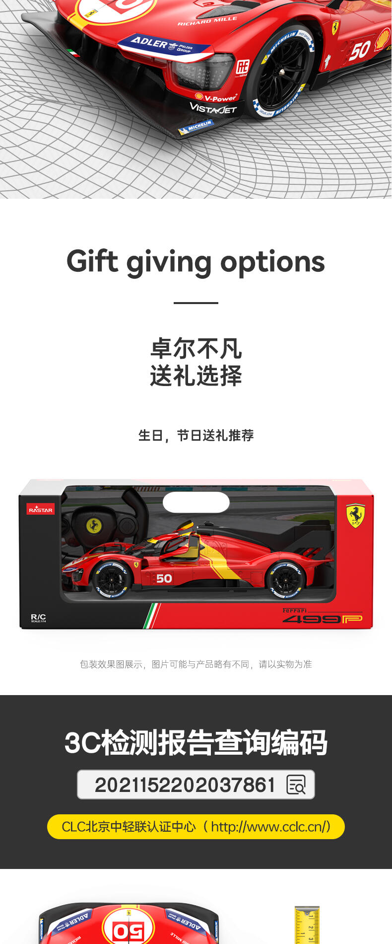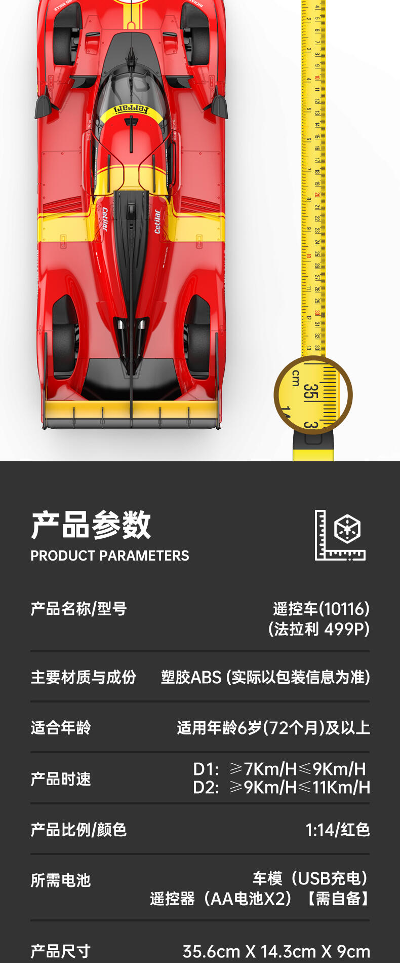 重返巅峰,法拉利499P勒芒超跑。官方授权,2.4G遥控防干扰,一车一控,操作顺畅易上手。双开车门,等比缩制,逼真还原。,一键加速,灵活变速。LED车灯,可黑夜玩耍。USB便携充电。手工贴纸DIY.四轮减震,平稳行驶。遥控前进后退,左右转弯,前车灯,双车门手动可开.