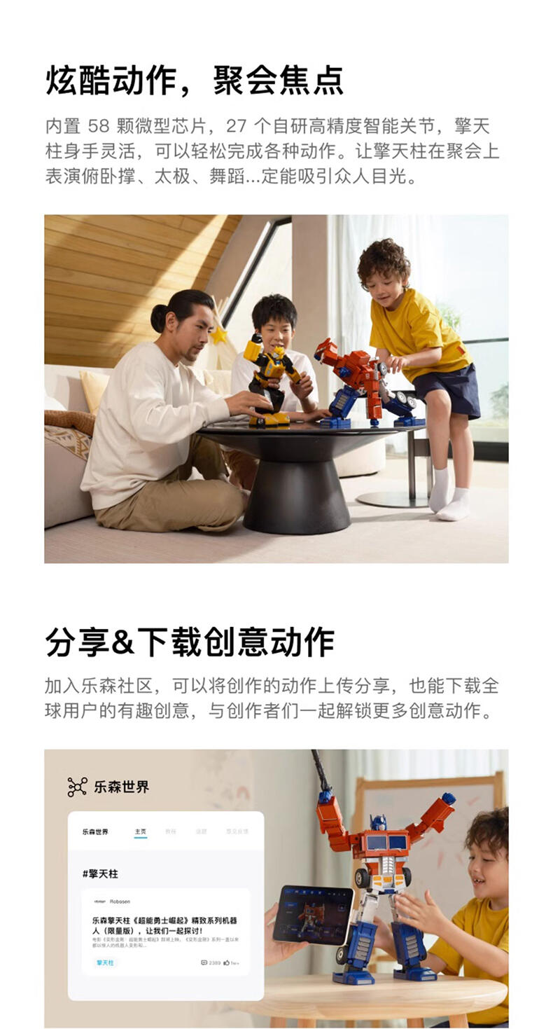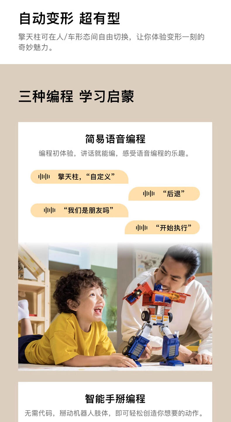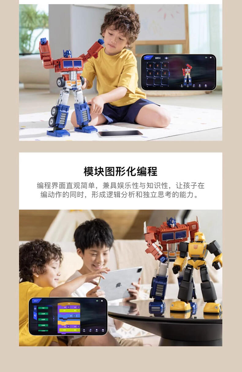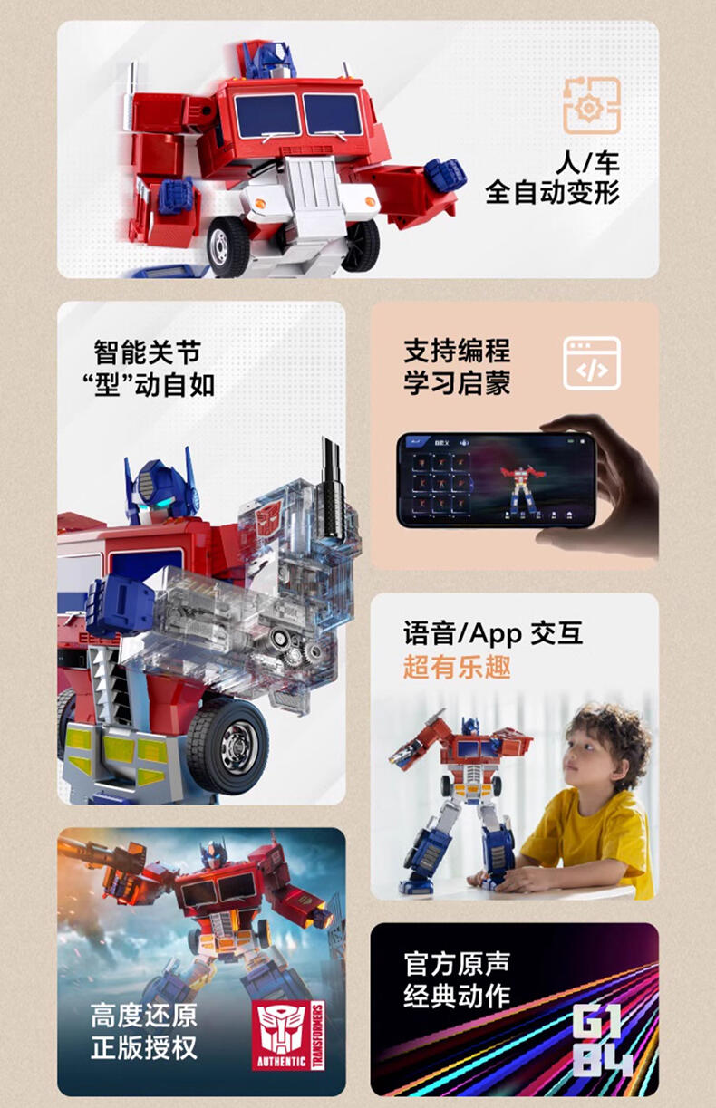 | 可自动变形擎天柱机器人,美国孩之宝正版授权。可以通过语言和APP来操作,四种编程模式,皮特库伦的原版音效,还原经典动作,可以通过自定义,创造各种好玩的动作。 |