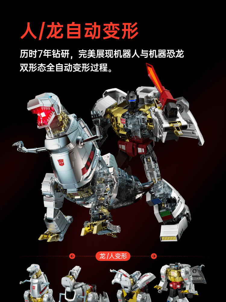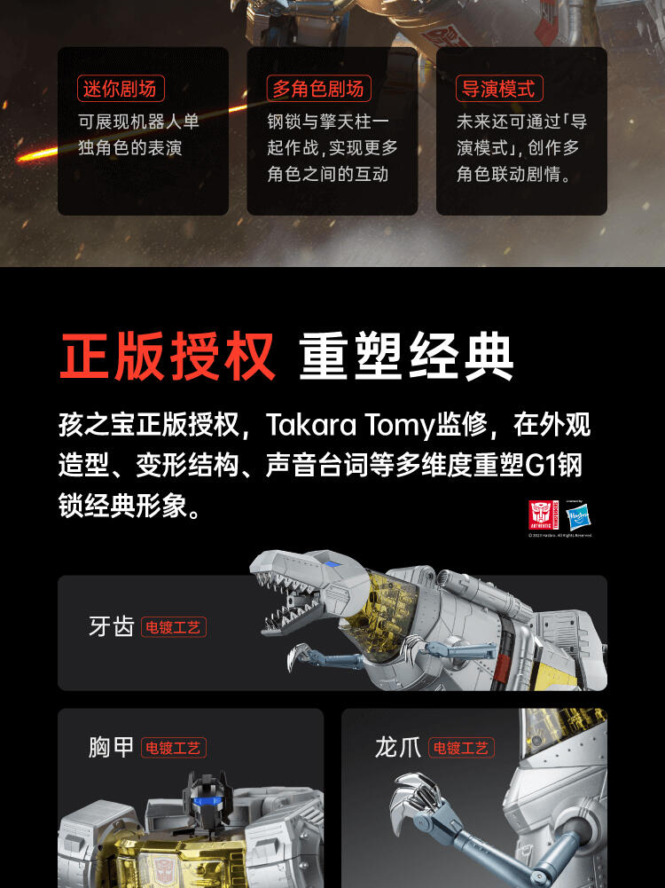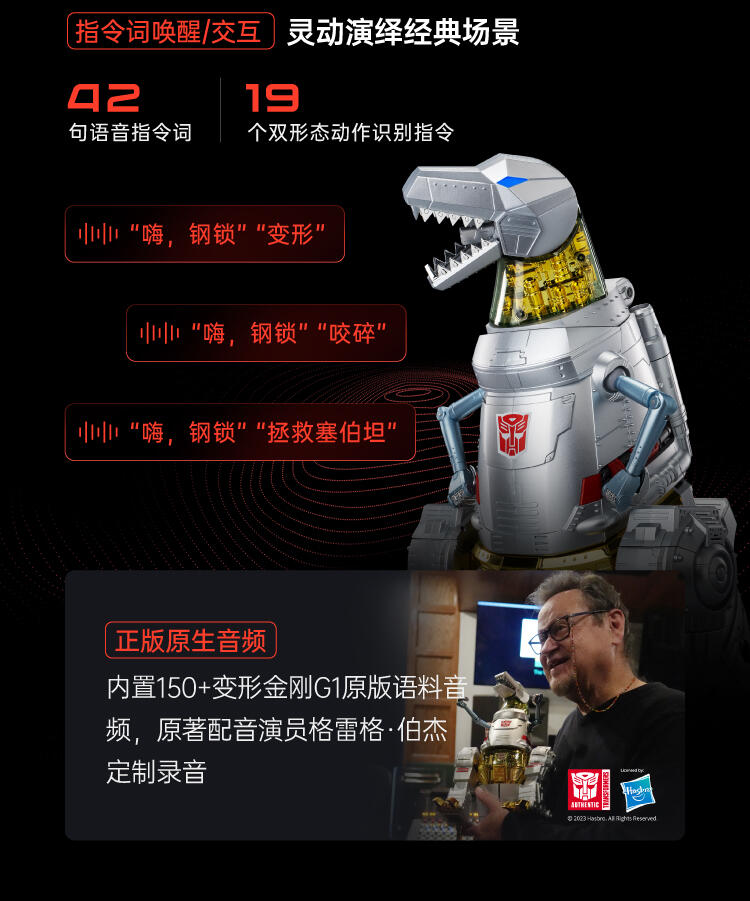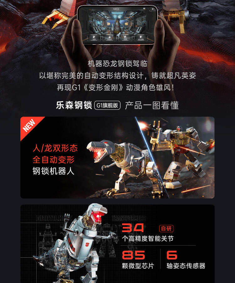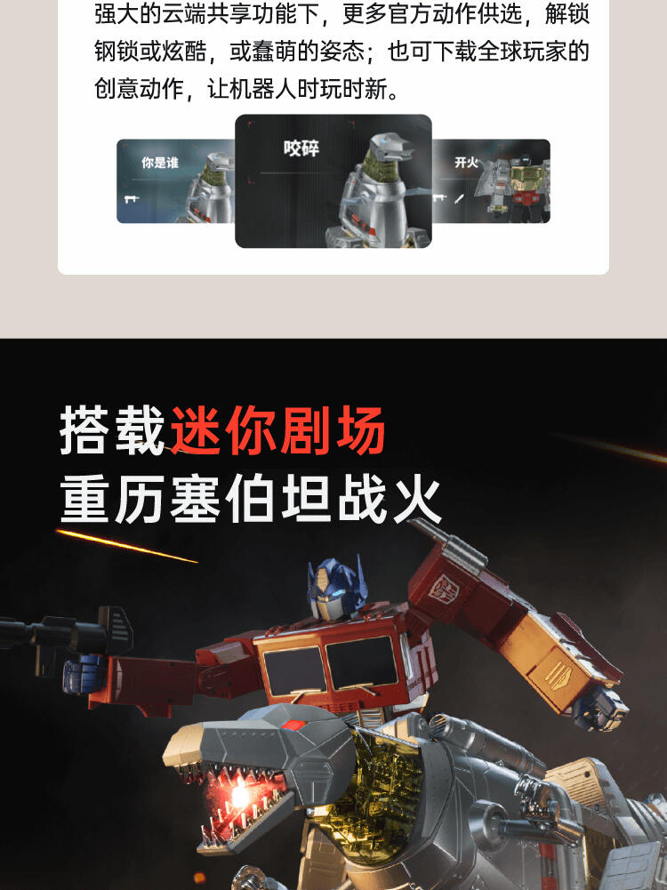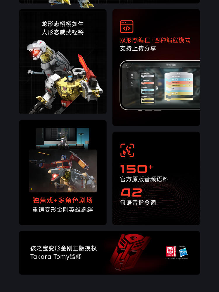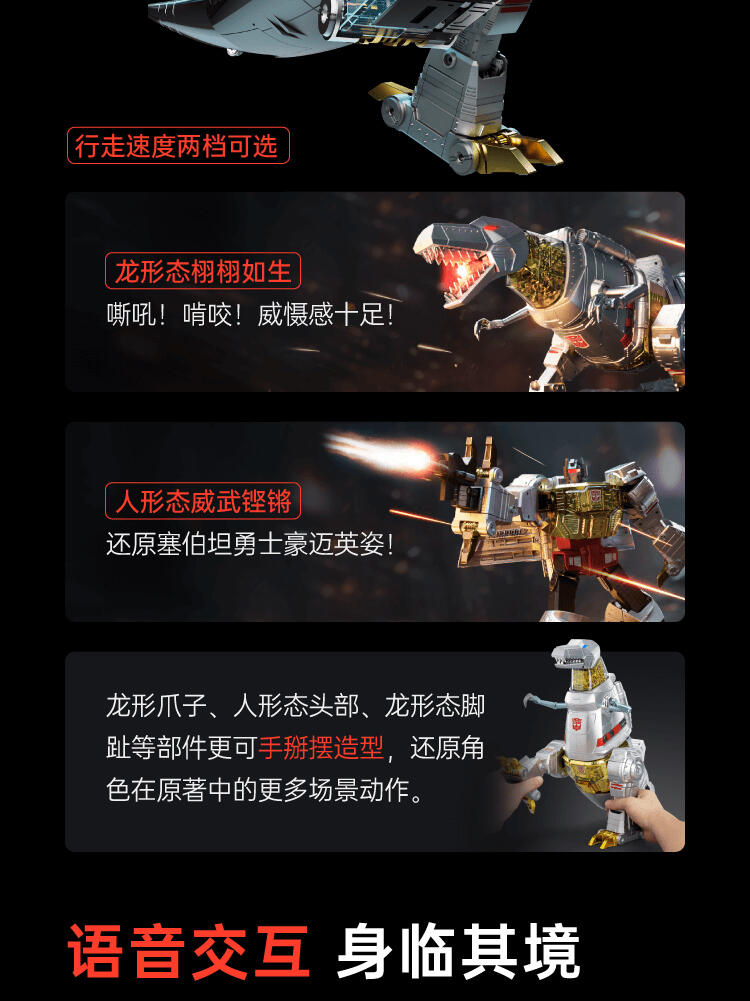 | 全球首款人形和龙形双形态自动变形的机器恐龙机器人,美国孩之宝正版授权,全球限量发售。两种形态自动变形,自由行走,语音和APP两种操控模式,四种编程方式,小剧场模式多角色互动。 |