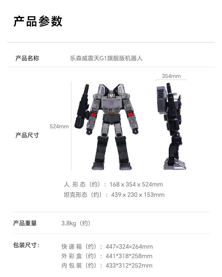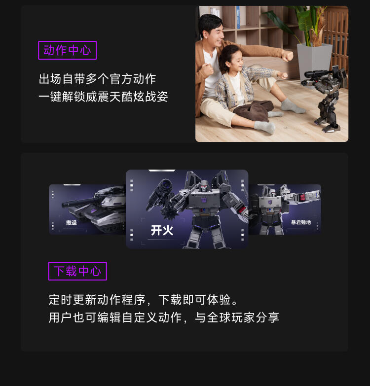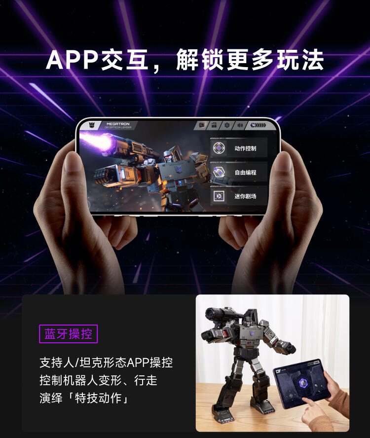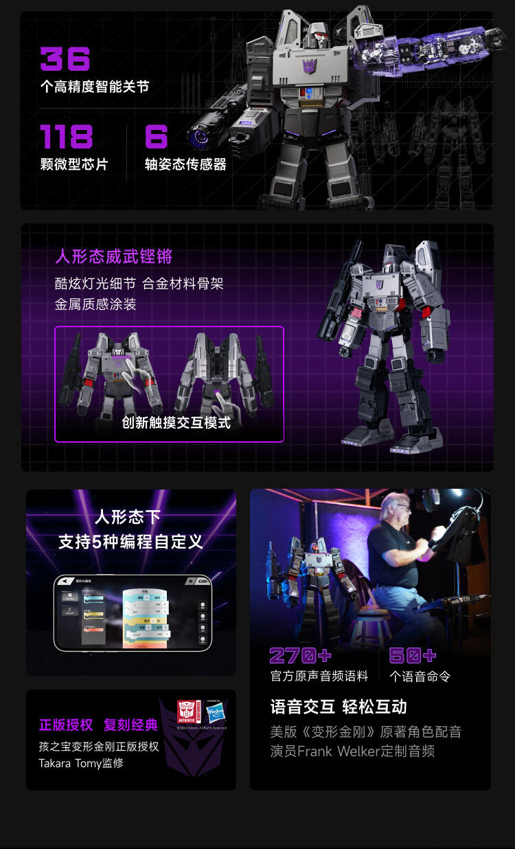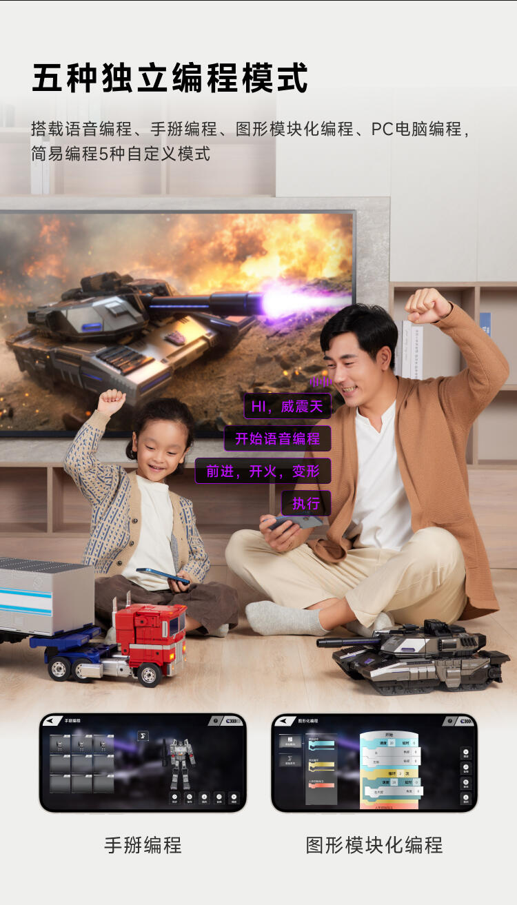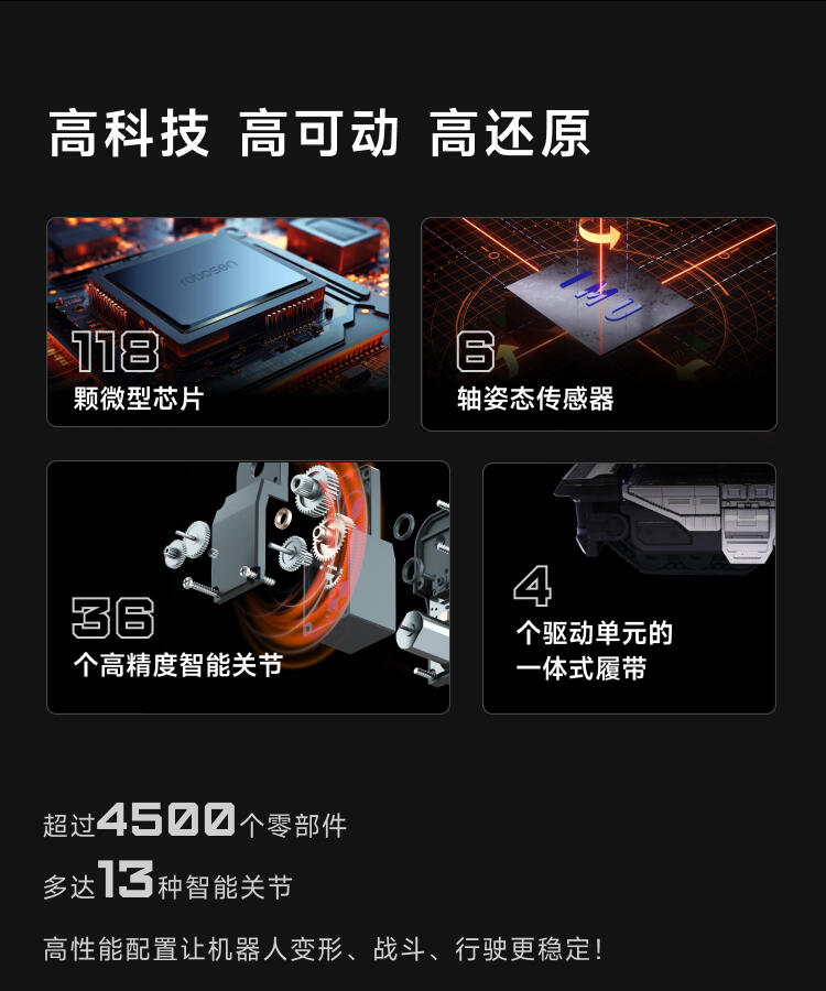 1.全球首款可自动变形的编程机器人威震天,坦克和机器人形态,自由变形。2.高科技,高可动 高还原36个高精度智能关节4个驱动单元的,一体式履带118颗微型芯片,超过4500个零部件,多达13种智能关节,高性能配置让机器人变形、战斗、行驶更稳定。3.新增触摸反馈功能。4.语音操控,轻松交互。5.五种编程模式。6.迷你剧场模式"