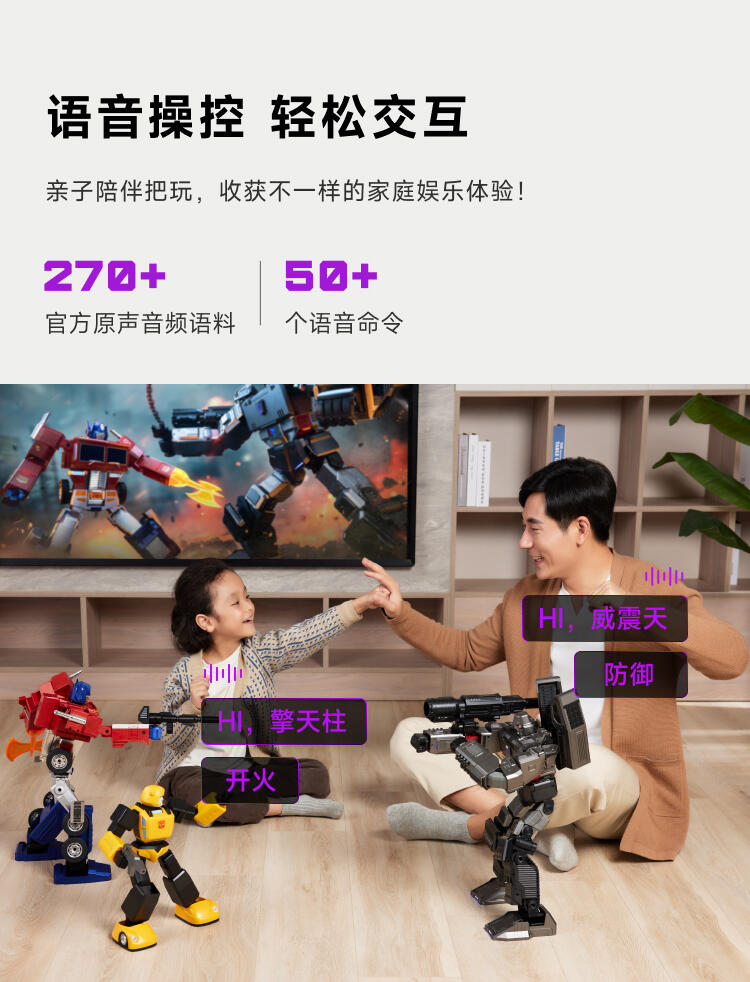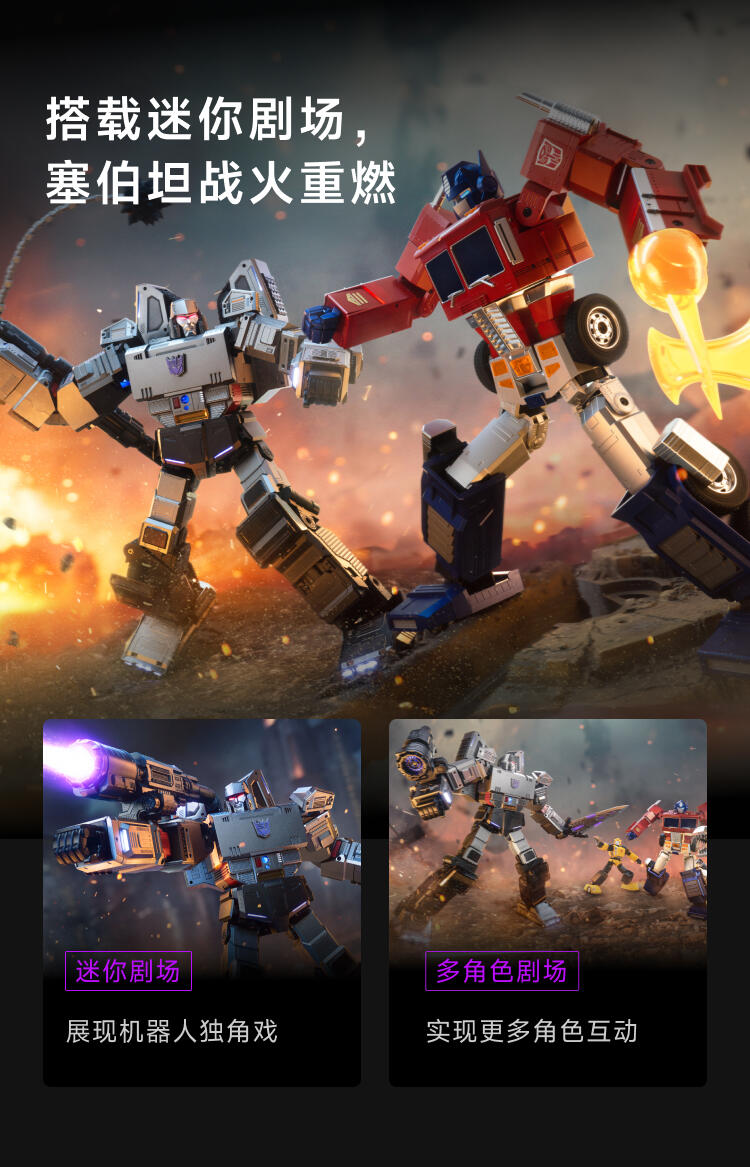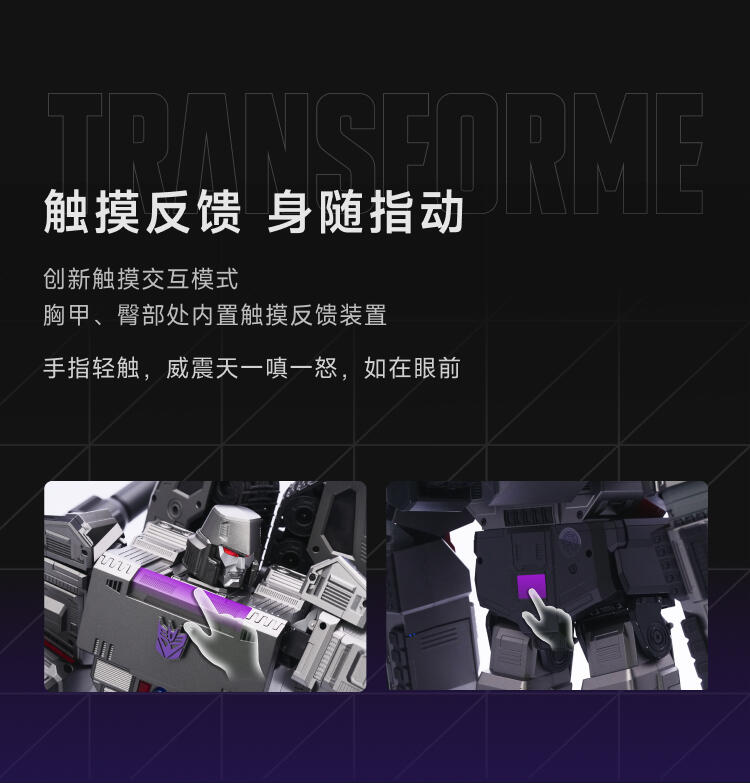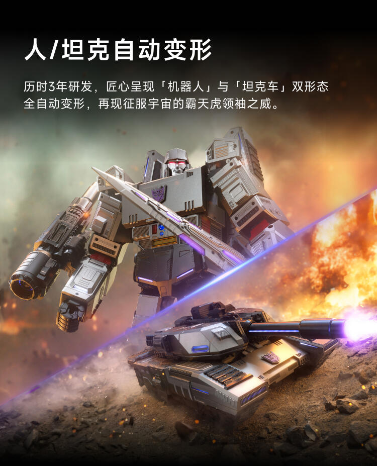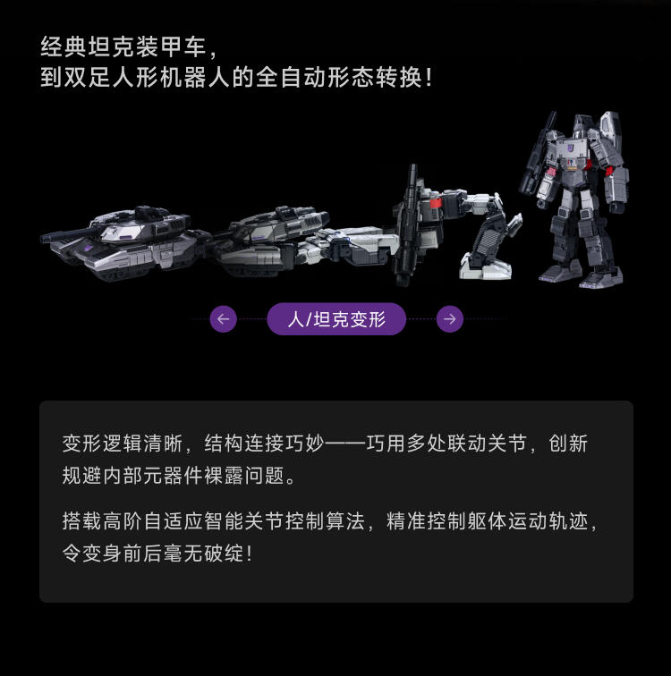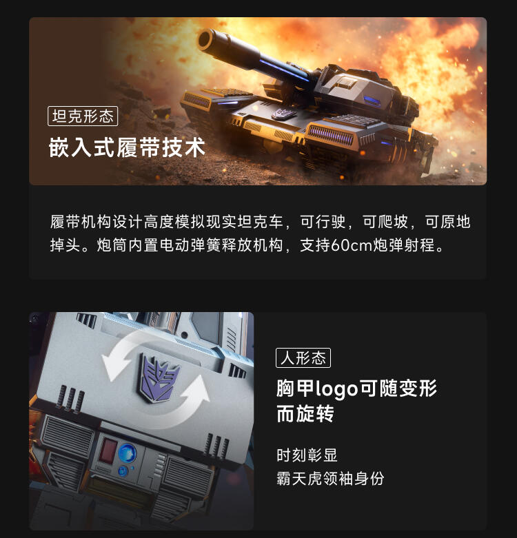 1.全球首款可自动变形的编程机器人威震天,坦克和机器人形态,自由变形。2.高科技,高可动 高还原36个高精度智能关节4个驱动单元的,一体式履带118颗微型芯片,超过4500个零部件,多达13种智能关节,高性能配置让机器人变形、战斗、行驶更稳定。3.新增触摸反馈功能。4.语音操控,轻松交互。5.五种编程模式。6.迷你剧场模式"