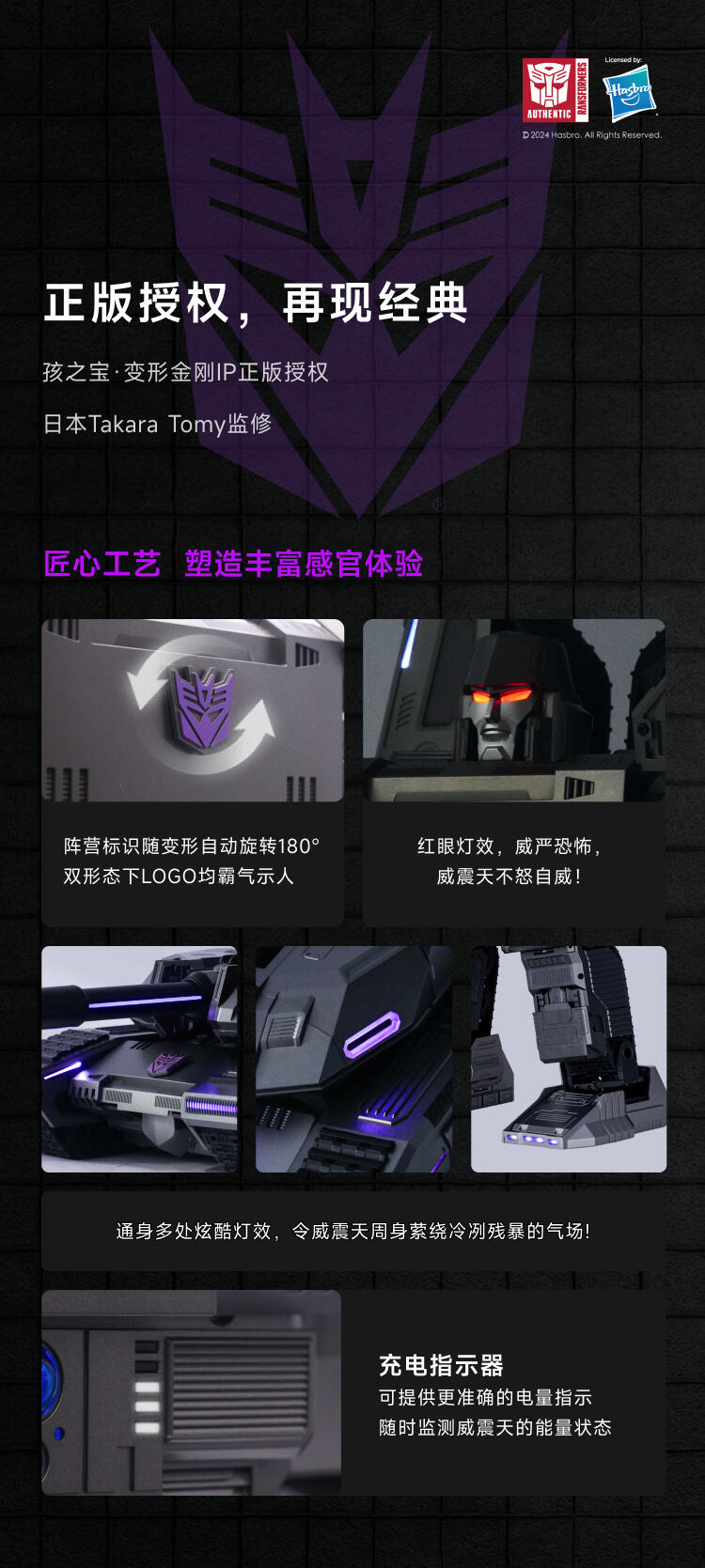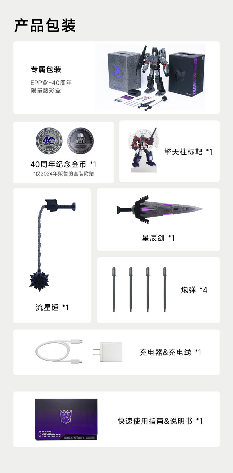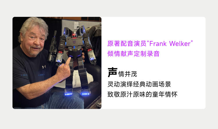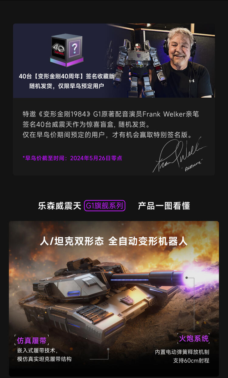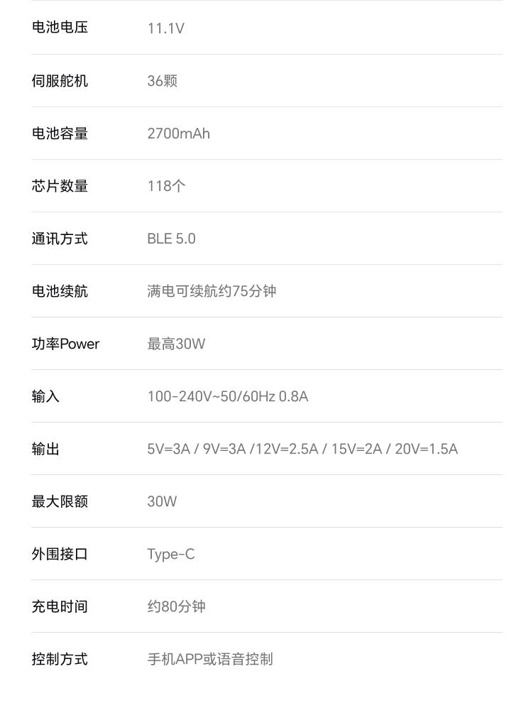 1.全球首款可自动变形的编程机器人威震天,坦克和机器人形态,自由变形。2.高科技,高可动 高还原36个高精度智能关节4个驱动单元的,一体式履带118颗微型芯片,超过4500个零部件,多达13种智能关节,高性能配置让机器人变形、战斗、行驶更稳定。3.新增触摸反馈功能。4.语音操控,轻松交互。5.五种编程模式。6.迷你剧场模式"