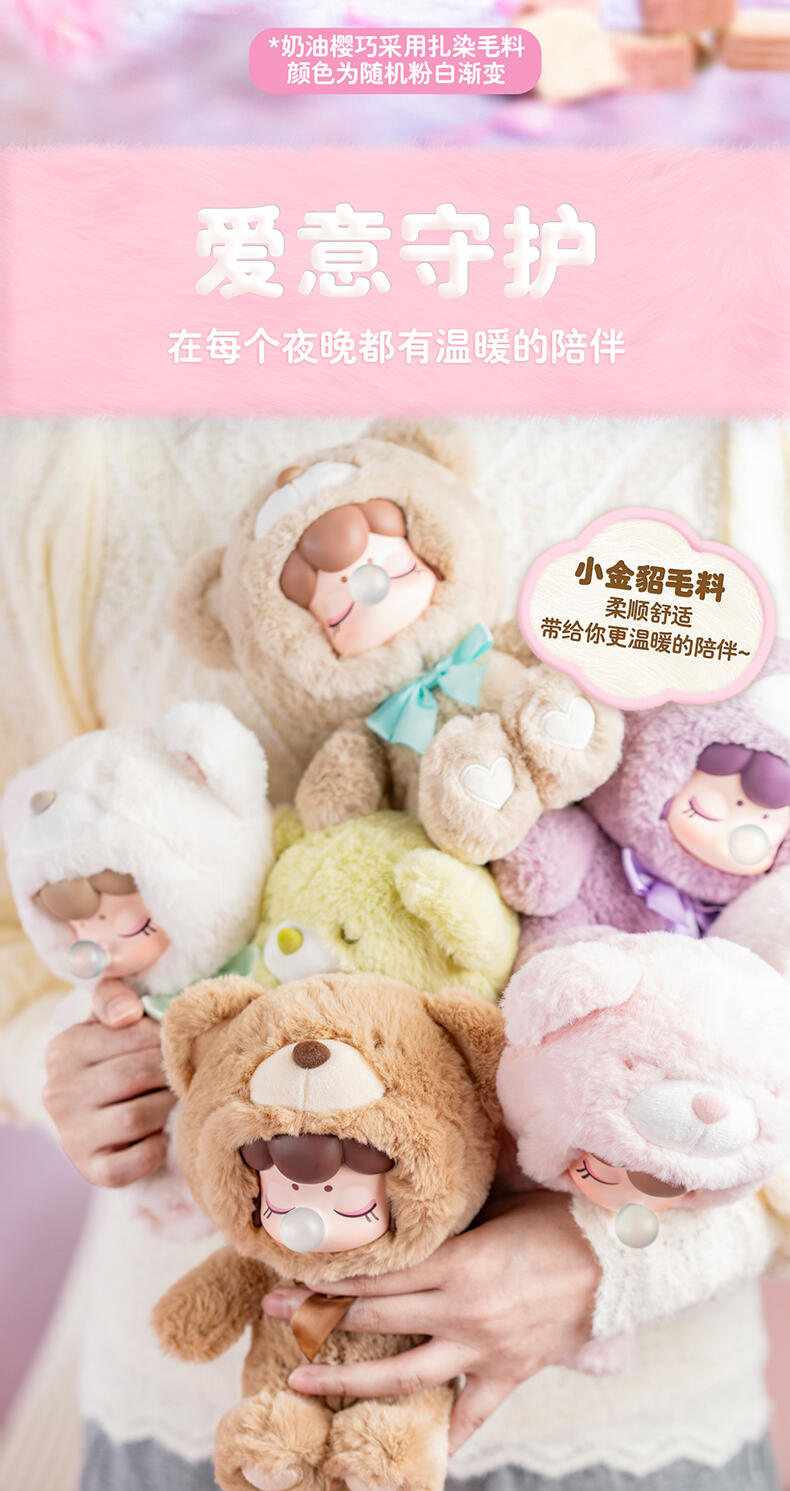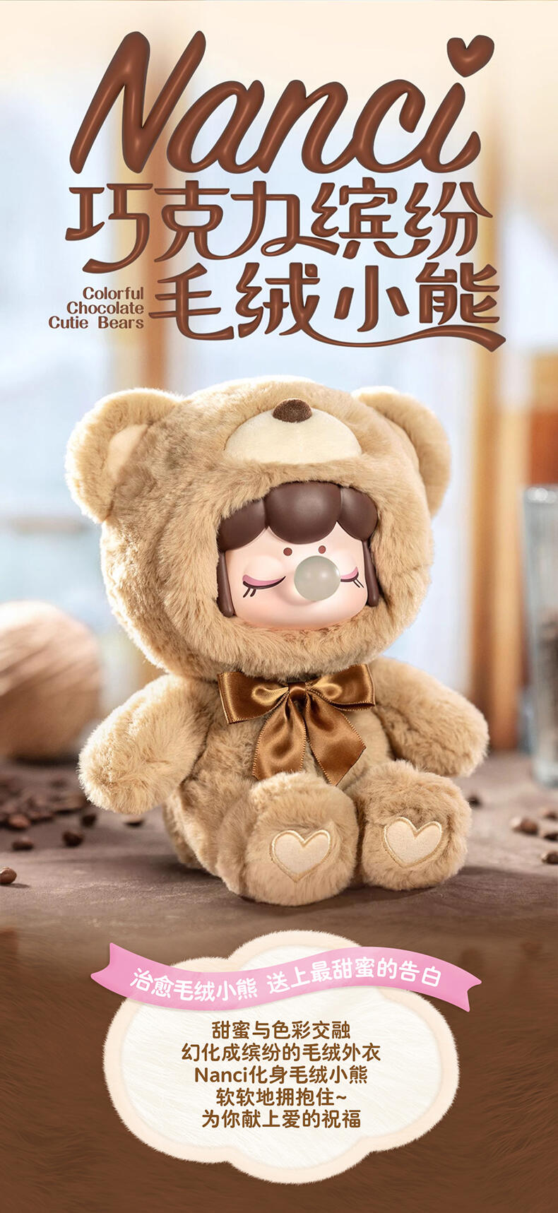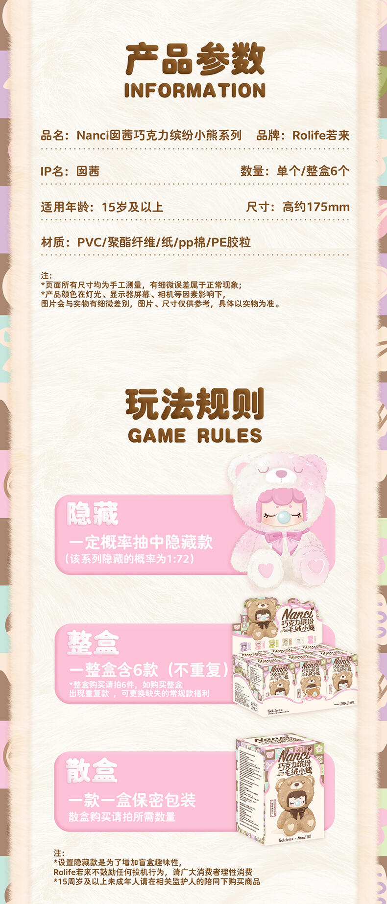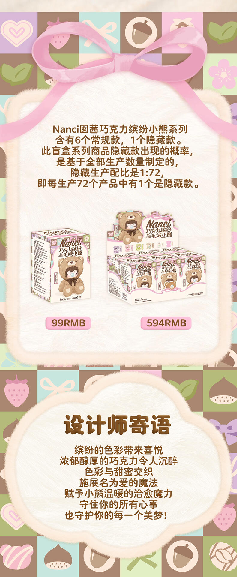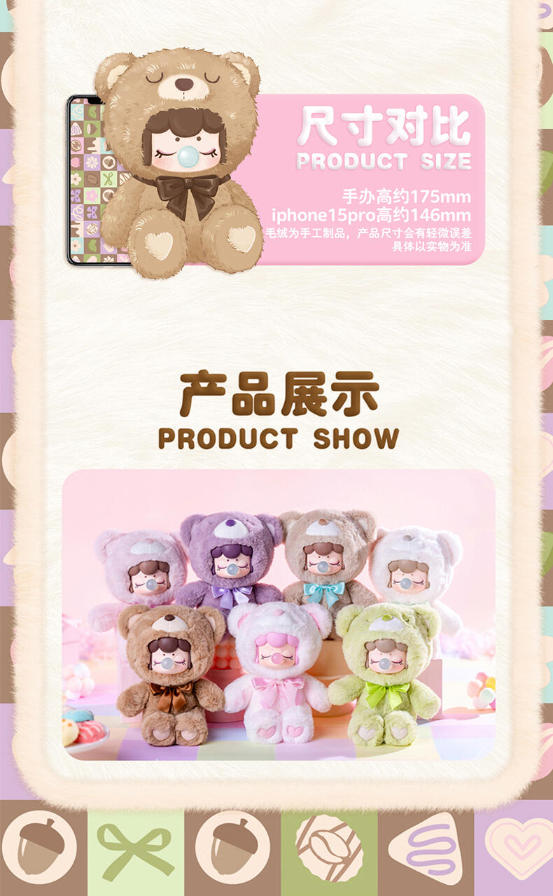 1.主题:囡茜巧克力缤纷小熊 2.产品规格: 6+1(有6个常规款,1个隐藏款,隐藏生产配比是1:72) 3.卖点: 关键词:可爱,情绪价值 A.工艺的多样化,透明、焕彩、植绒、夜光等工艺的运用呈现“故事”效果;