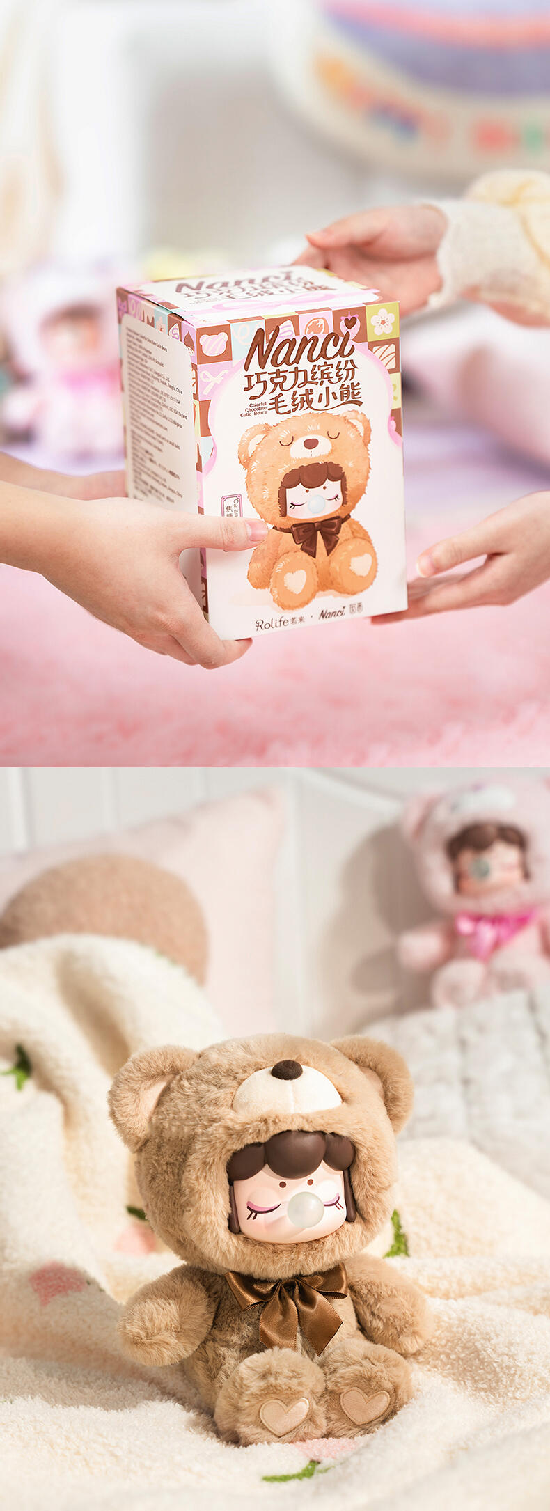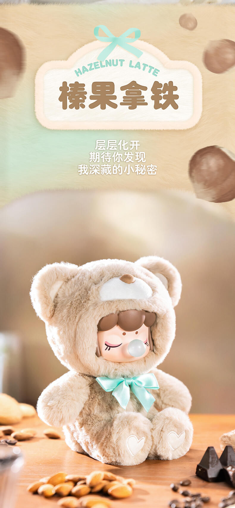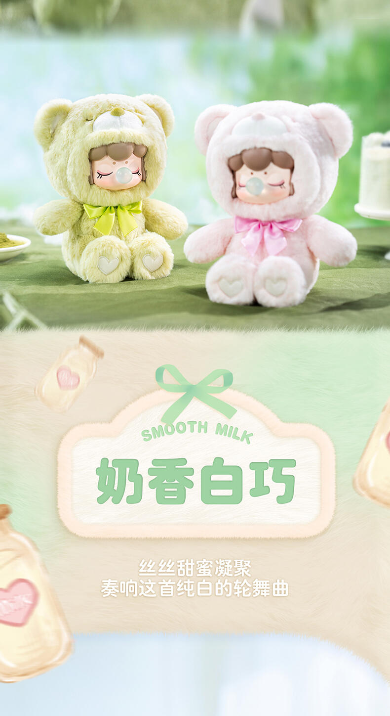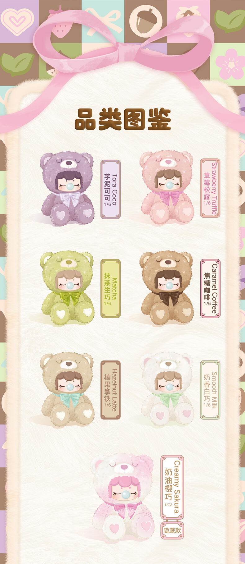 1.主题:囡茜巧克力缤纷小熊 2.产品规格: 6+1(有6个常规款,1个隐藏款,隐藏生产配比是1:72) 3.卖点: 关键词:可爱,情绪价值 A.工艺的多样化,透明、焕彩、植绒、夜光等工艺的运用呈现“故事”效果;