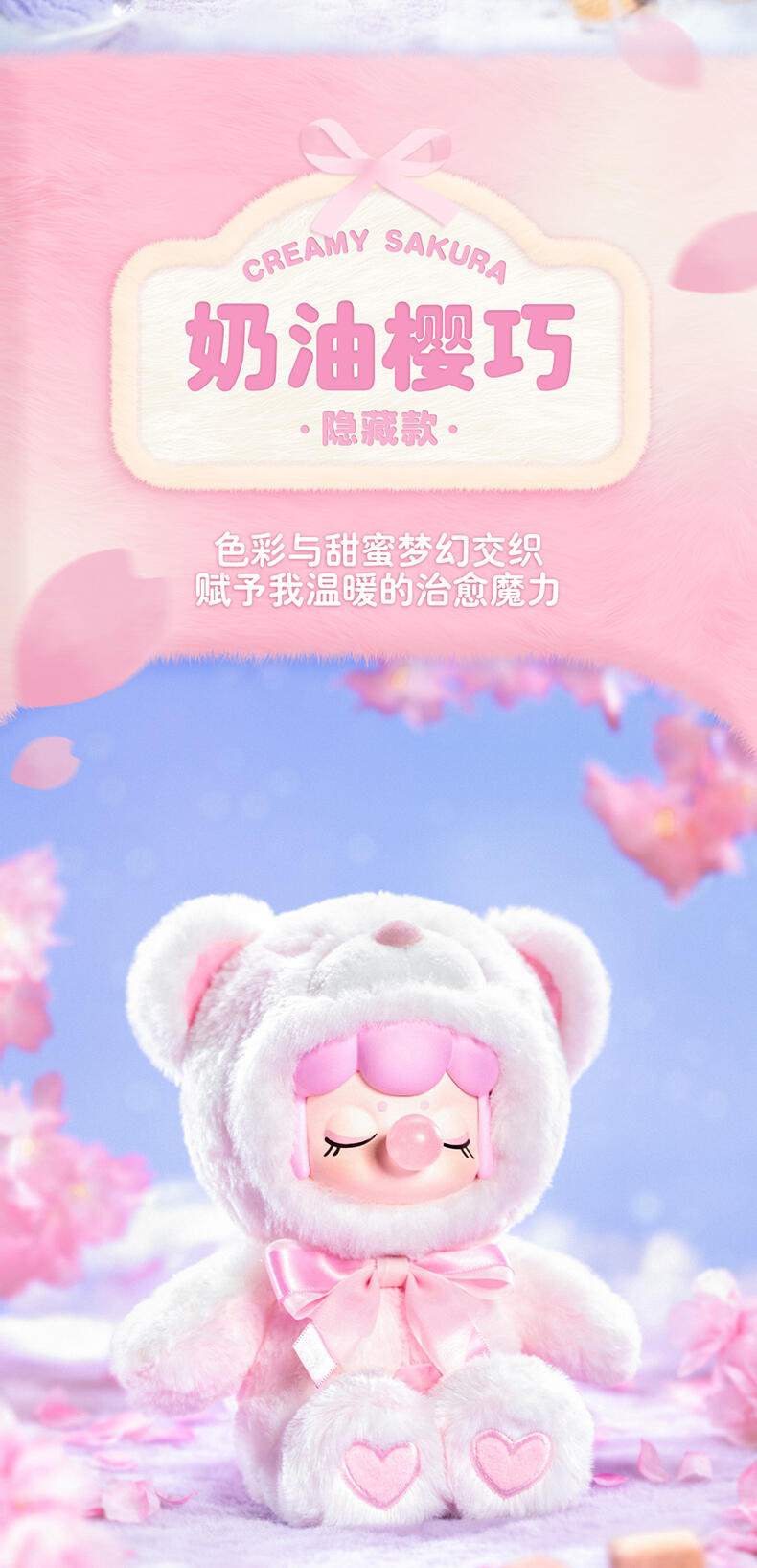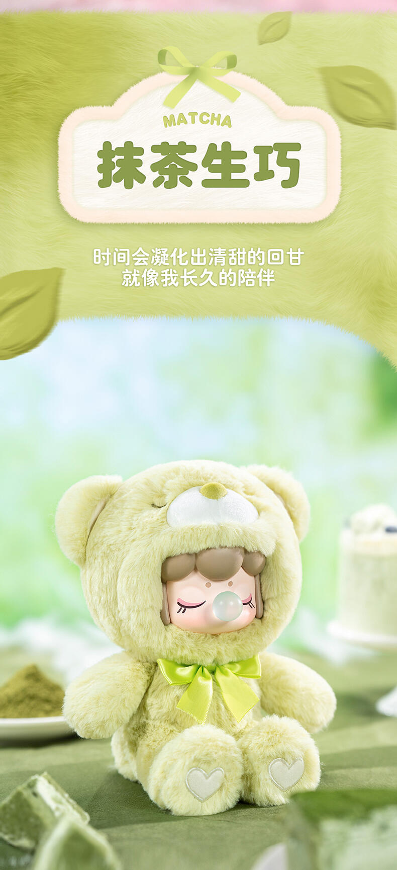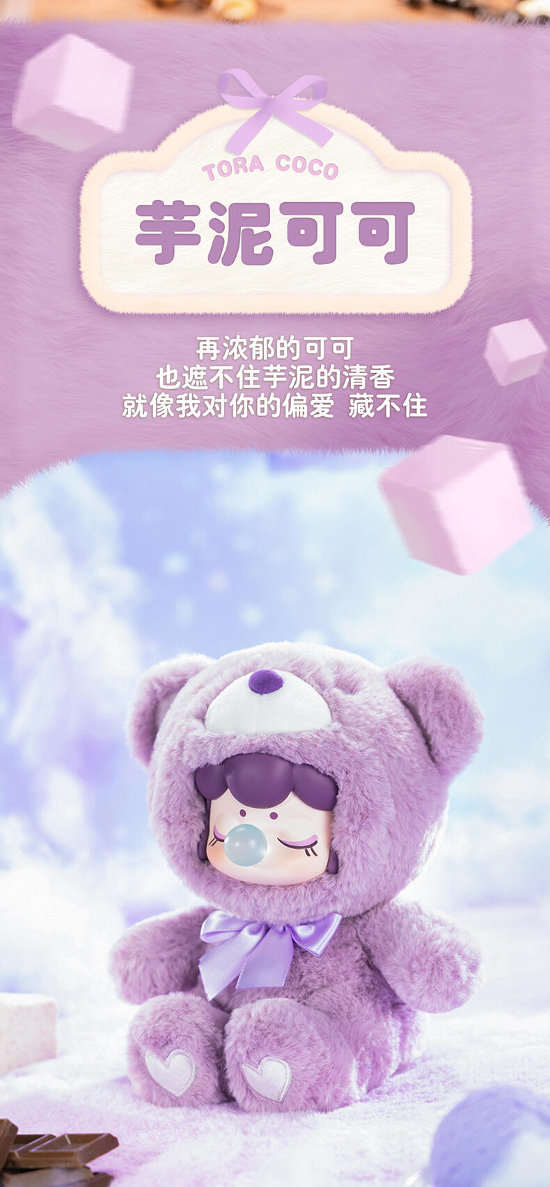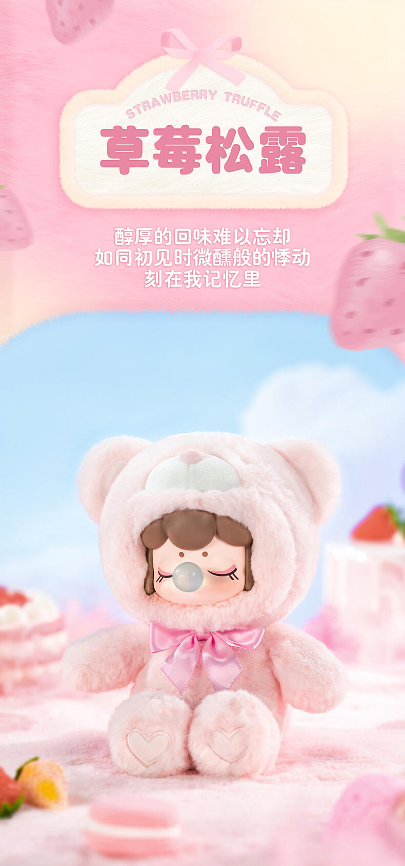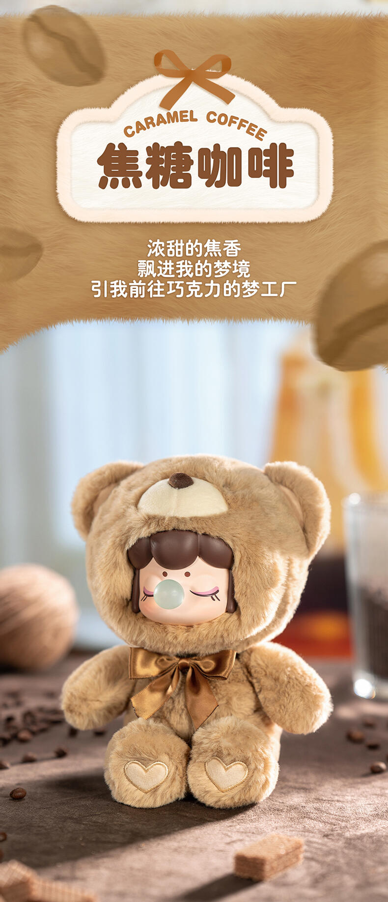 1.主题:囡茜巧克力缤纷小熊 2.产品规格: 6+1(有6个常规款,1个隐藏款,隐藏生产配比是1:72) 3.卖点: 关键词:可爱,情绪价值 A.工艺的多样化,透明、焕彩、植绒、夜光等工艺的运用呈现“故事”效果;