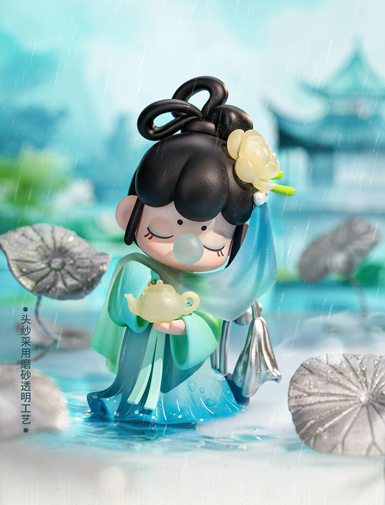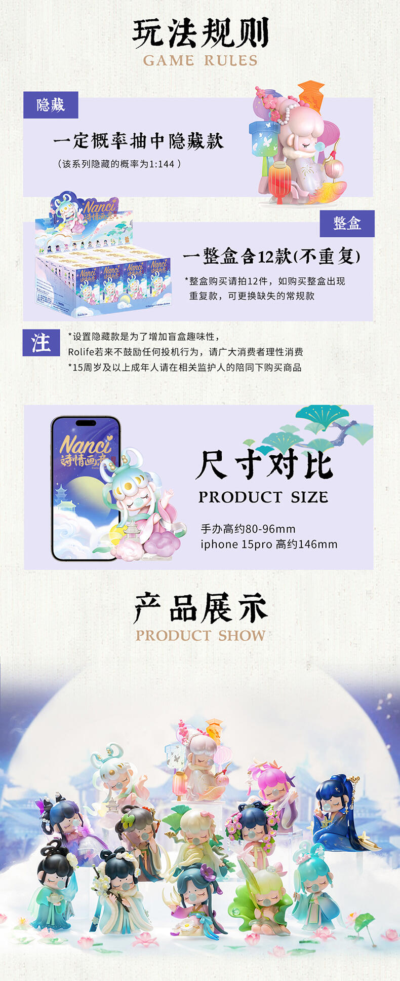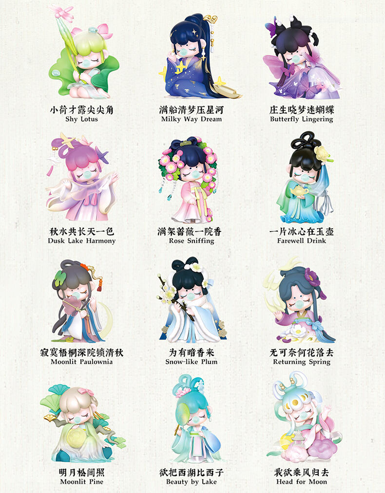 1.主题:诗词歌赋二代 2.产品规格: 12+1(有12个常规款,1个隐藏款,隐藏生产配比是1:144) 3.卖点: 关键词:诗词,古风 S.放大对古诗情节的幻想,将古诗与现代IP人物进行结合使Nanci形象不断深化; A.工艺的多样化,透明、焕彩、植绒、夜光等工艺的运用呈现“故事”效果; B.此系列有代表抒情叙事的名人诗句,古风情节十足。