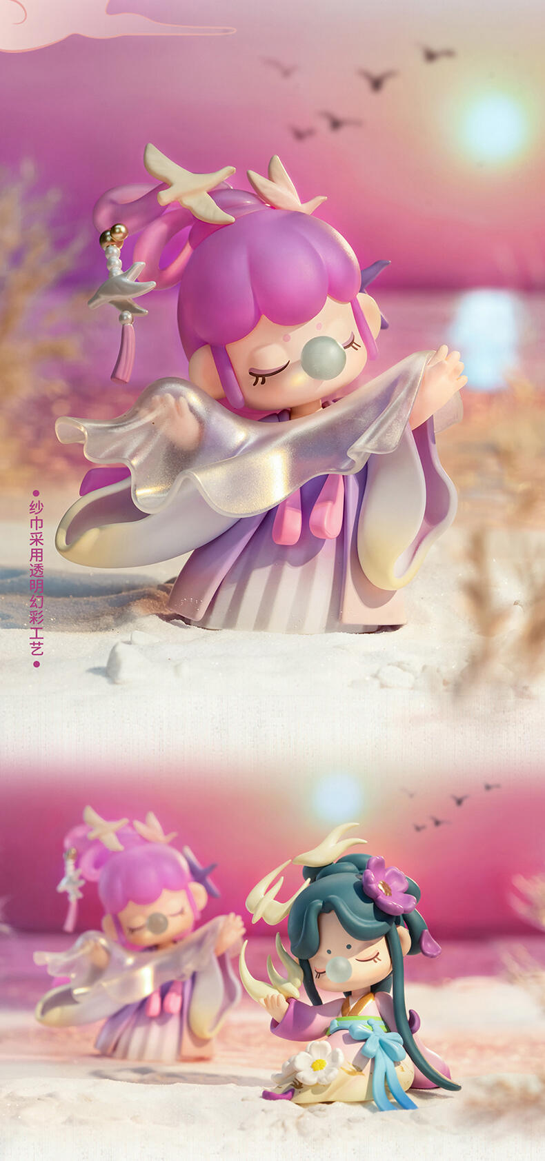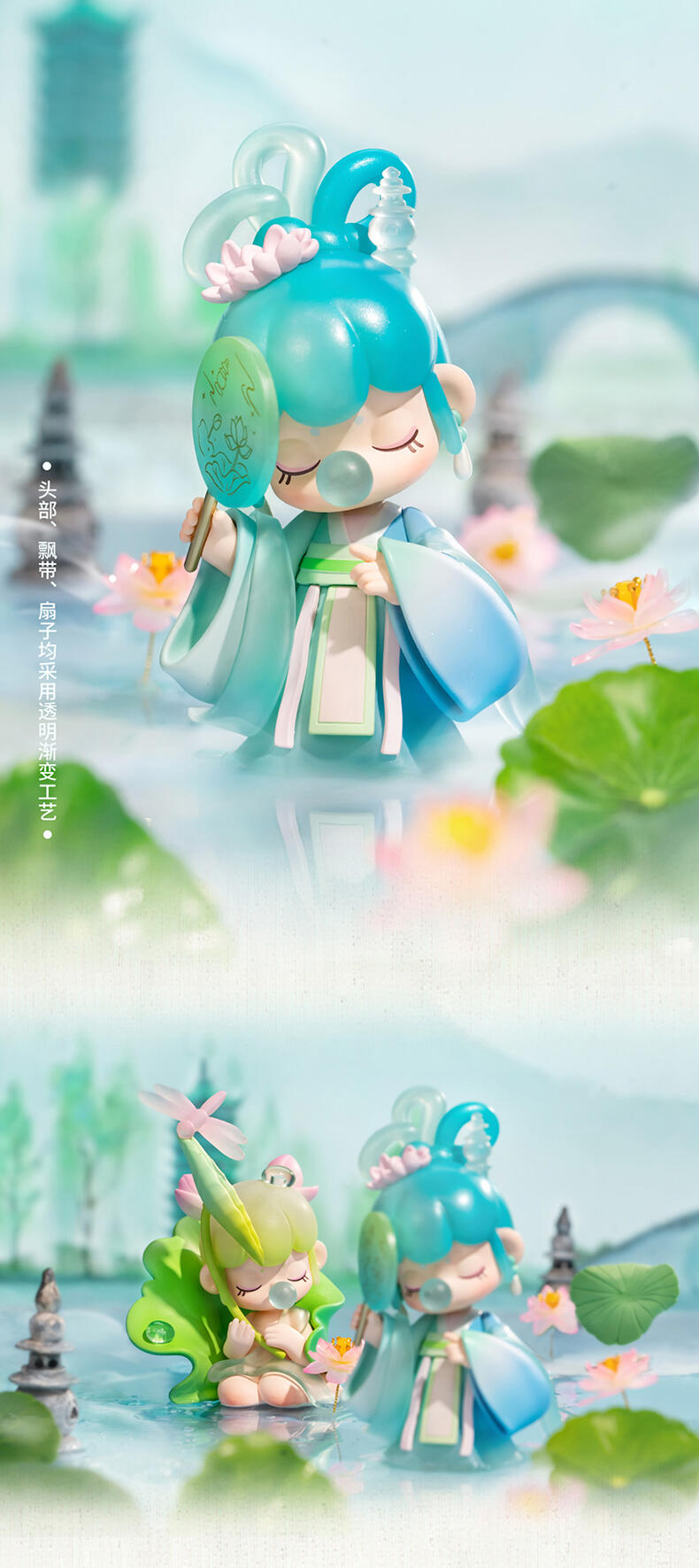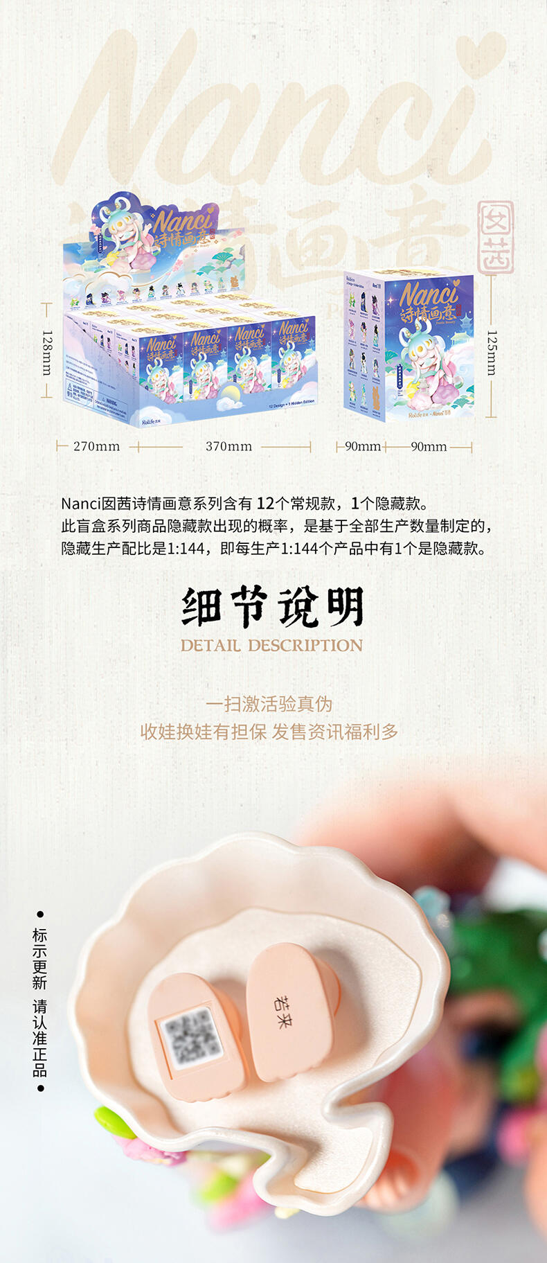 1.主题:诗词歌赋二代 2.产品规格: 12+1(有12个常规款,1个隐藏款,隐藏生产配比是1:144) 3.卖点: 关键词:诗词,古风 S.放大对古诗情节的幻想,将古诗与现代IP人物进行结合使Nanci形象不断深化; A.工艺的多样化,透明、焕彩、植绒、夜光等工艺的运用呈现“故事”效果; B.此系列有代表抒情叙事的名人诗句,古风情节十足。
