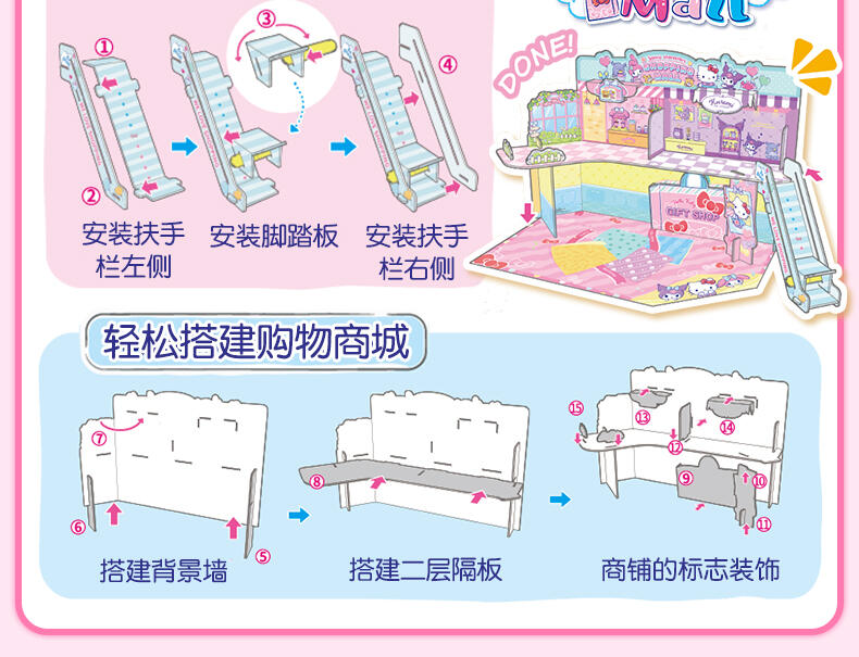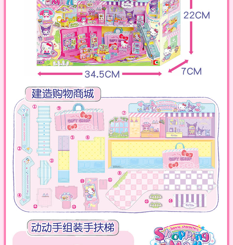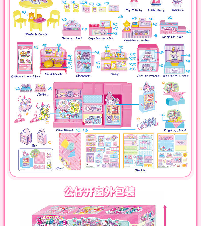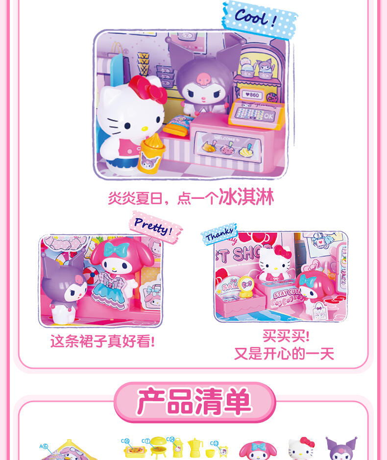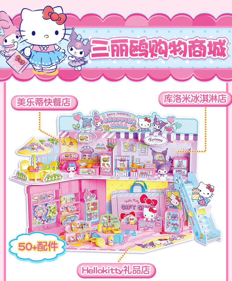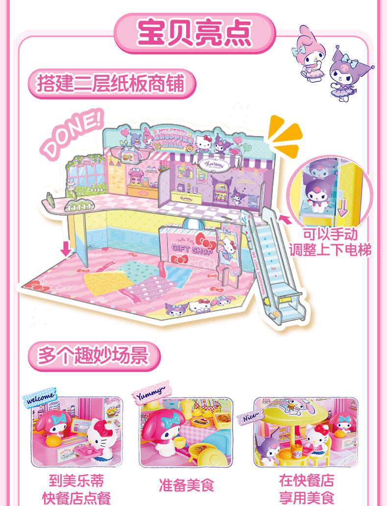 由3个三丽鸥明星IP经营着三间不同主题的餐厅和购物点,分别为二楼的美乐蒂快餐店和酷洛迷冰淇淋店,以及一楼的凯蒂猫服饰礼品店。扶手电梯可手动升降!另加配有三个公仔,从包装开窗能看到。