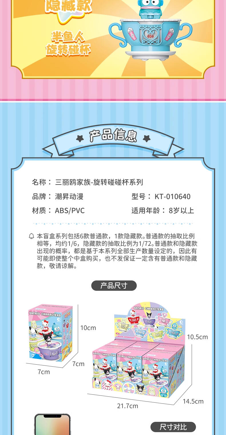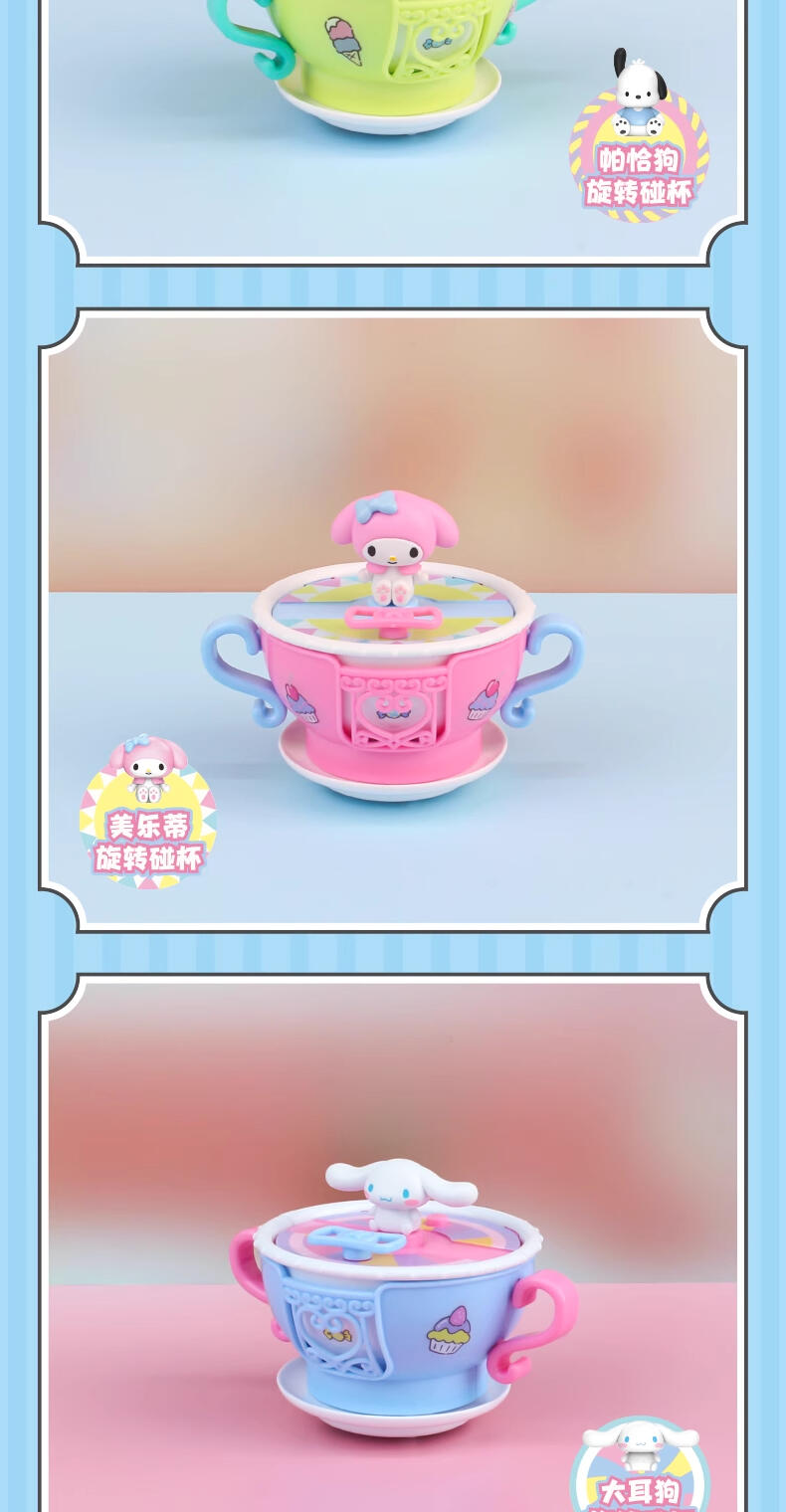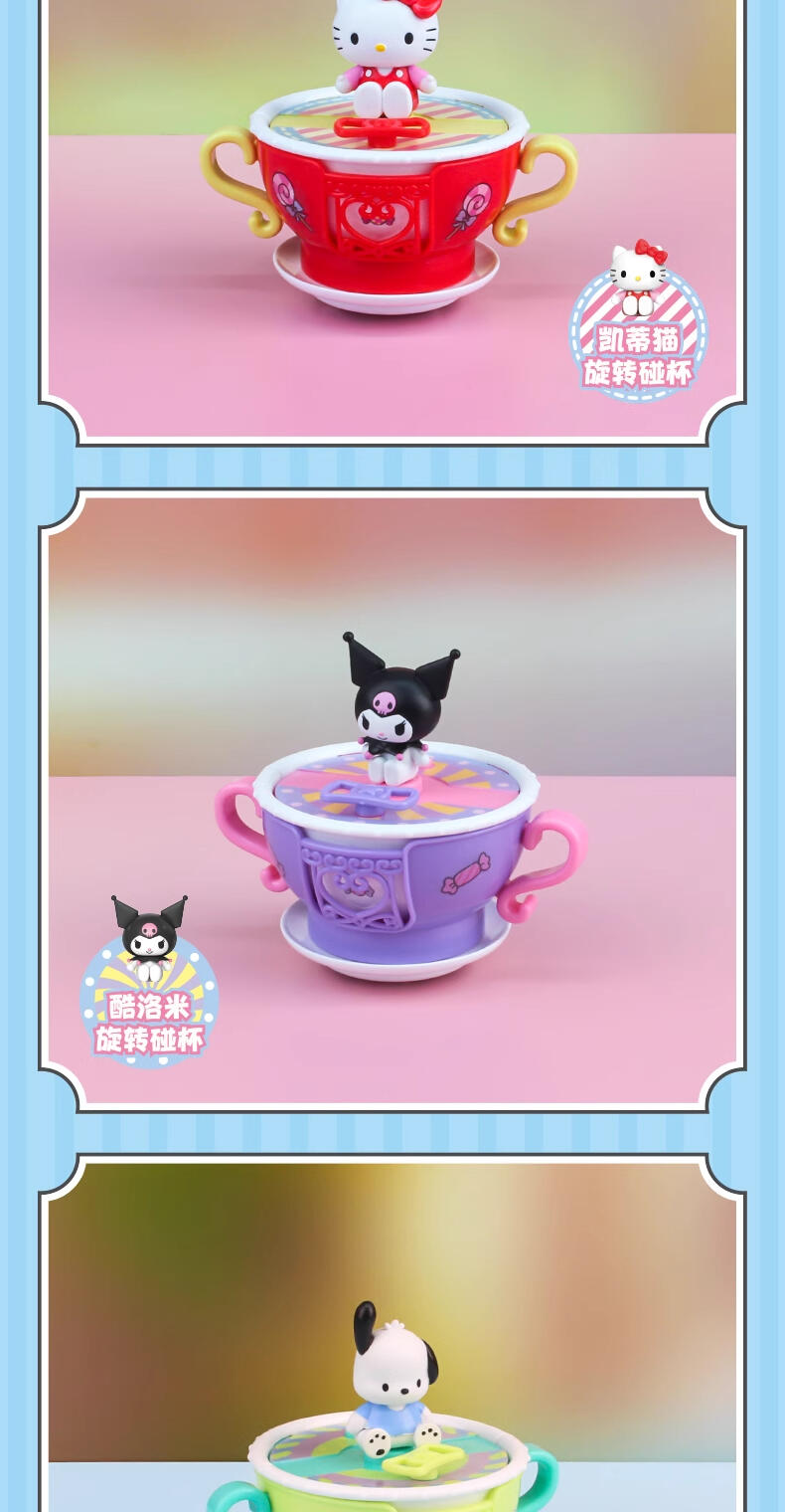 以乐园转转杯为主题,玩法多样,反向扭转杯身和车座,置放于桌面或平面地方,杯子可自行旋转移动,可玩性强,六款不同的三丽鸥形象,外加丑鱼隐藏款,满足小朋友和大人的不同喜好。