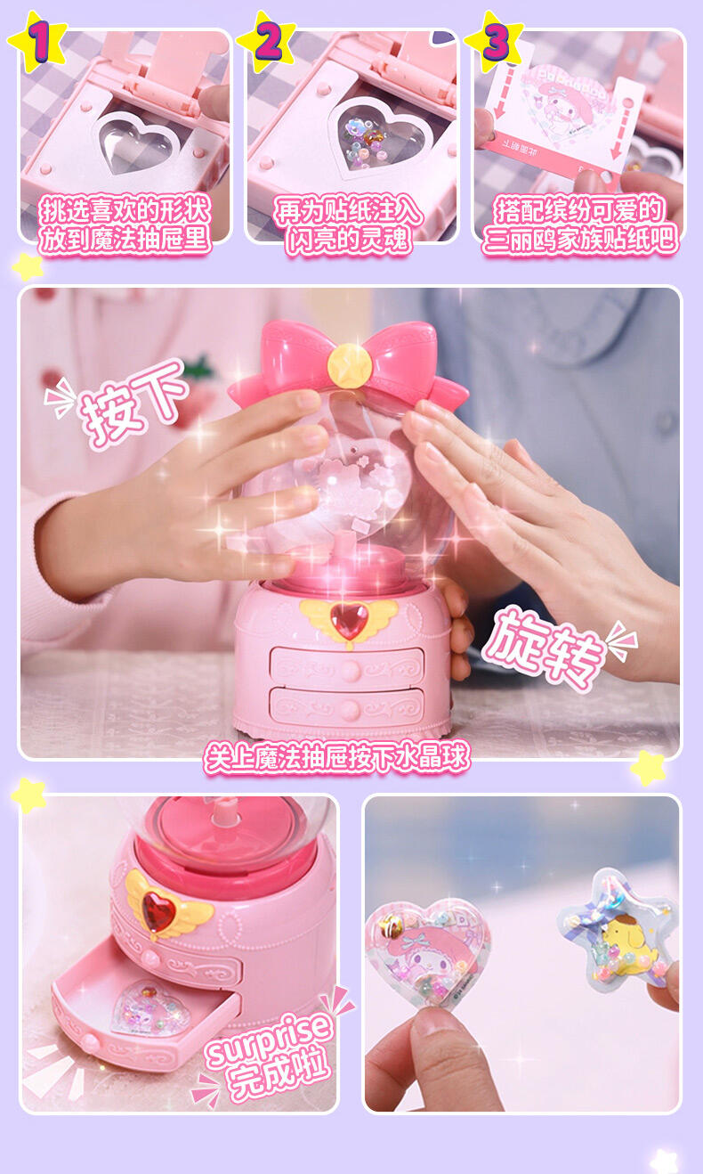 4、按下水晶球,水晶球内的魔法卡片会旋转,下层抽屉自动打开,美丽的三丽鸥立体贴纸就制作完成啦!