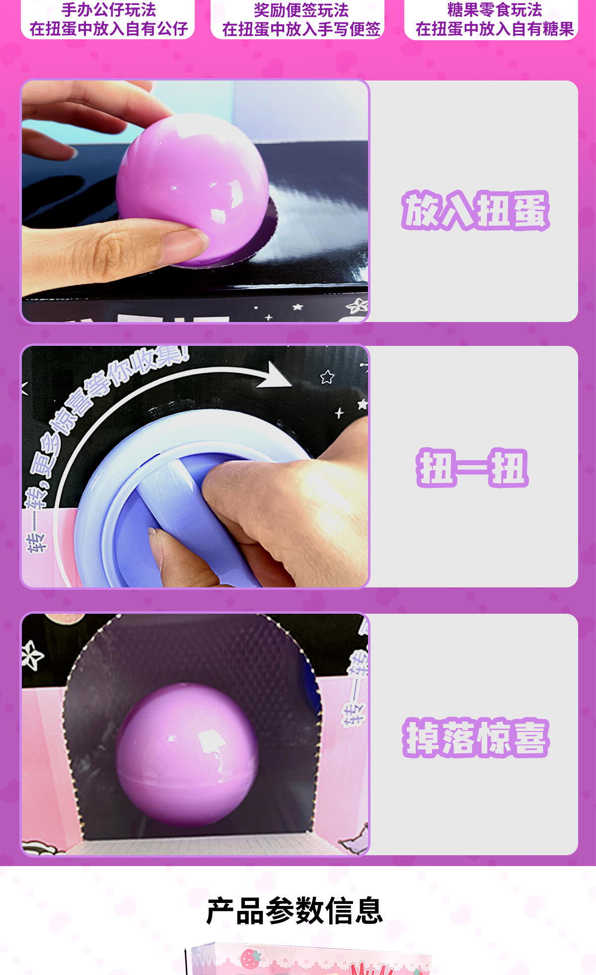 正版授权 新奇趣味扭蛋机 可玩可DIY 独有侧边开口盒,内含丰富DIY材料包,开启创意DIY.内含6颗扭蛋,20+DIY配件,趣味扭蛋、DIY甜品,启发动手创意……扭蛋机亦可循环使用,放入手版公仔、手写便签、自制盲盒,一起解锁更多玩法