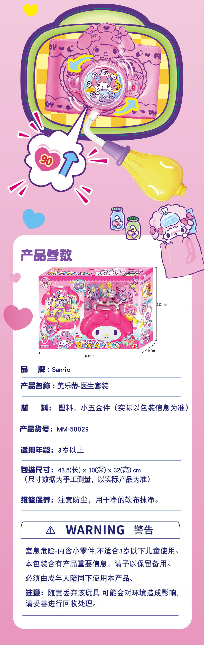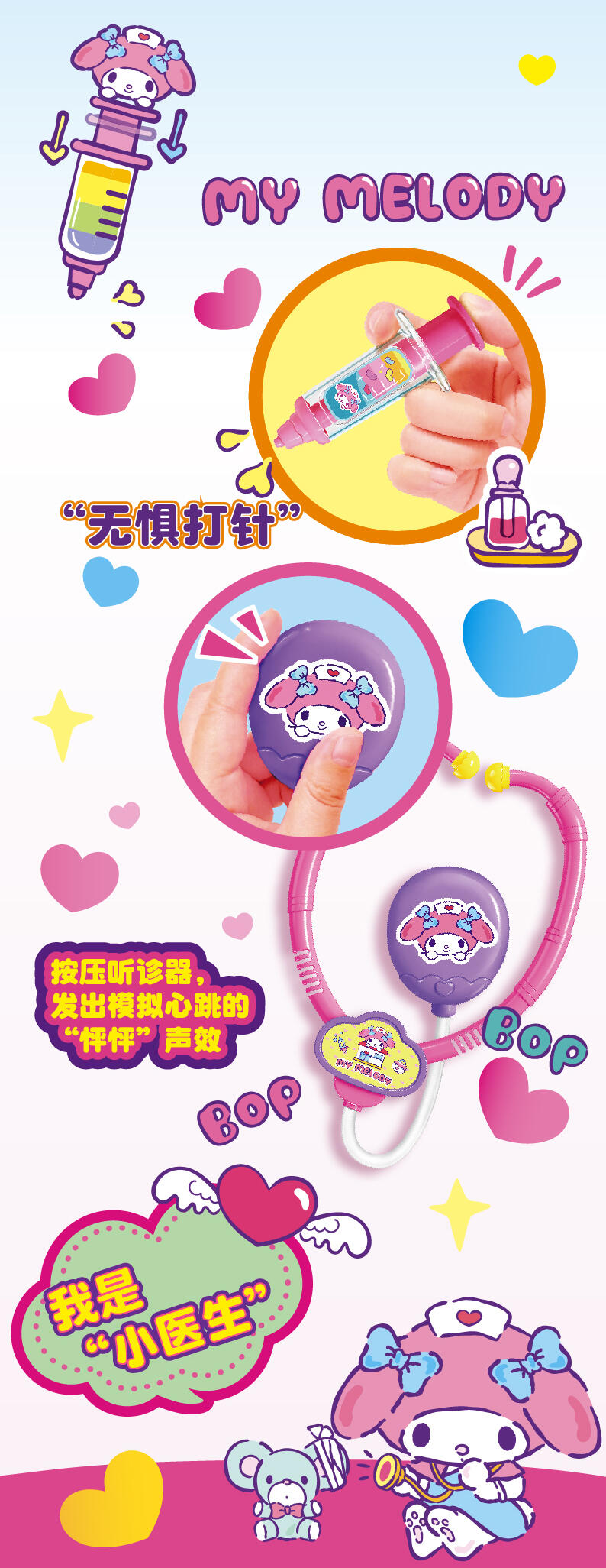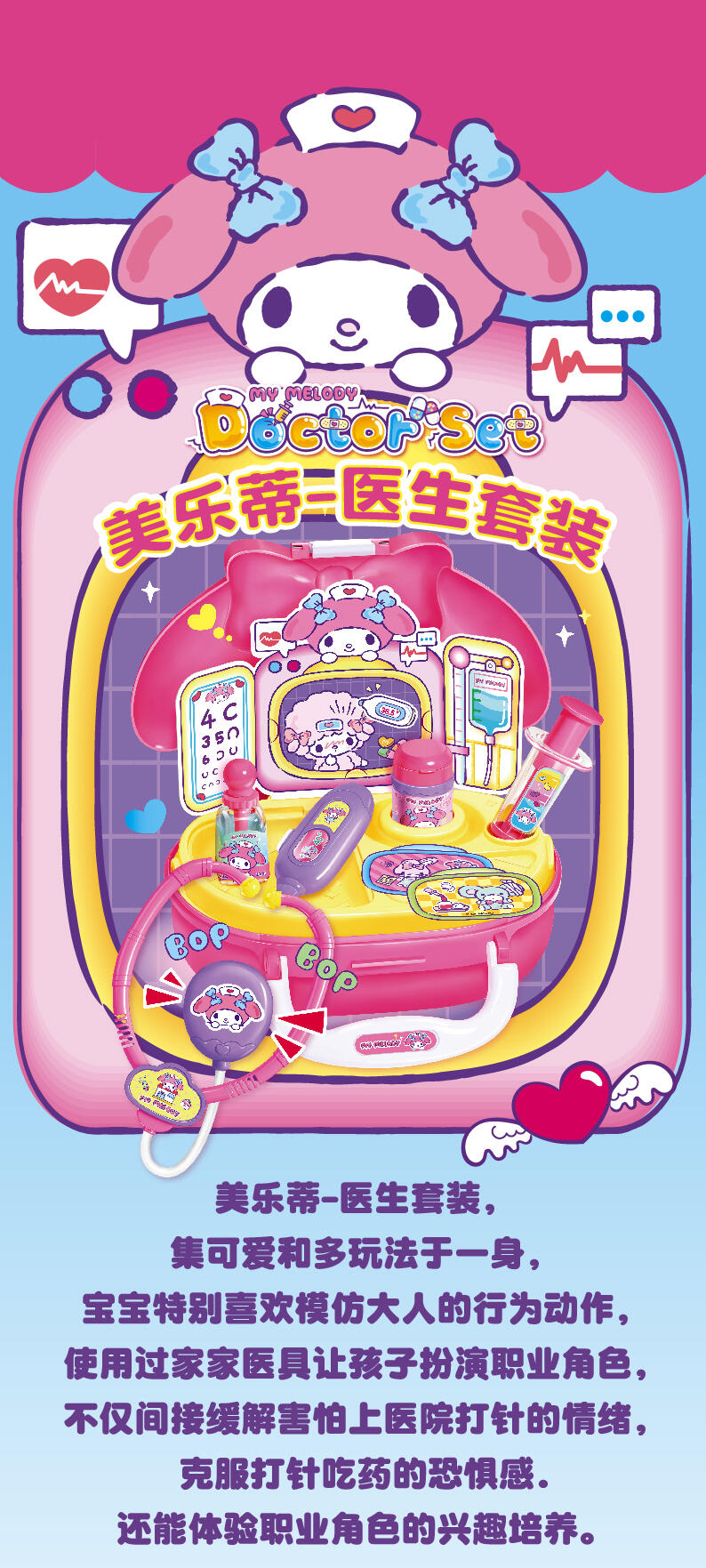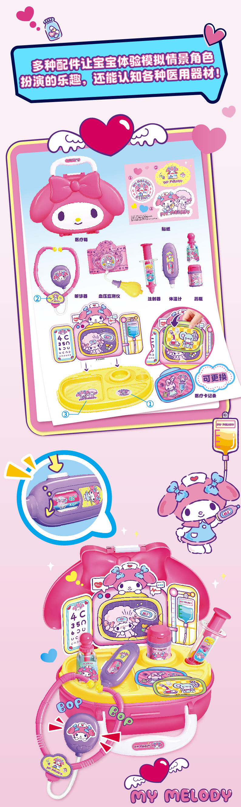 温柔的美乐蒂医生,试着扮演一名医生。拿起听诊器,耳温枪,打针筒,帮助身边的人快点好起来。
