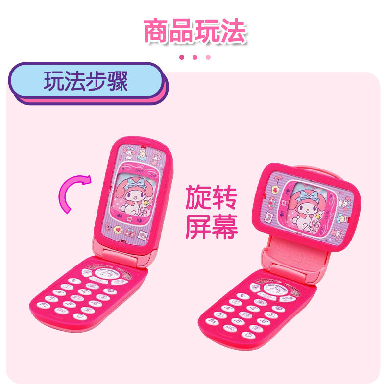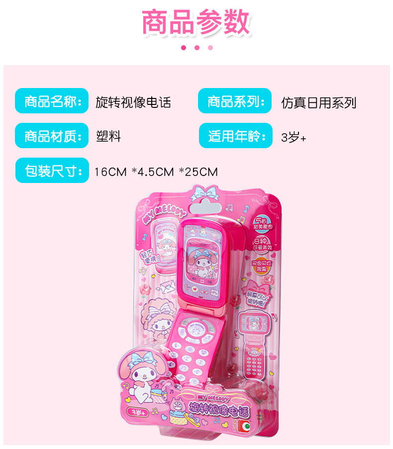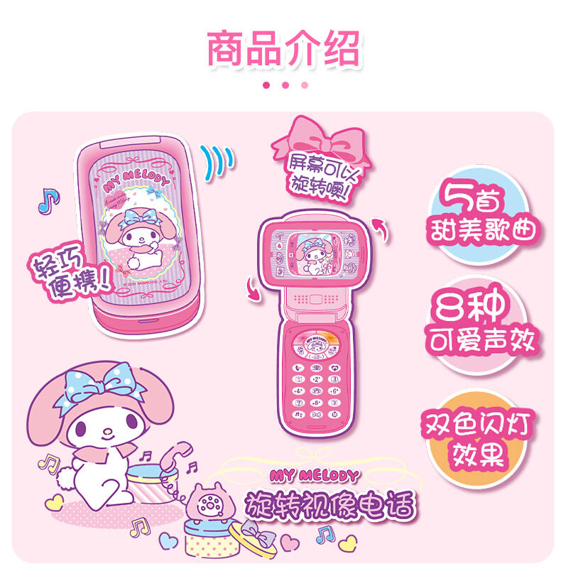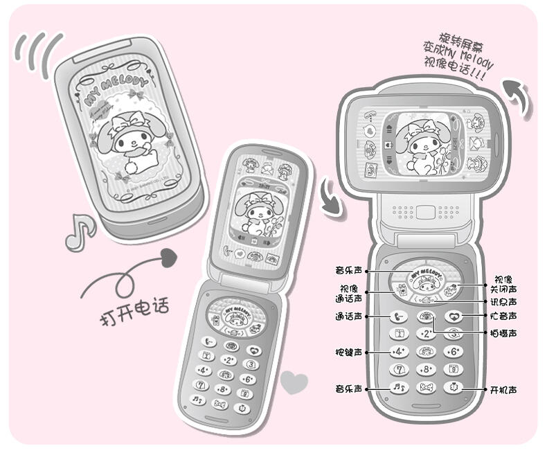全新三丽鸥明星人物——My Melody,以及她的好搭档Kuromi的旋转视像电话,丰富有趣的各款音效,如开机声、信息声、拍摄声、视像通话声、忙音声等。转动屏幕,语音电话可变为视像电话!