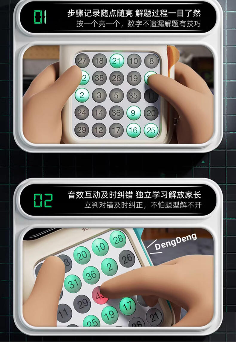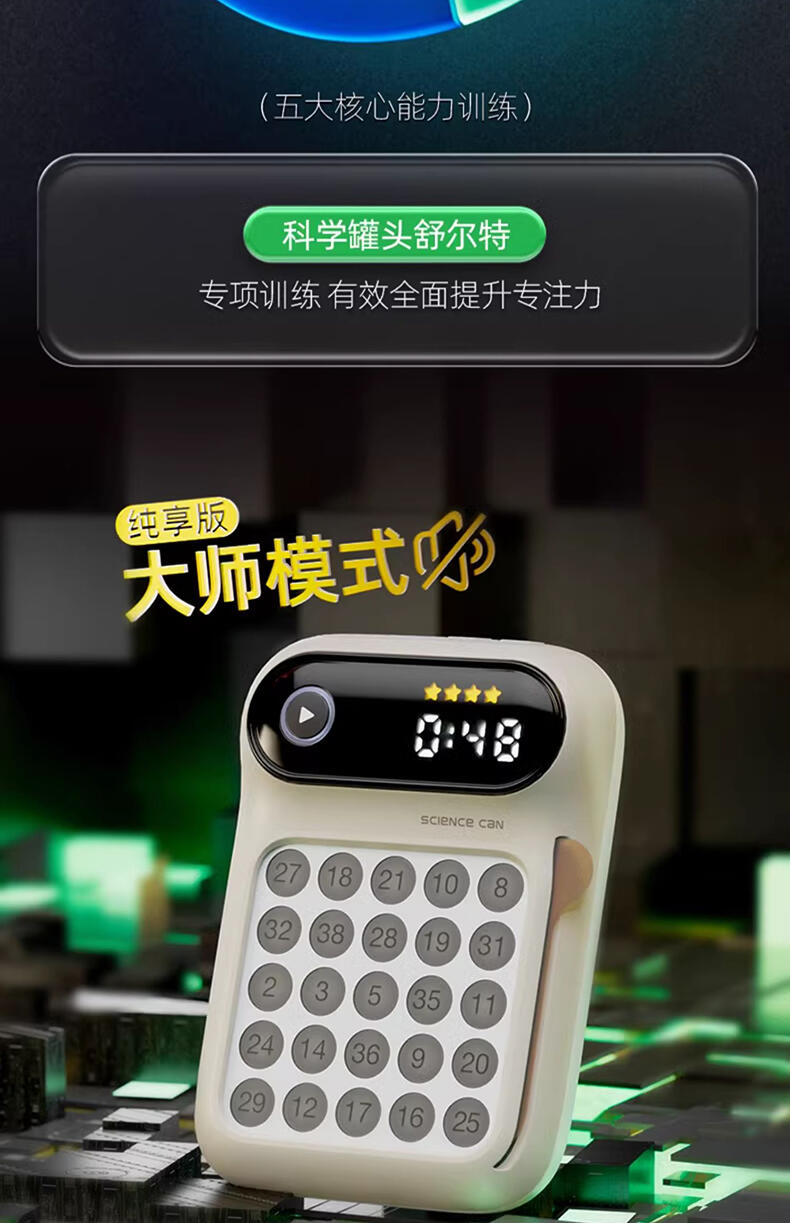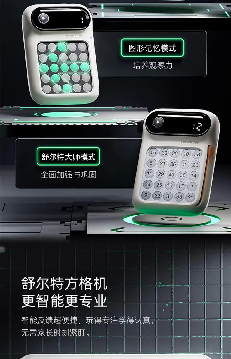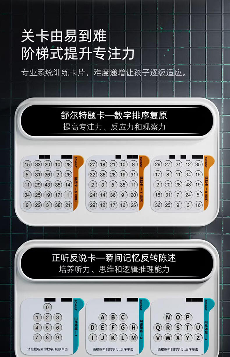 舒尔特方格是一款专为3-12岁儿童提高专注力、记忆力、反应力的智能训练机,包含数字、图形、视听训练、古诗、汉字、字母、色彩、方向等,在规定的时间内快速点亮按键,用计时评分和难度进阶的方式,帮助孩子锻炼专注力、记忆力和观察力。