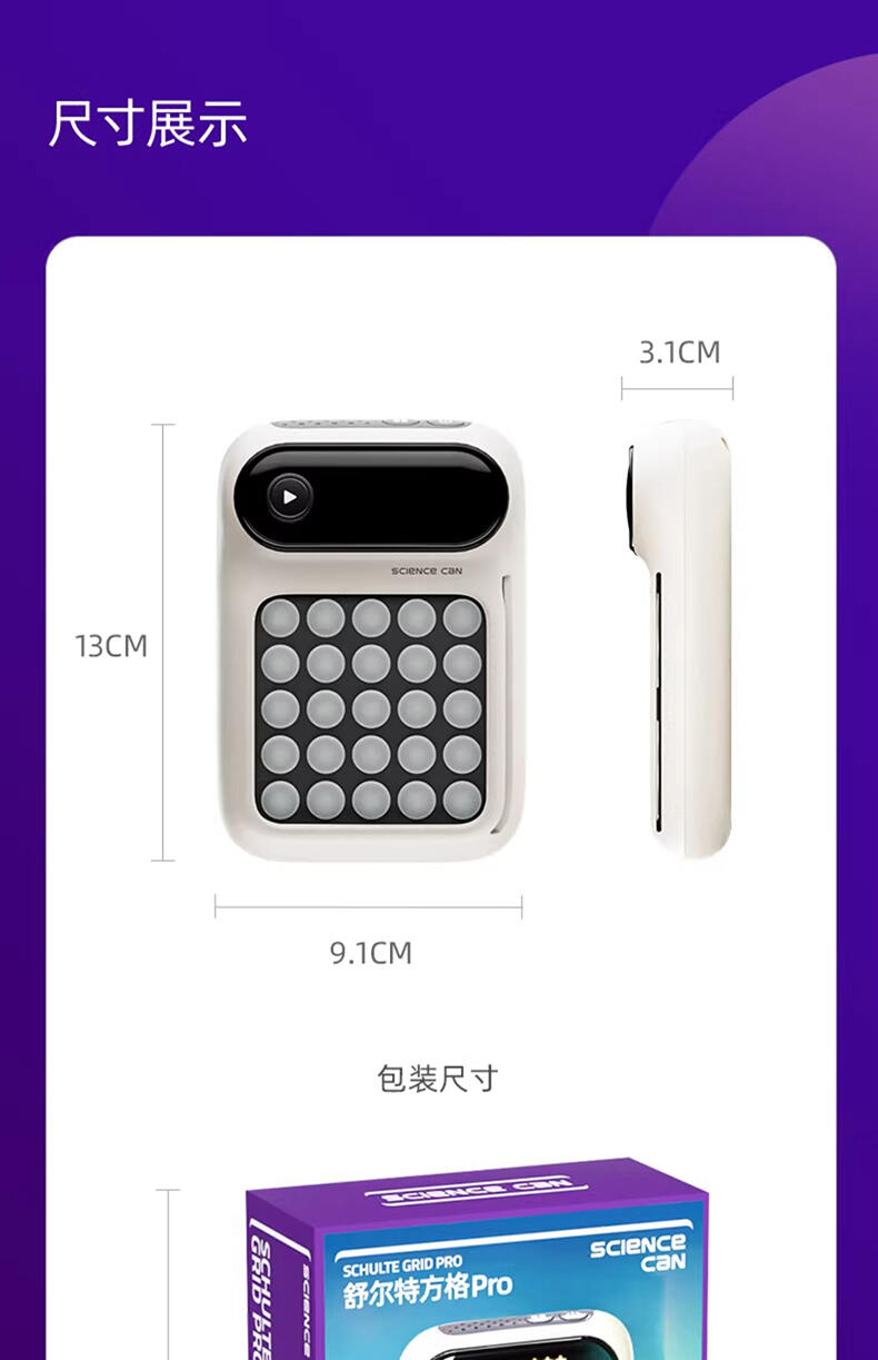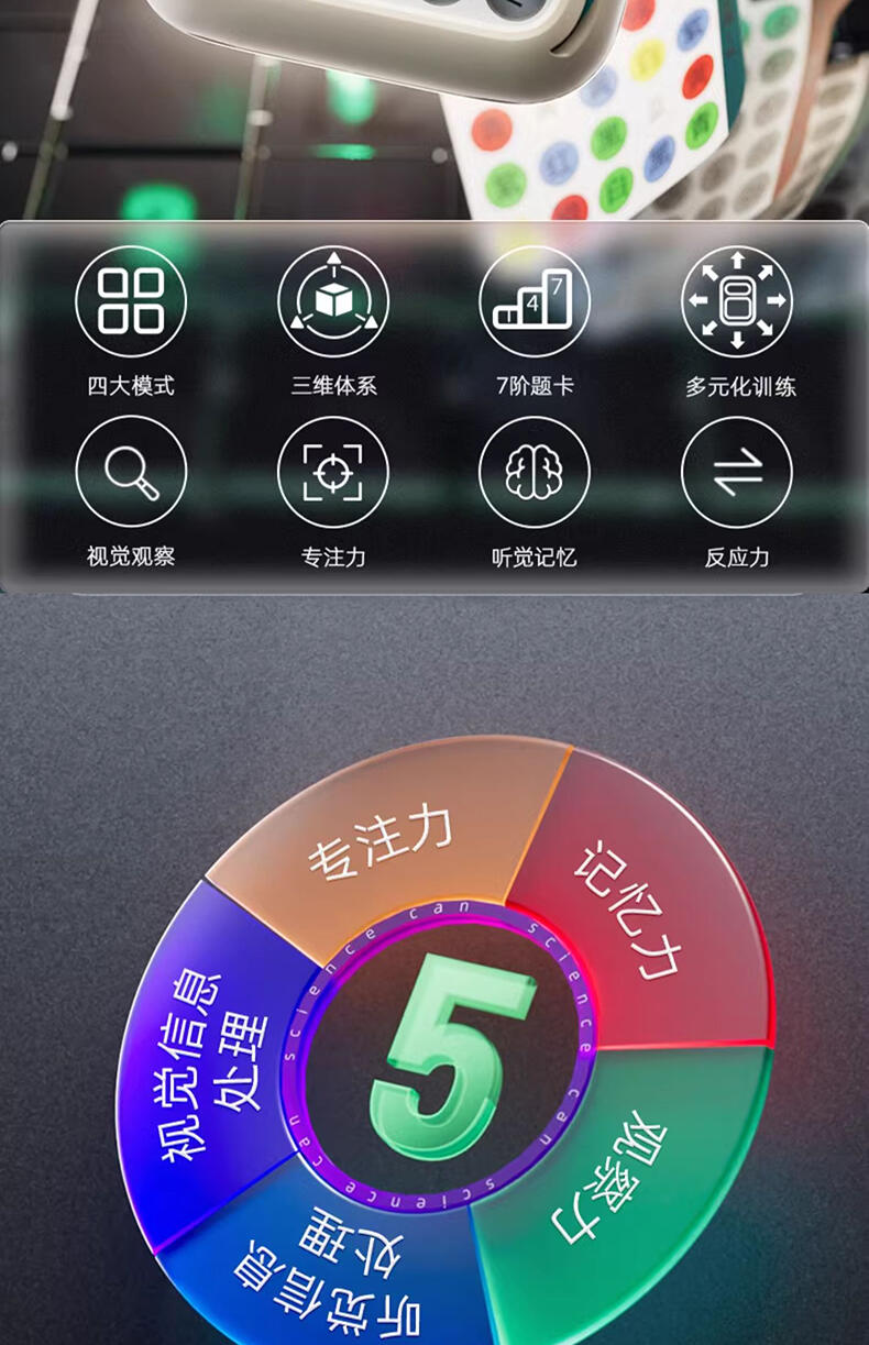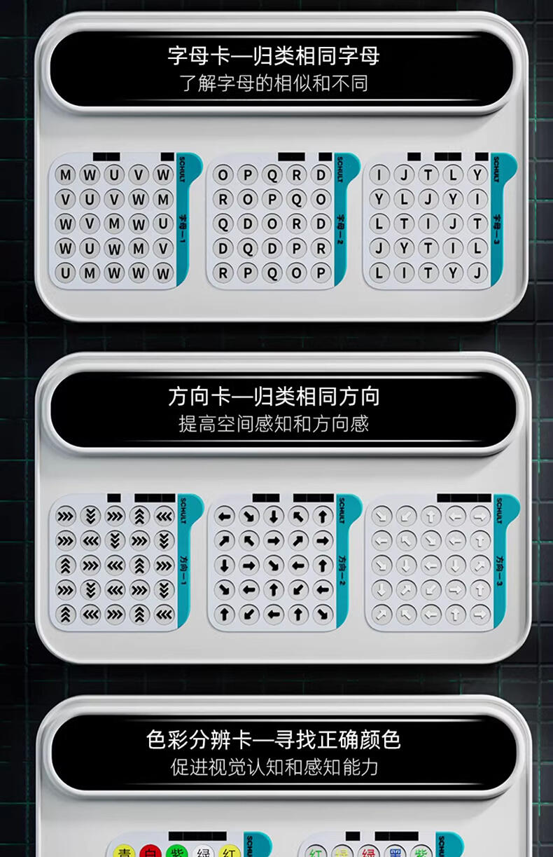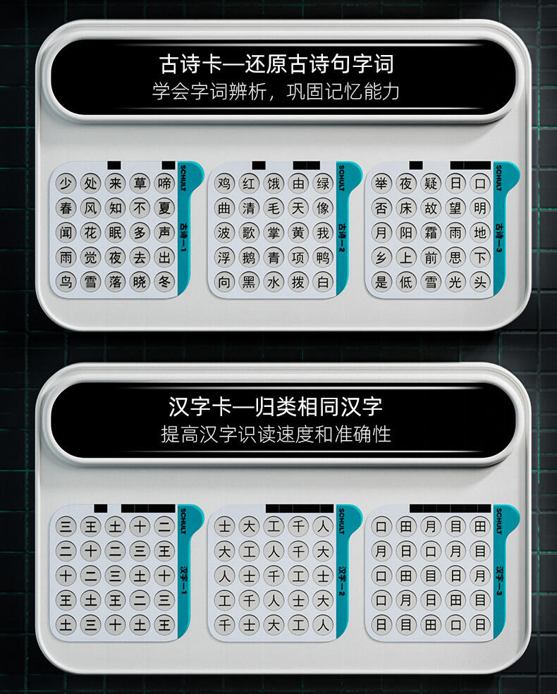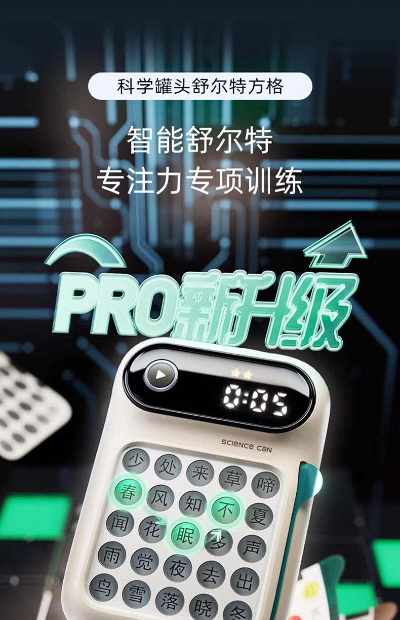 舒尔特方格是一款专为3-12岁儿童提高专注力、记忆力、反应力的智能训练机,包含数字、图形、视听训练、古诗、汉字、字母、色彩、方向等,在规定的时间内快速点亮按键,用计时评分和难度进阶的方式,帮助孩子锻炼专注力、记忆力和观察力。