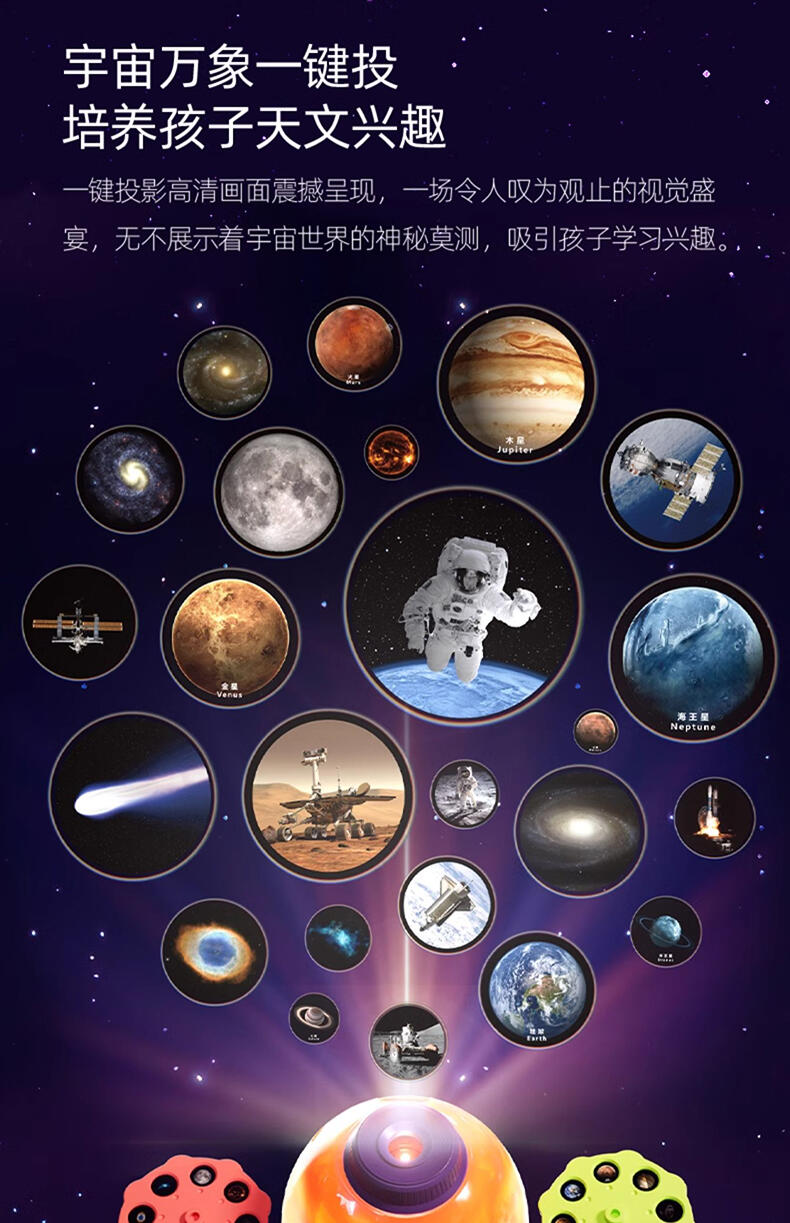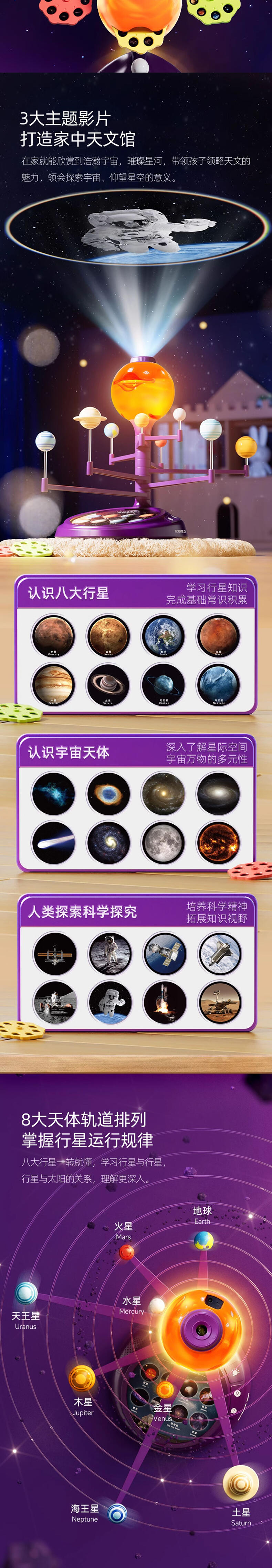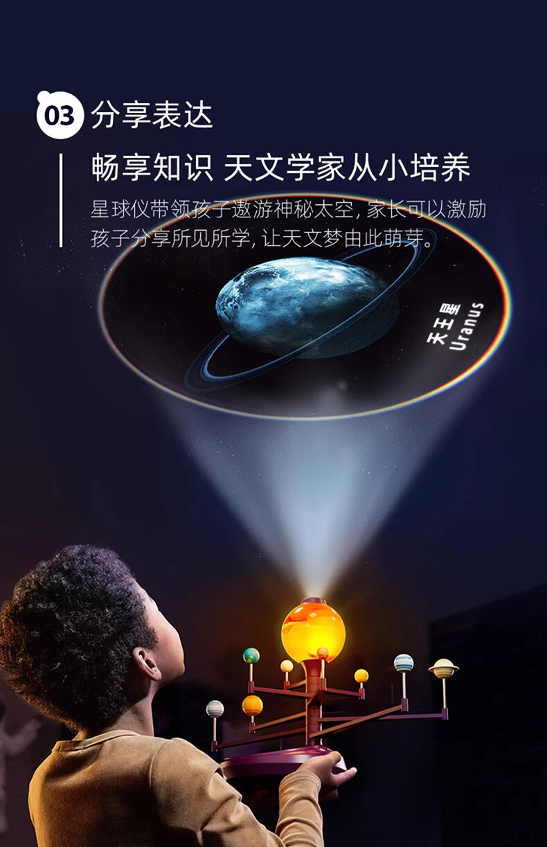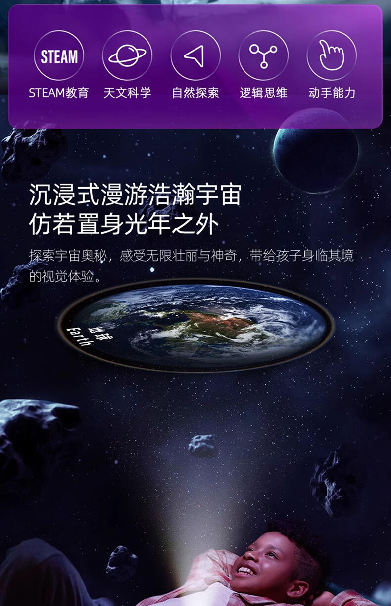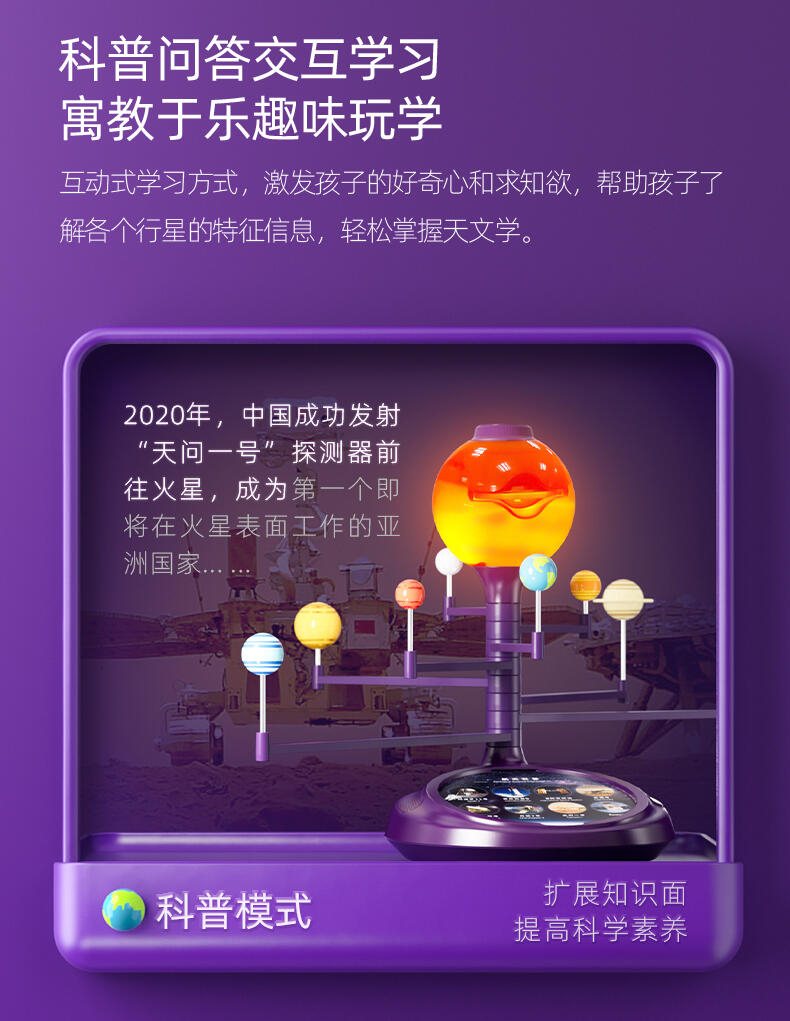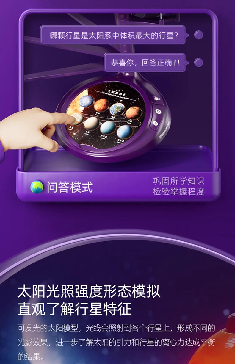 科普问答交互学习,寓教于乐趣味玩学;太阳光照强度形态模拟,直观了解行星特征;宇宙万象一键投,培养孩子天文兴趣;3大主题影片,培养孩子天文兴趣;8大天体轨道排列,掌握行星运行规律
