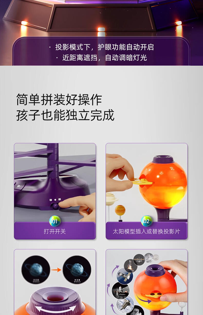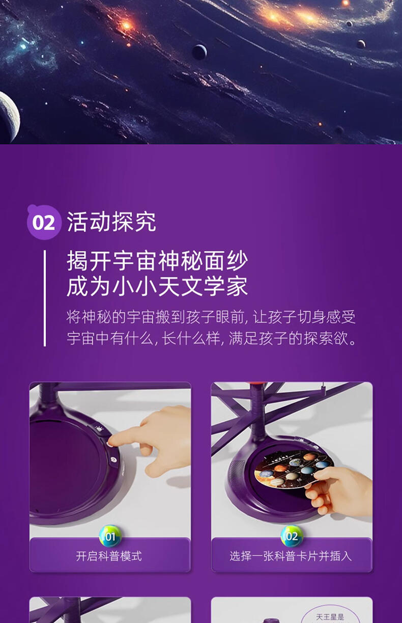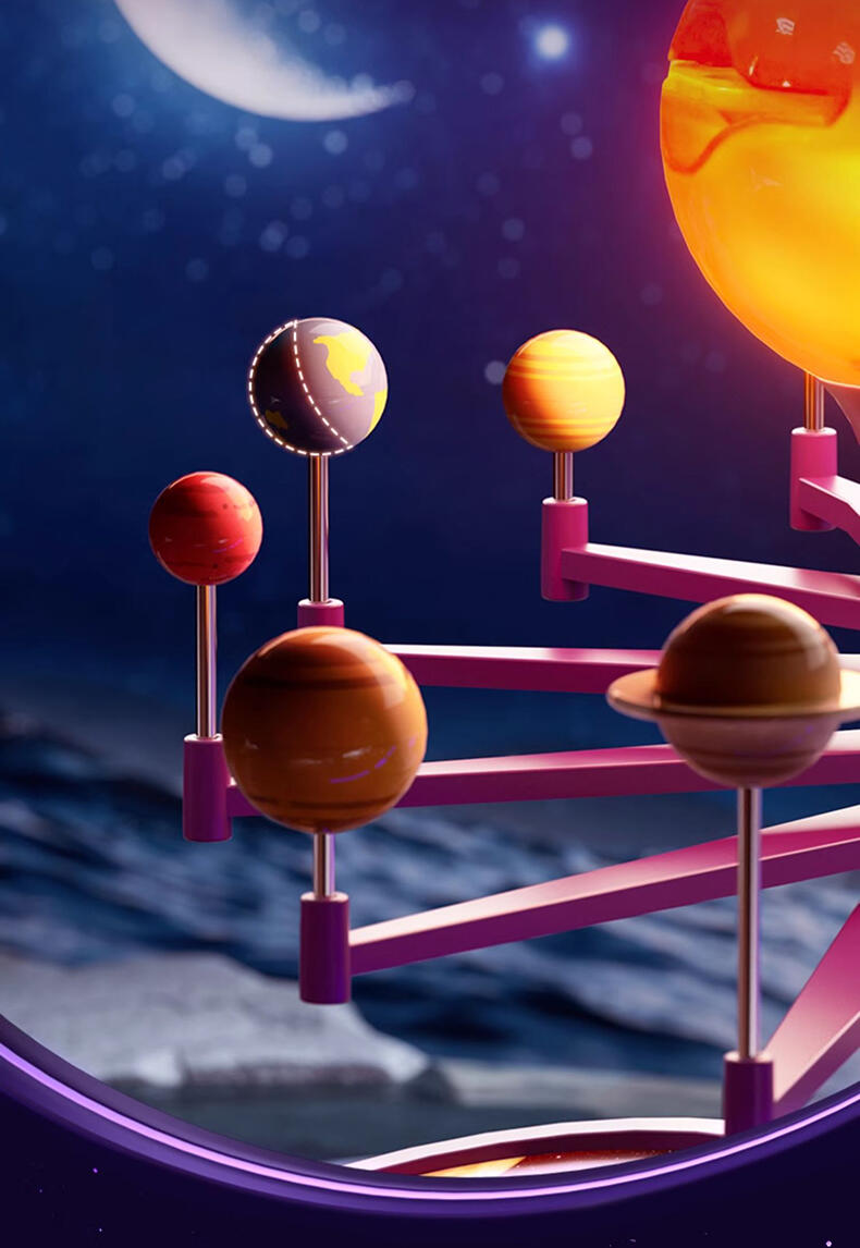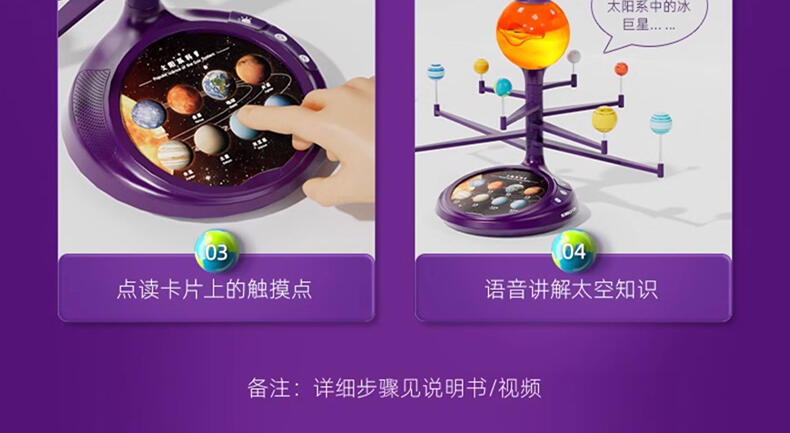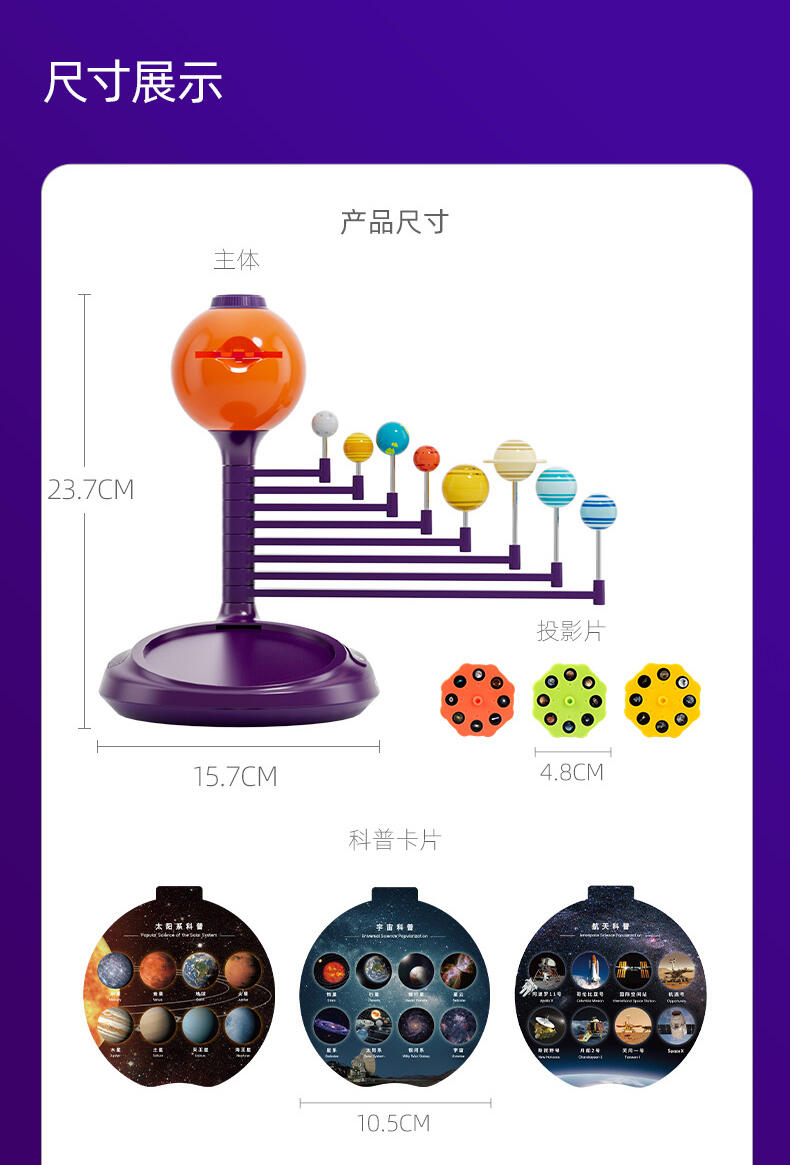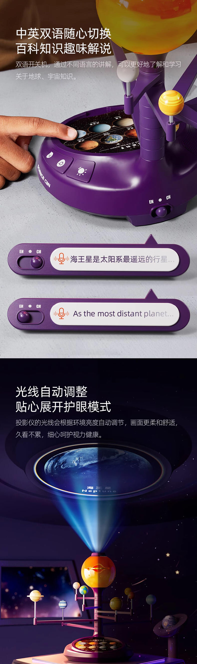 科普问答交互学习,寓教于乐趣味玩学;太阳光照强度形态模拟,直观了解行星特征;宇宙万象一键投,培养孩子天文兴趣;3大主题影片,培养孩子天文兴趣;8大天体轨道排列,掌握行星运行规律