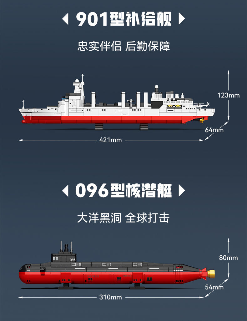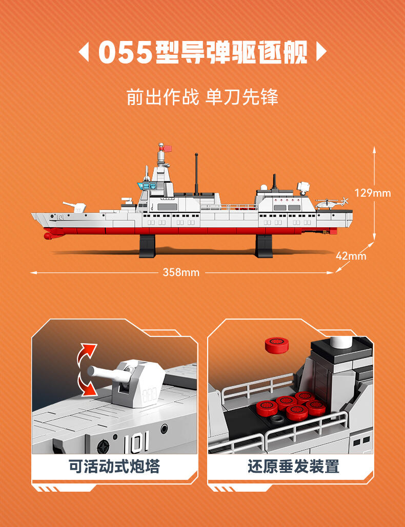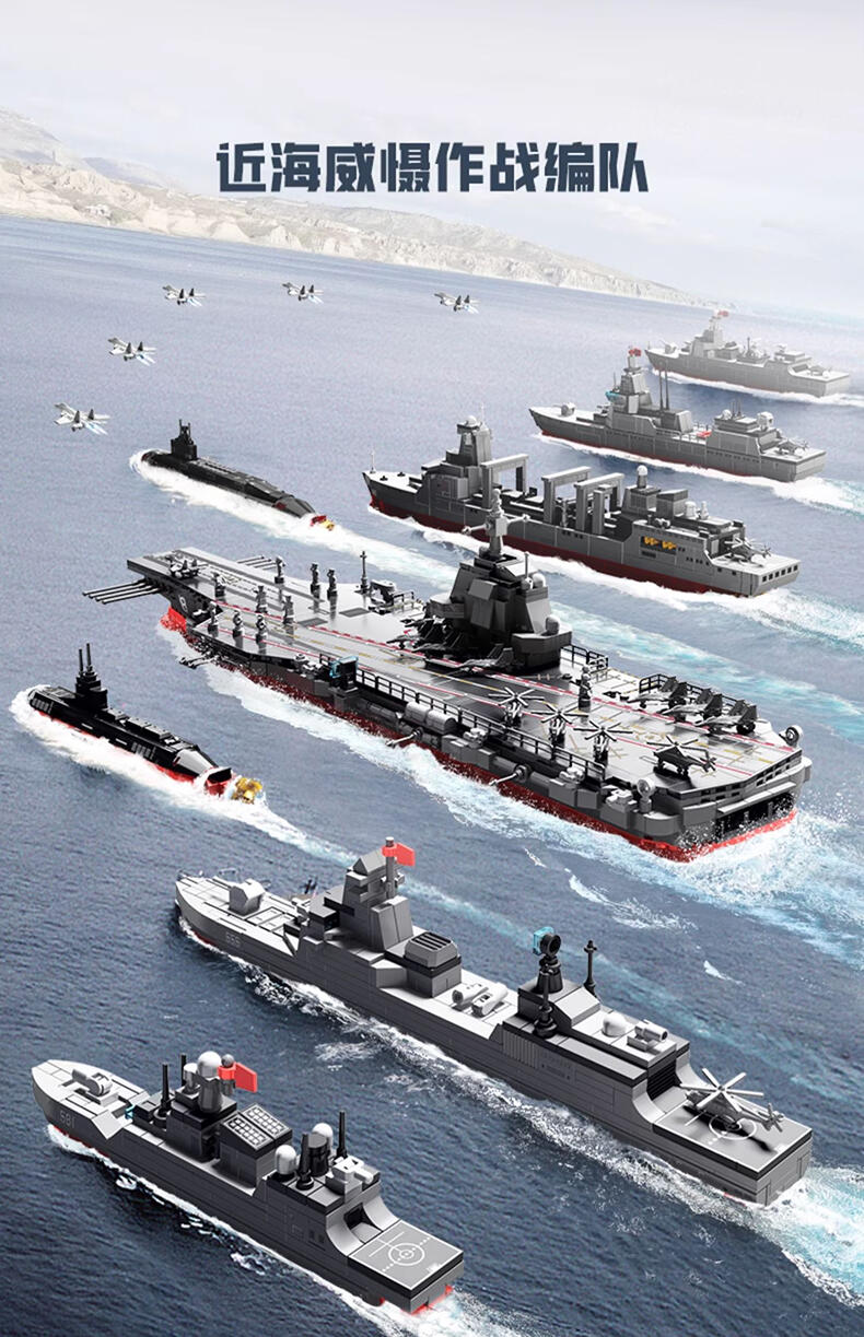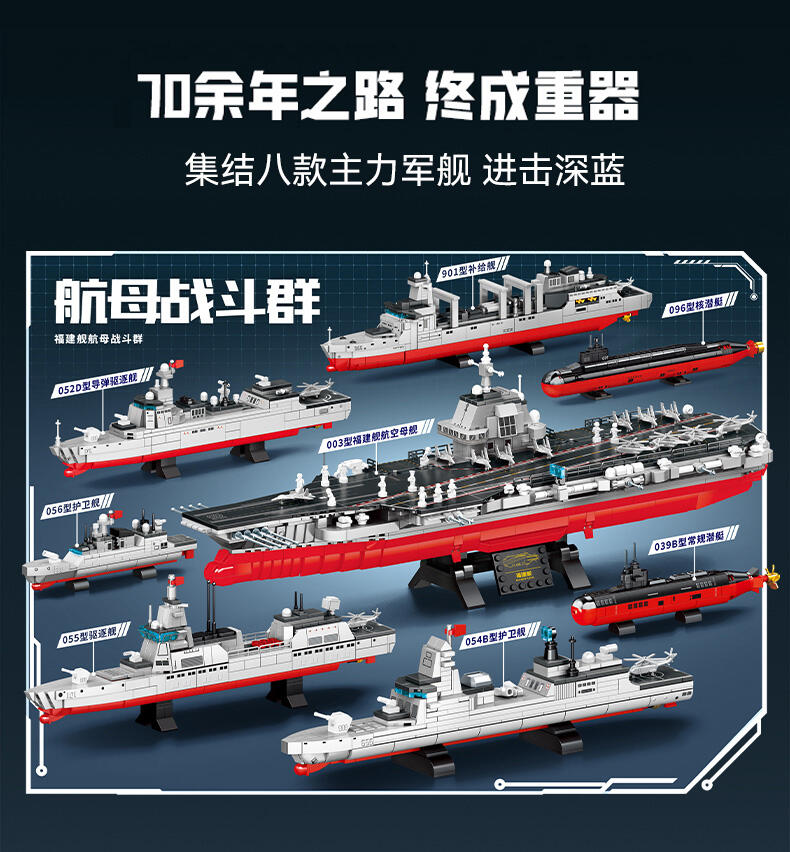 以我国航母-福建舰航空母舰模型为主体,整编056型护卫舰、039B常规核潜艇、054B护卫舰、052D导弹驱逐舰、096核潜艇、055型驱逐舰、901型补给舰等多种舰队模型组建航母战斗群,在孩子在娱乐玩耍的过程中,培养孩子对国防事业建设学习及国防意识的教育