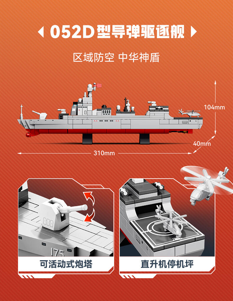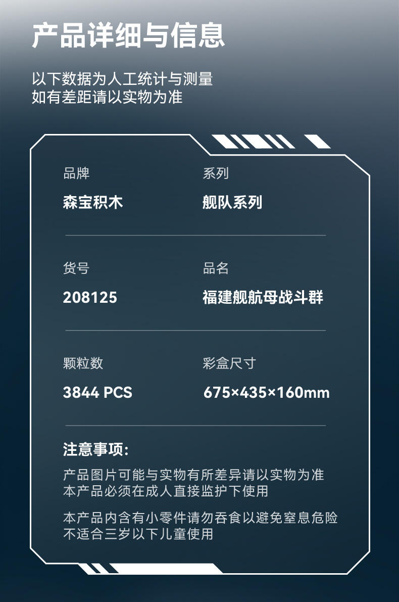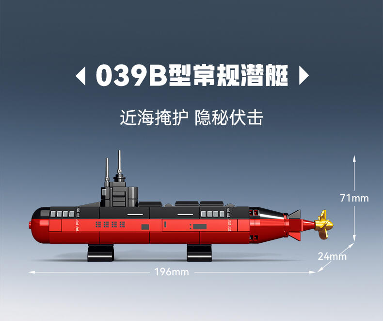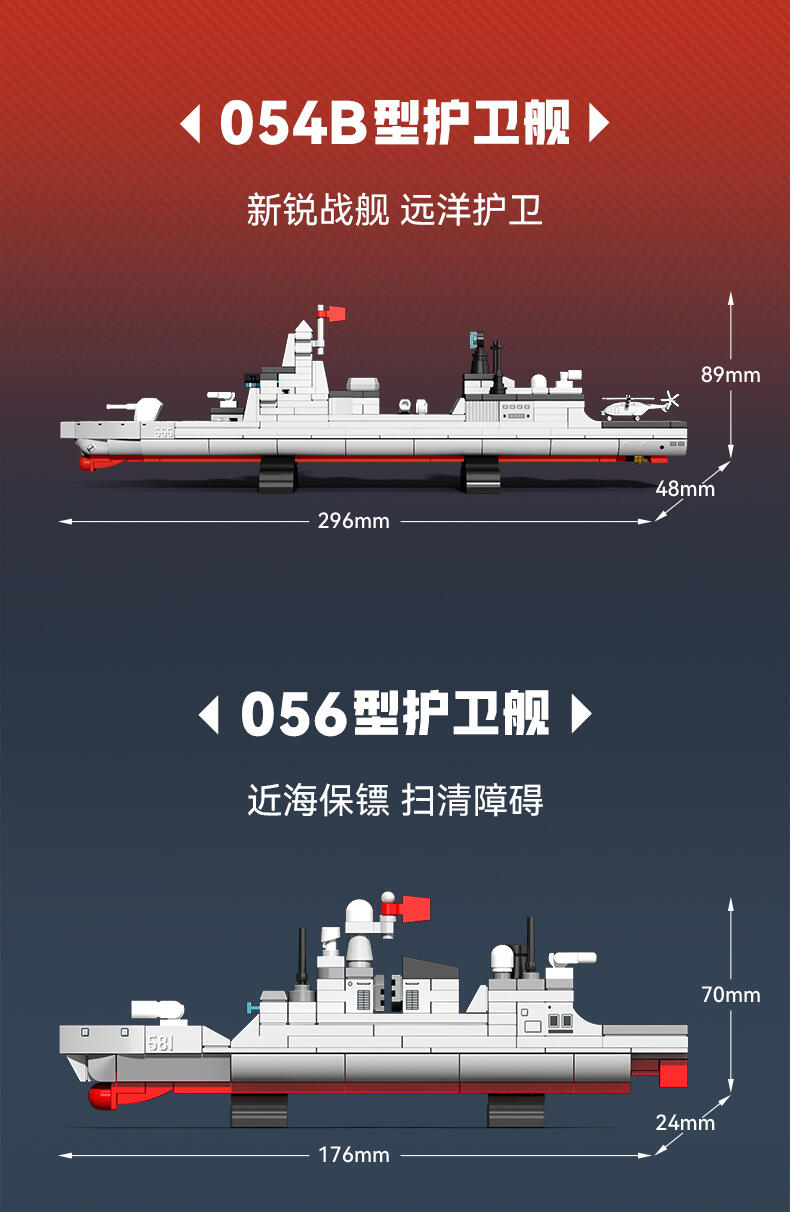 以我国航母-福建舰航空母舰模型为主体,整编056型护卫舰、039B常规核潜艇、054B护卫舰、052D导弹驱逐舰、096核潜艇、055型驱逐舰、901型补给舰等多种舰队模型组建航母战斗群,在孩子在娱乐玩耍的过程中,培养孩子对国防事业建设学习及国防意识的教育