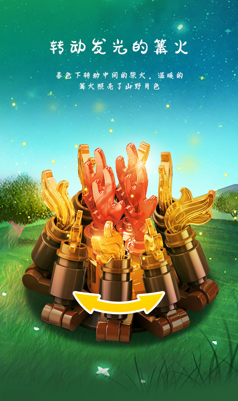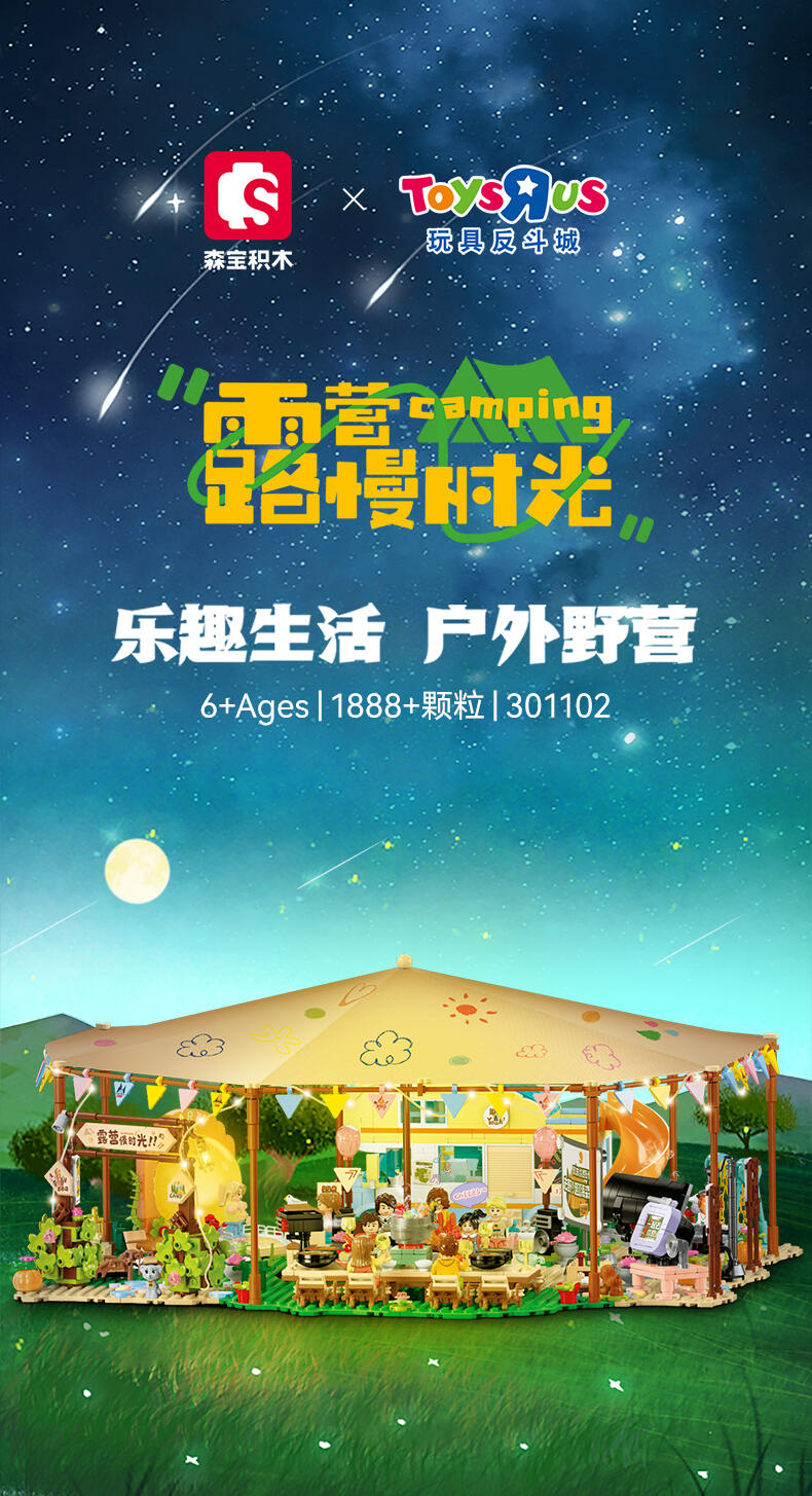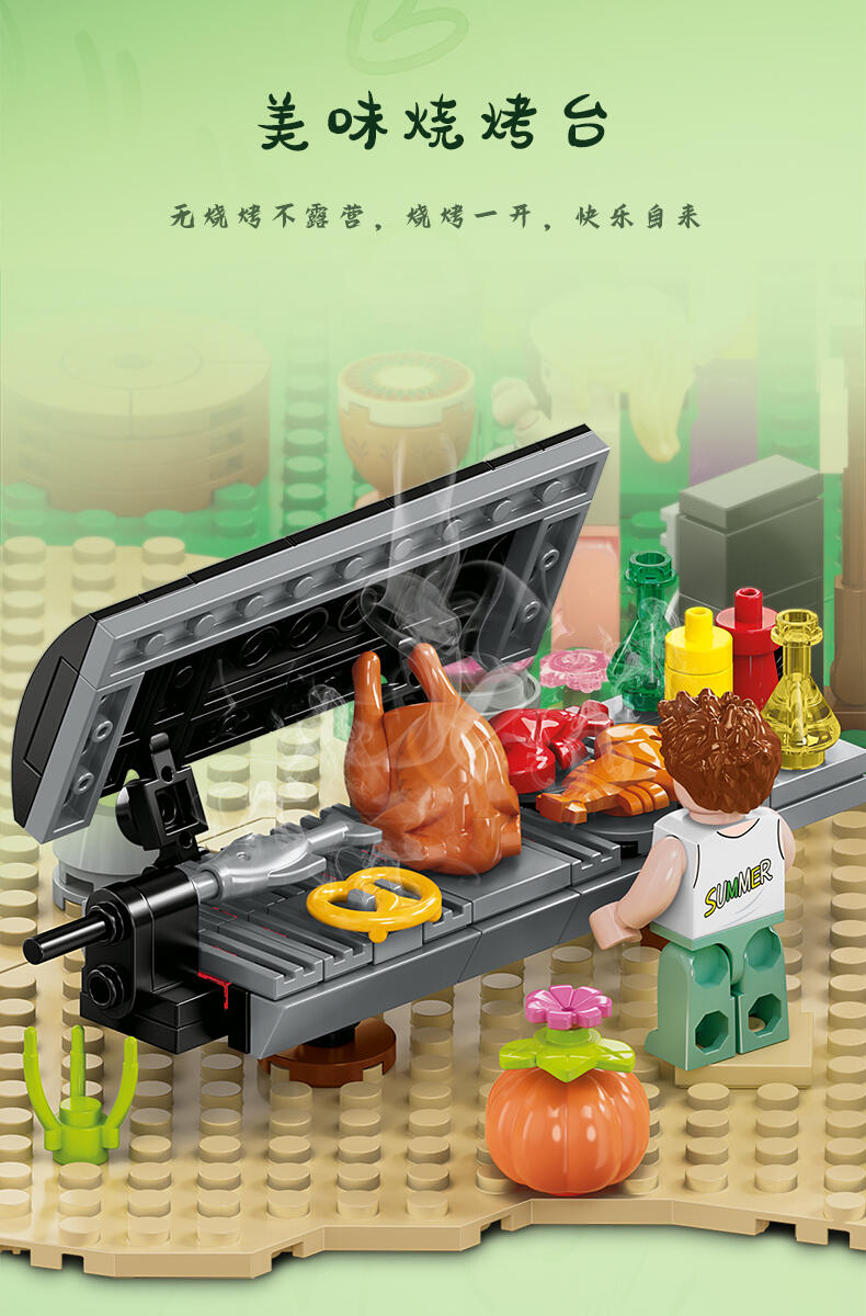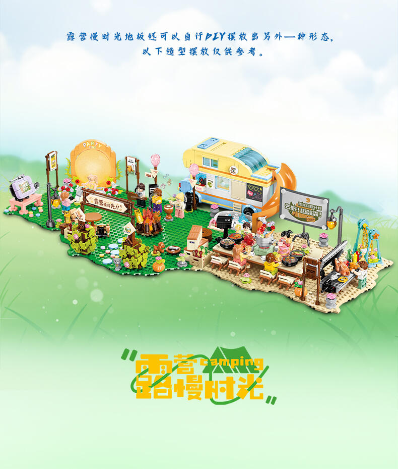 全景由1888个颗粒DIY拼装,可组合聚餐区、休闲区、月亮拍摄打卡台、音乐派对、泳池、烧烤台、营火、投影放映区等细节来还原现实户外露营场景,点缀灯光将场景串联成大型露营场地,氛围代入感拉满。