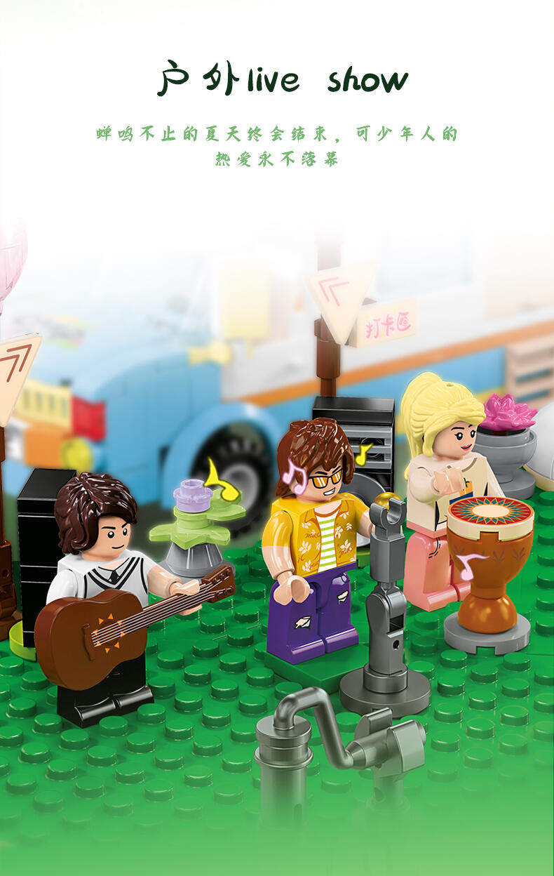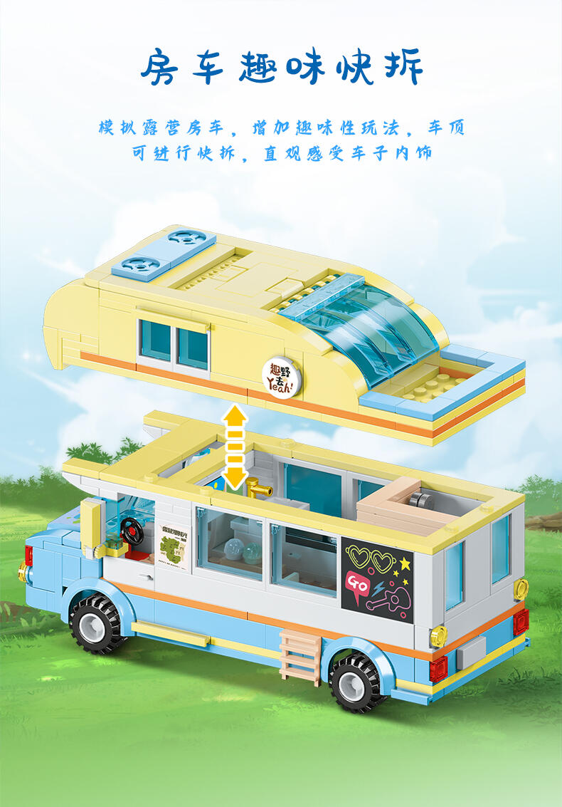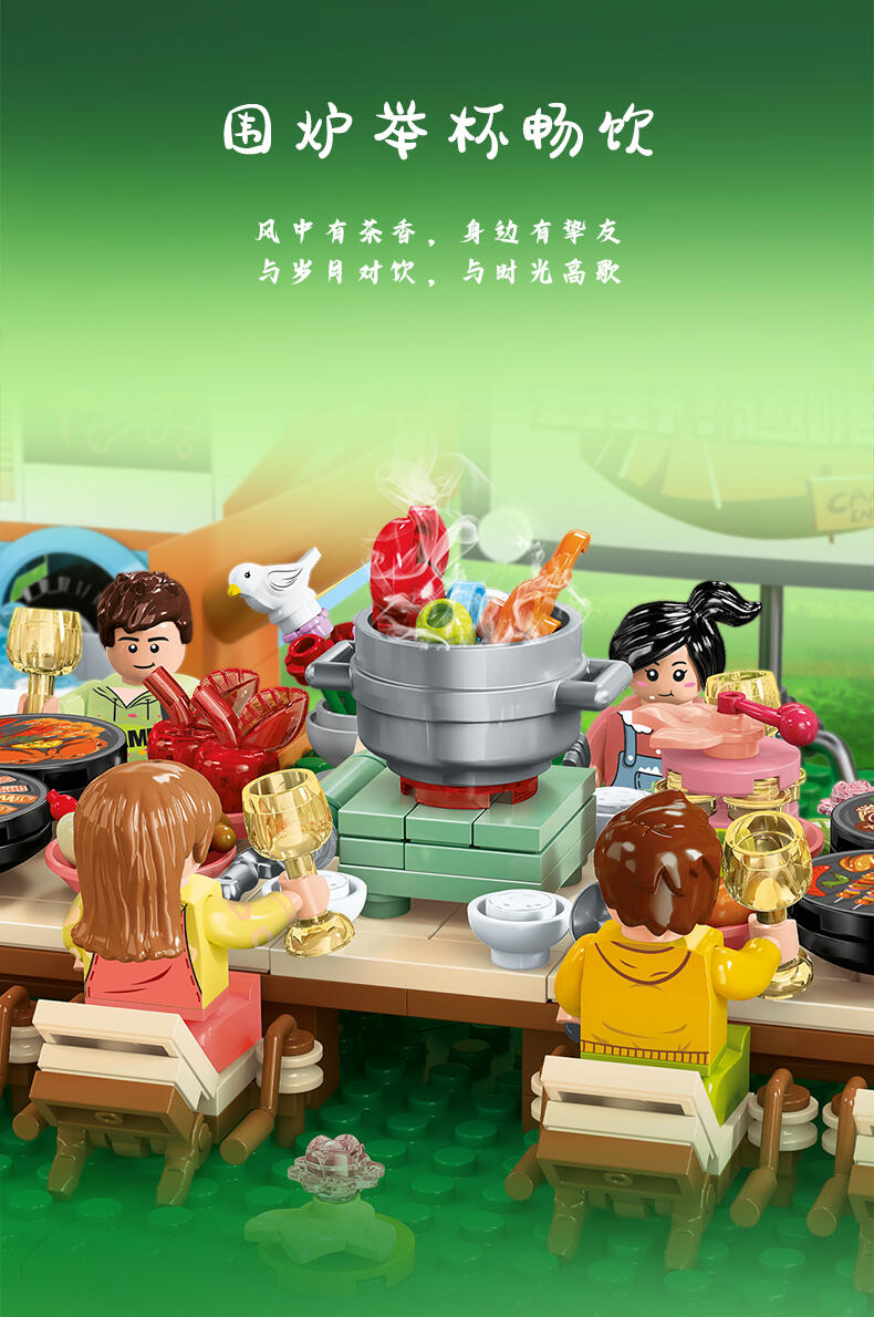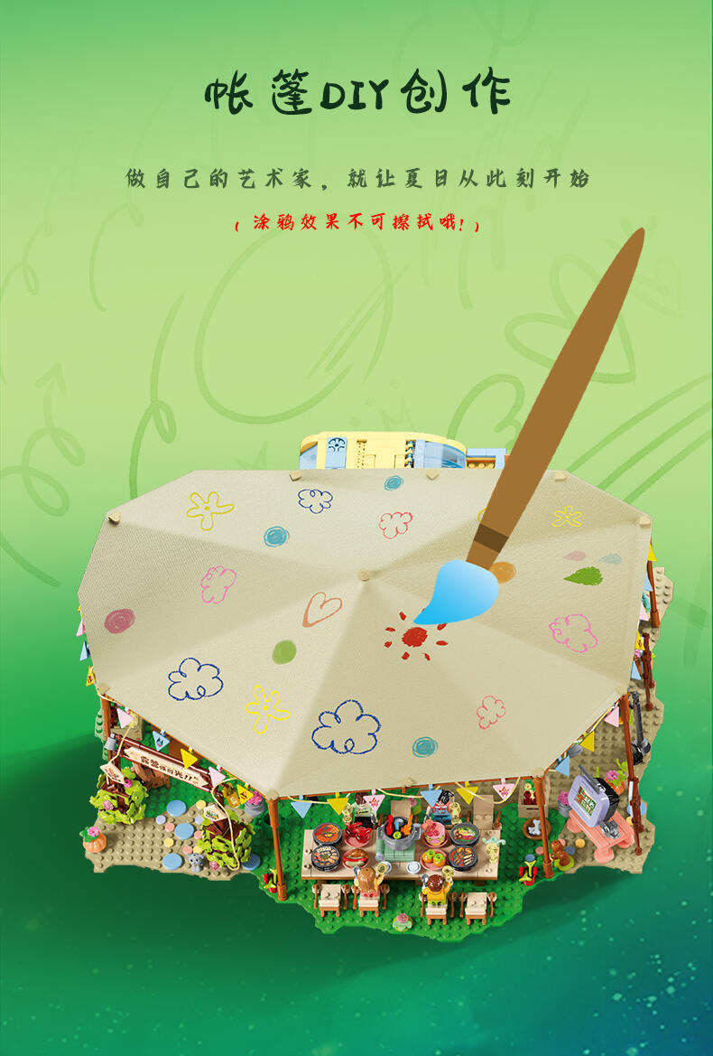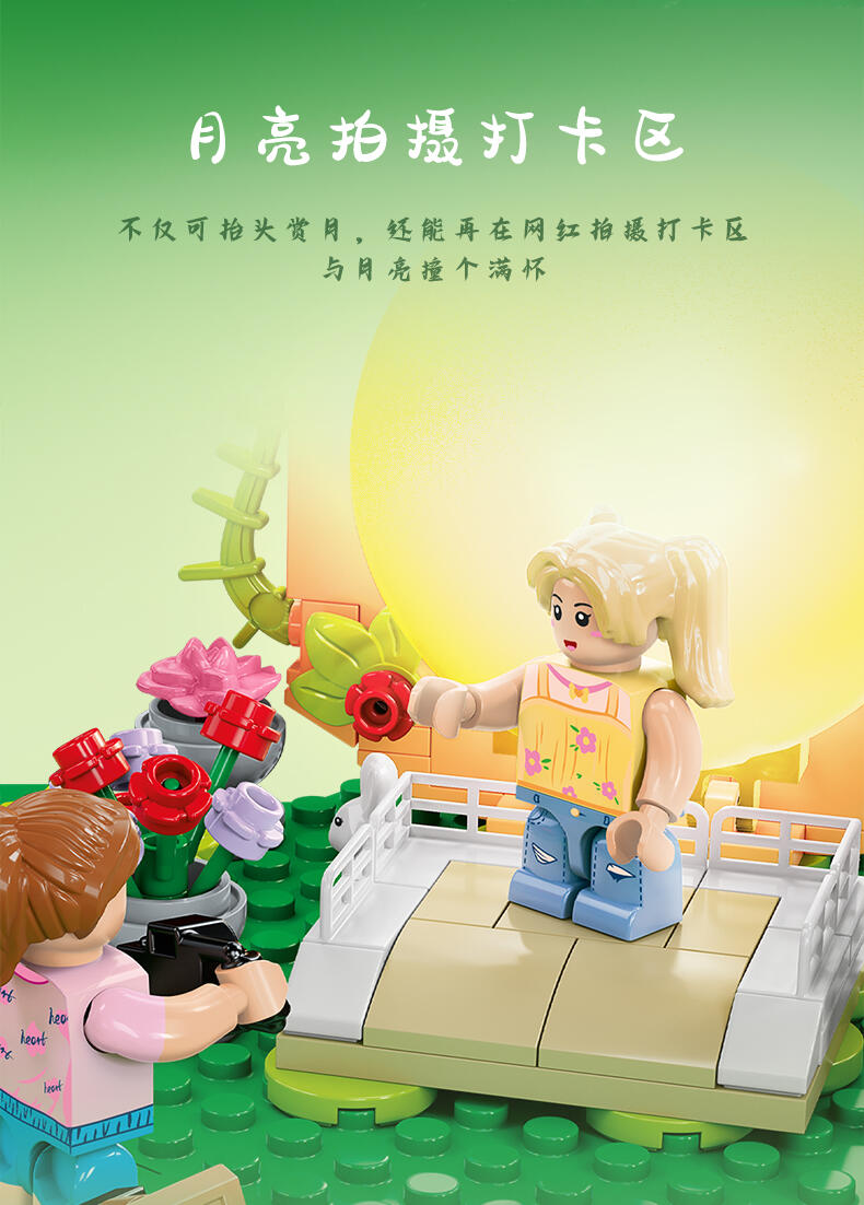 全景由1888个颗粒DIY拼装,可组合聚餐区、休闲区、月亮拍摄打卡台、音乐派对、泳池、烧烤台、营火、投影放映区等细节来还原现实户外露营场景,点缀灯光将场景串联成大型露营场地,氛围代入感拉满。