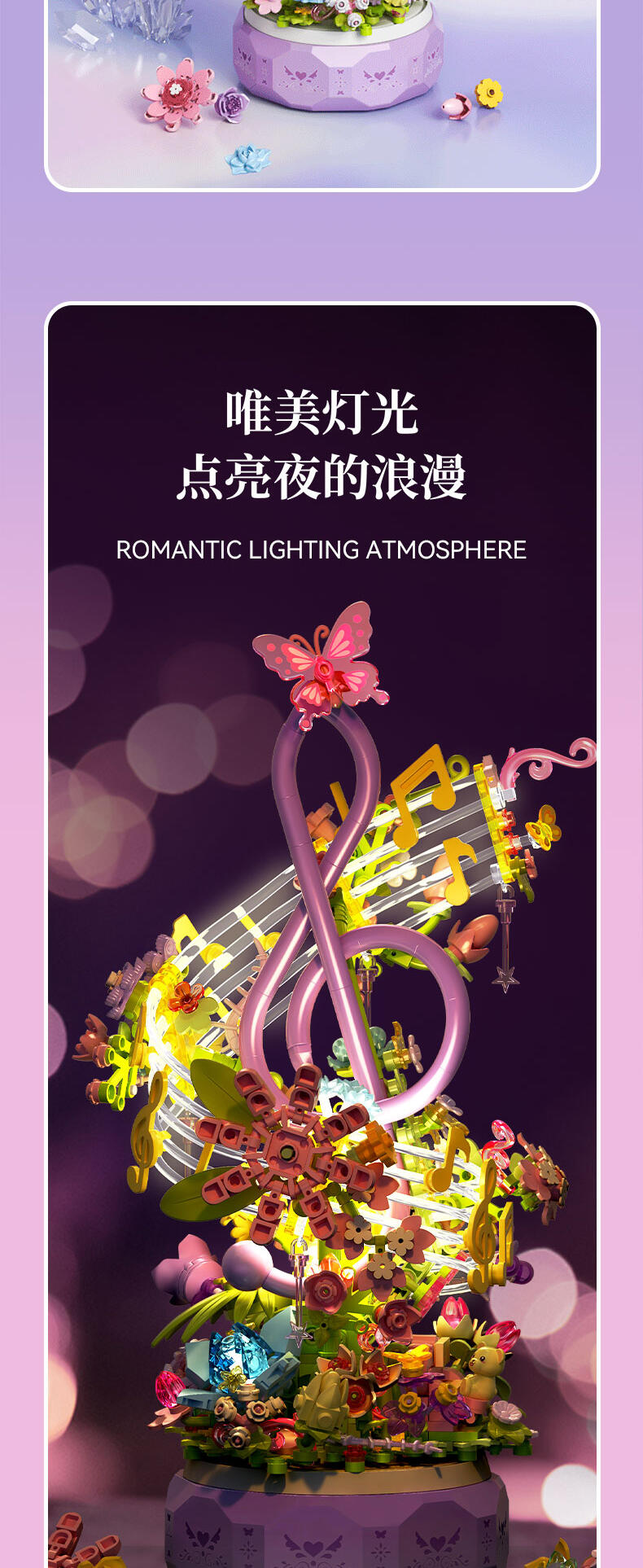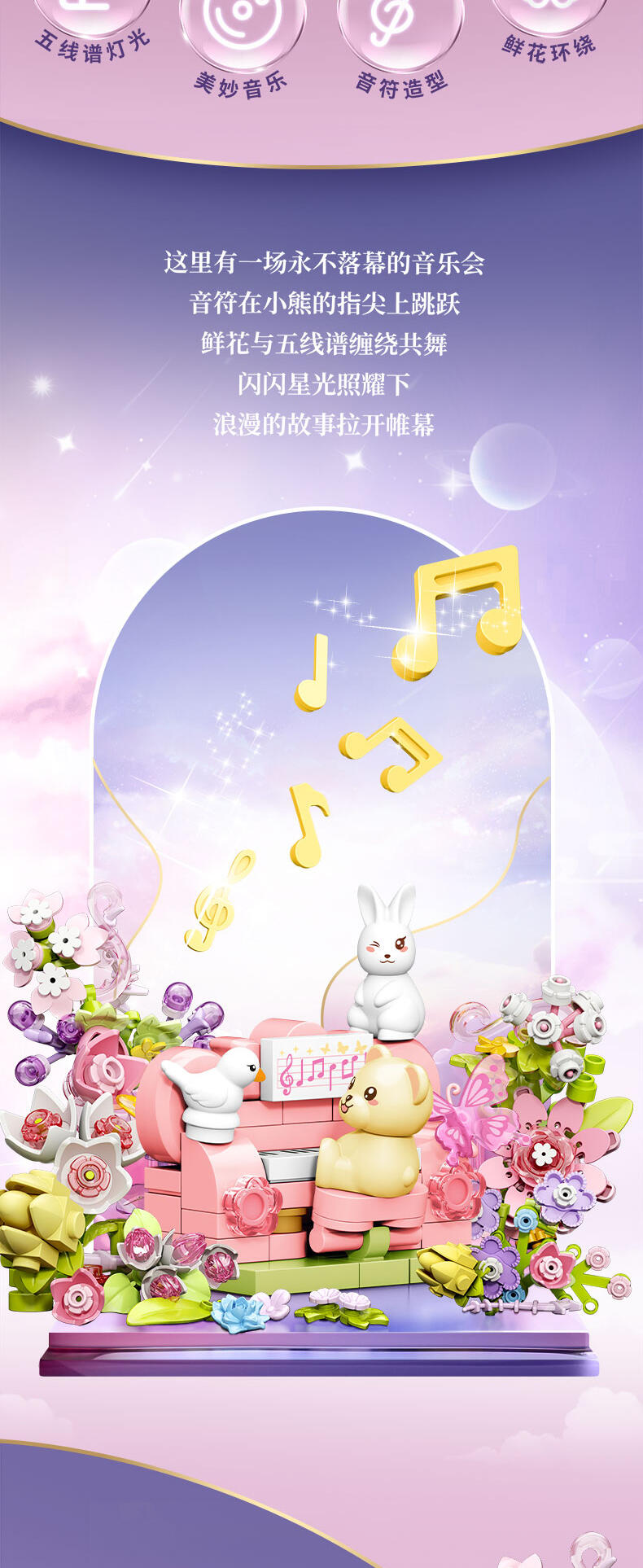 积木花开,旋转音乐底座,熊熊钢琴弹奏,灯光氛围。五线谱灯光氛围。