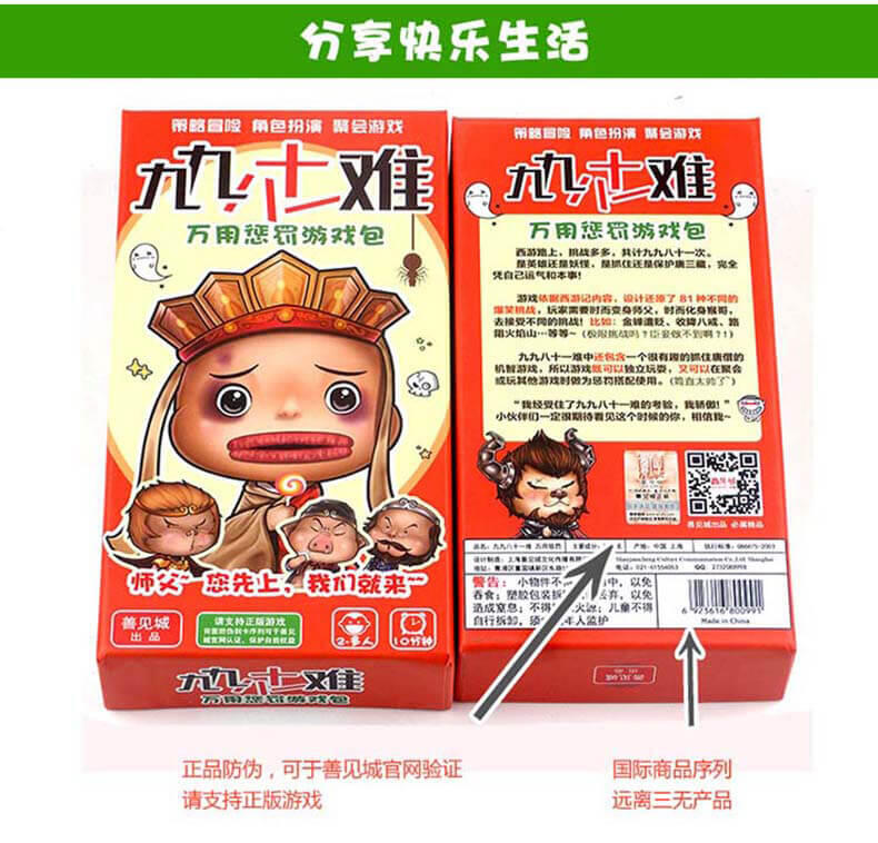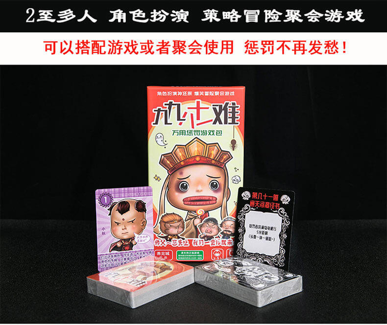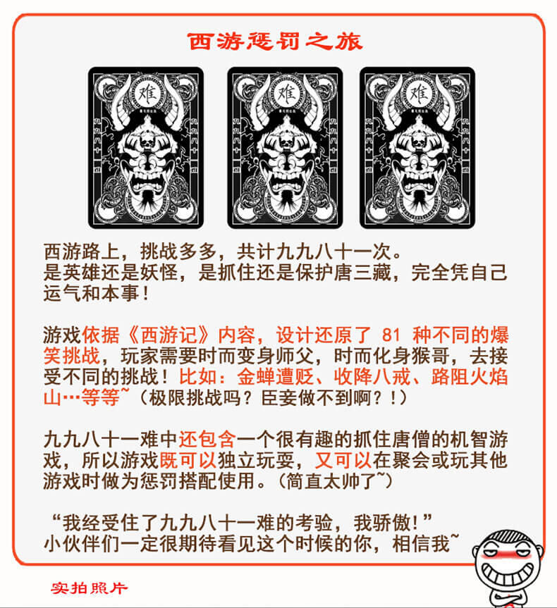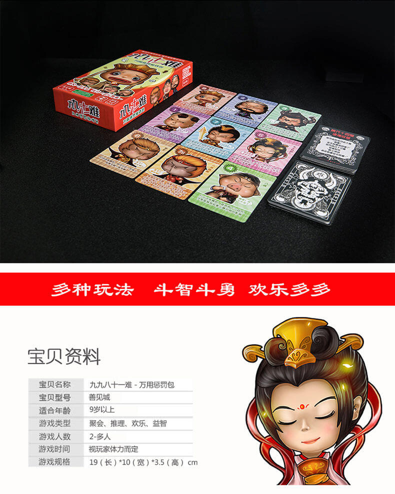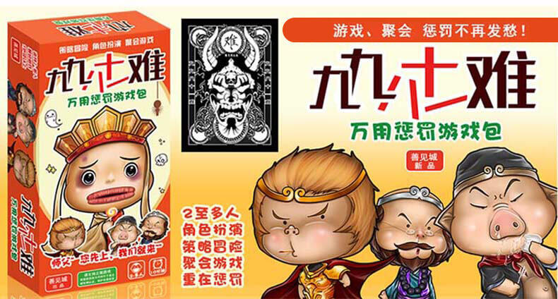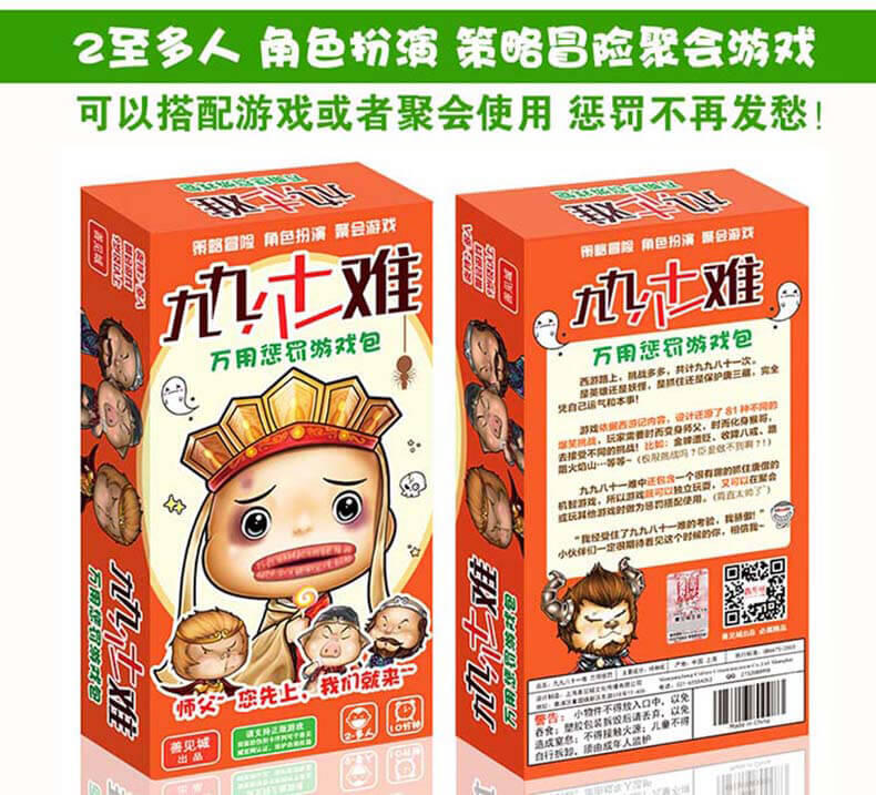 九九八十一难包含有一个有趣的抓住唐僧的身份卡牌游戏,是英雄还是妖怪,是抓住还是保护那个啰嗦的和尚?所以这一盒游戏实际包含两个游戏,可独立玩耍,又可在聚会或玩其他游戏时做为惩罚道具使用,真的是超值哦,所以别犹豫咯,赶紧来加入我们搞笑的冒险之旅吧!