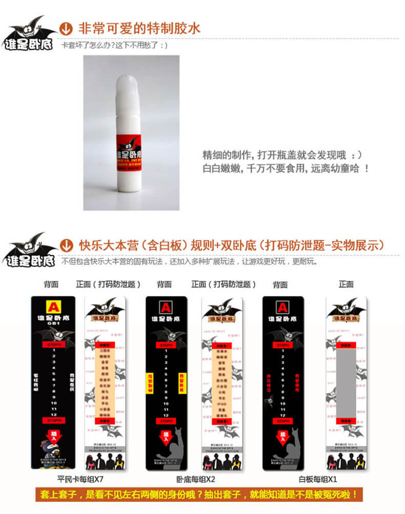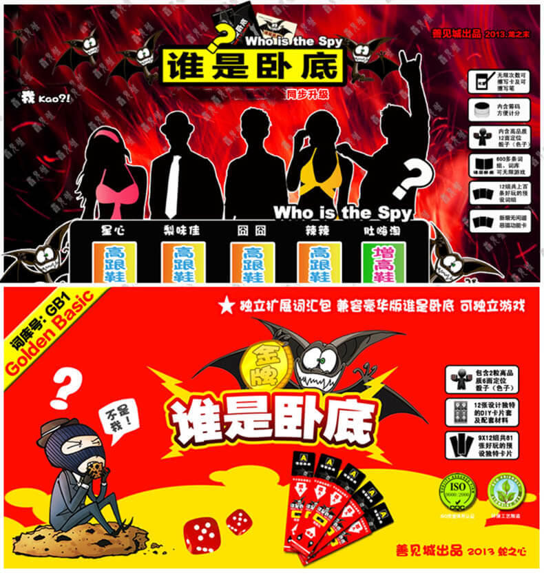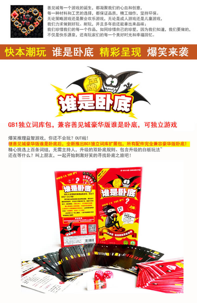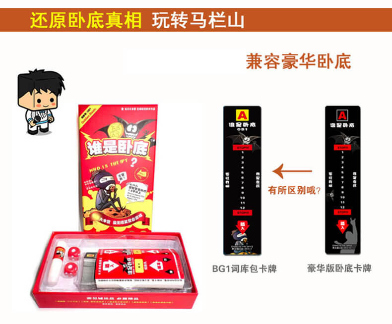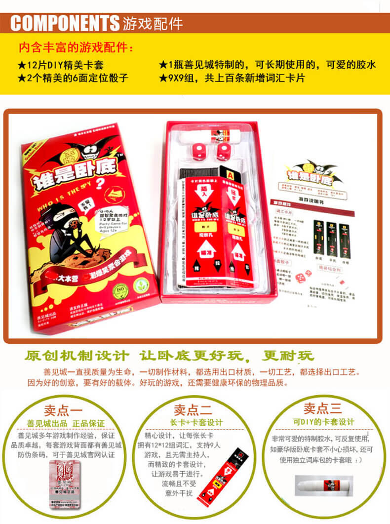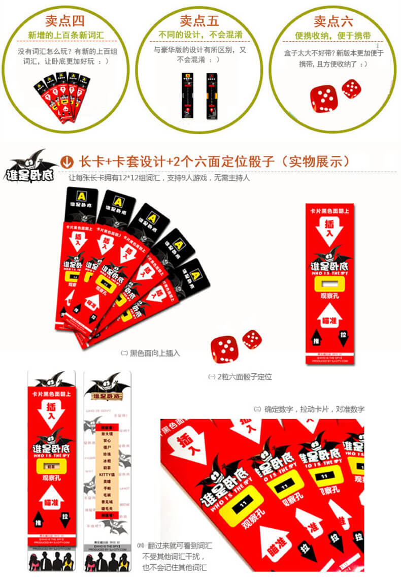 风靡聚会轰趴圈的爆笑推理益智游戏,你还不会玩?OUT啦!善见城出品的‘谁是卧底’经典版,兼容谁是卧底系列游戏所有配件,并包含不同的词汇包,巧妙设计,无需主持人。精选的上百条词组,升级的双卧底规则,全新设计的白板玩法,让游戏更加刺激好玩!并且方便携带,支持4-9人同时游戏!