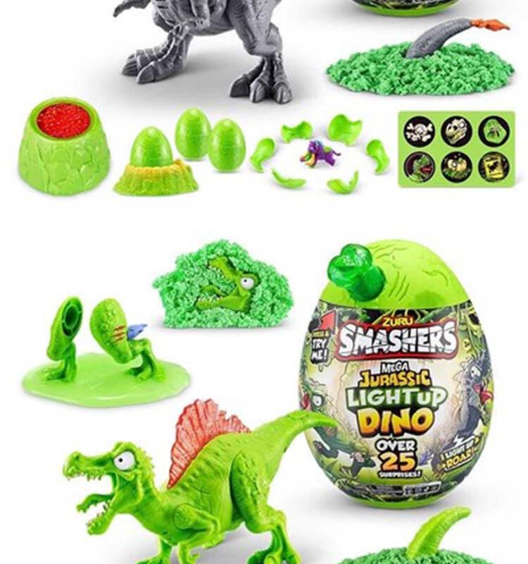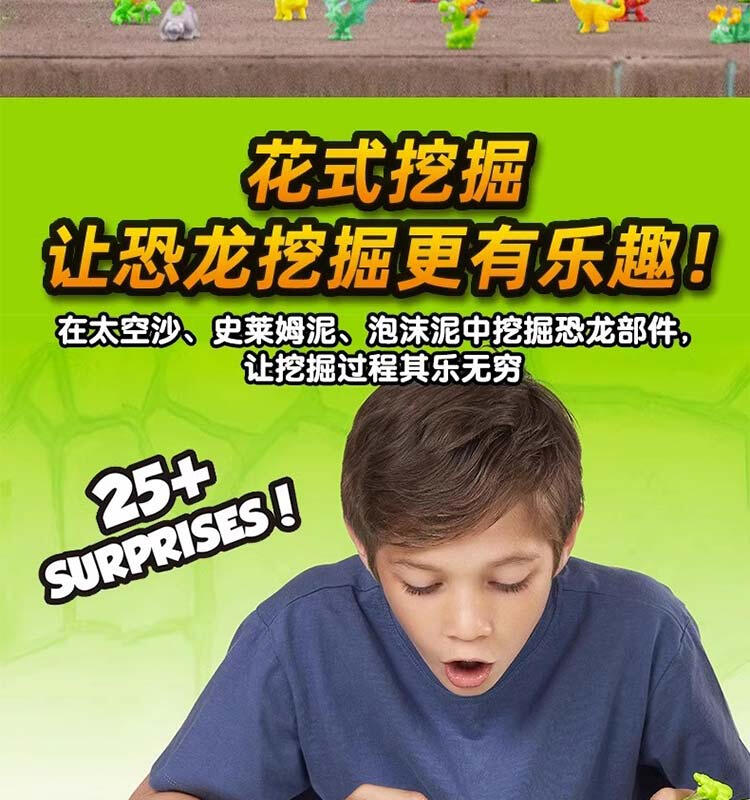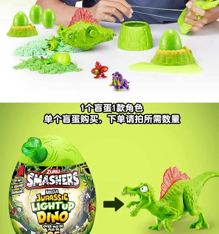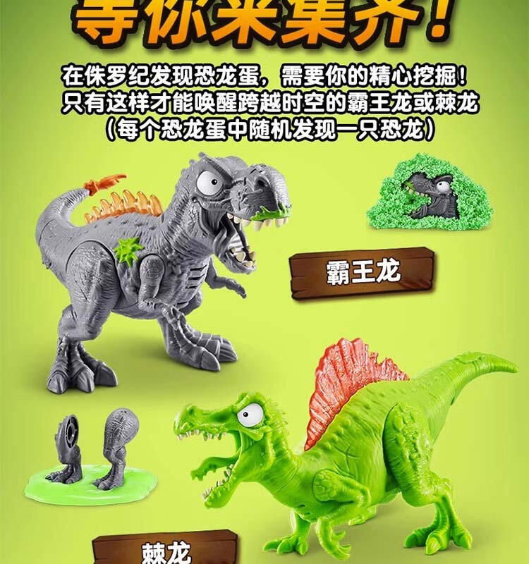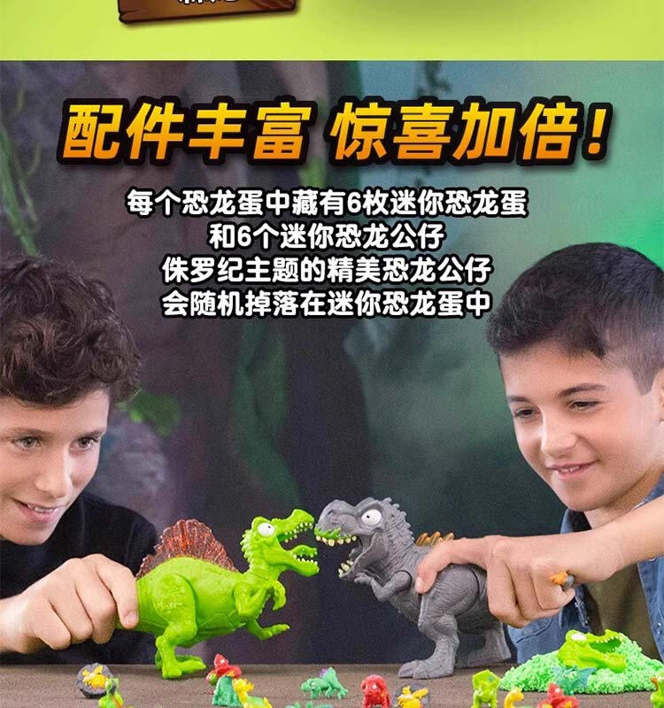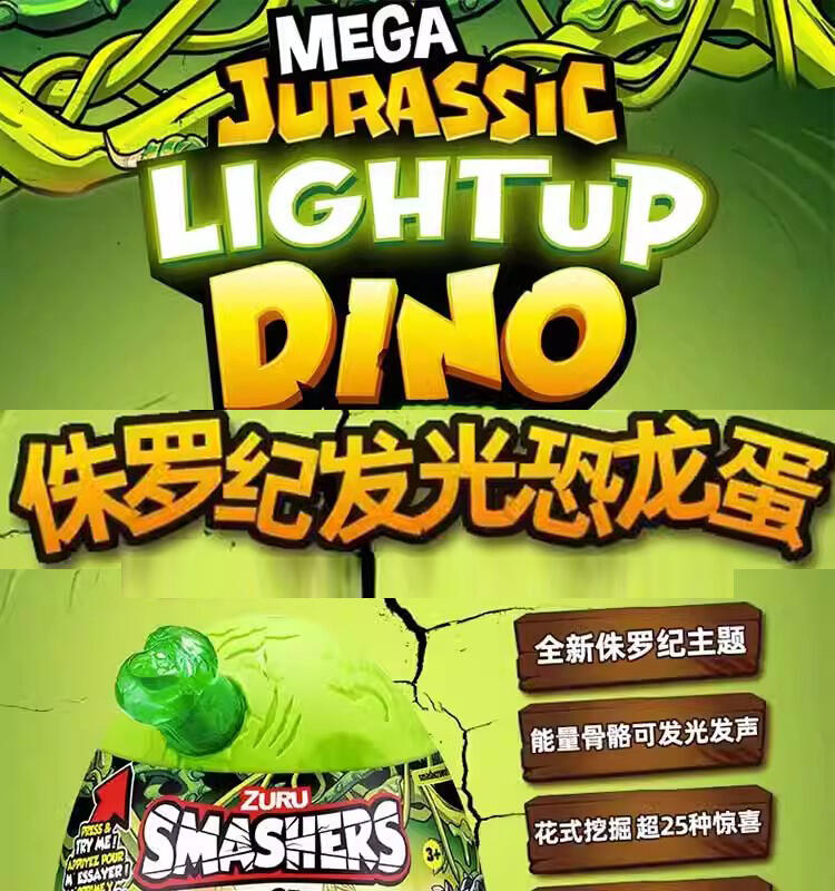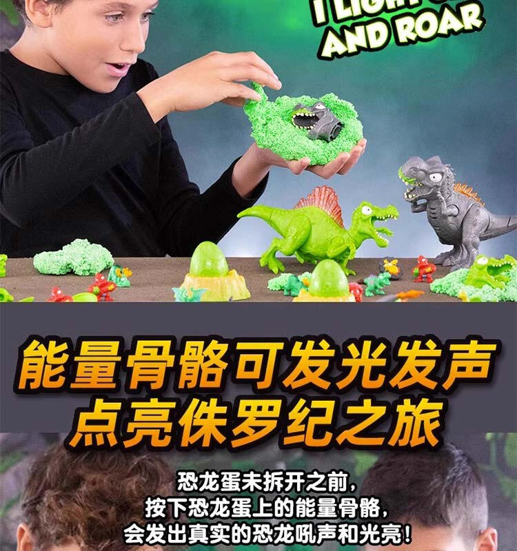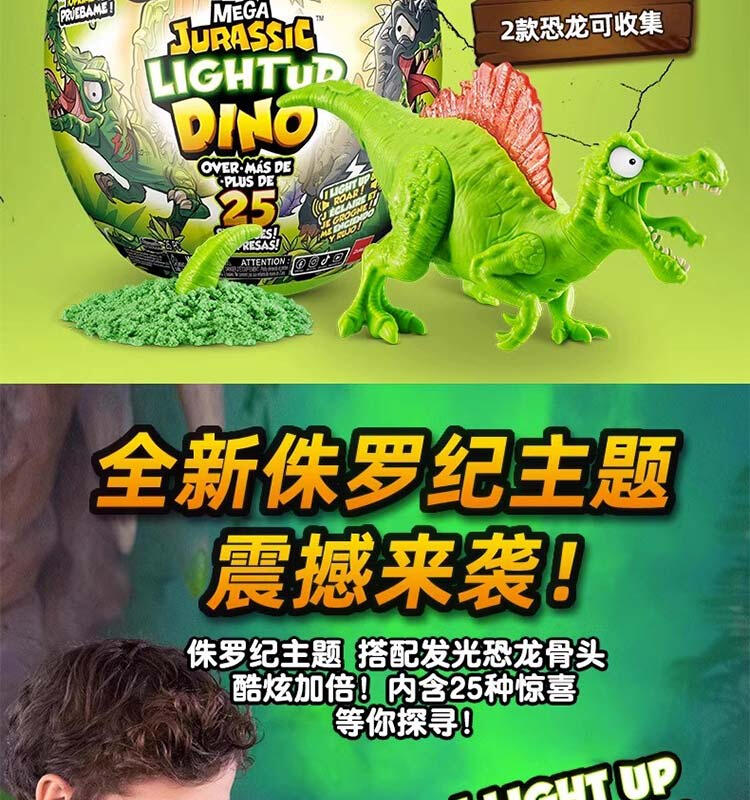 1:全新侏罗纪主题 ,震撼来袭。侏罗纪主题,搭配发光恐龙骨头 酷炫加倍!内含25种惊喜 等你探寻!2:能量骨骼可发光发声点亮侏罗纪之旅。恐龙蛋未拆开之前,按下恐龙蛋上的能量骨骼,会发出真实的恐龙吼声和光亮!3:霸王龙棘龙等你来集齐!在侏罗纪发现恐龙蛋,需要你的精心挖掘!只有这样才能唤醒跨越时空的霸王龙或棘龙(每个恐龙蛋中随机发现一只恐龙)