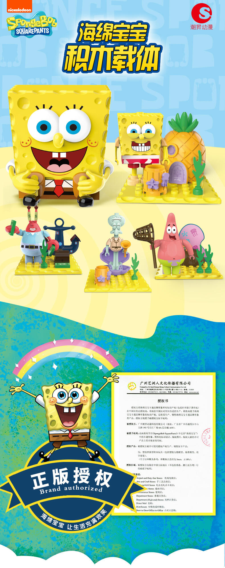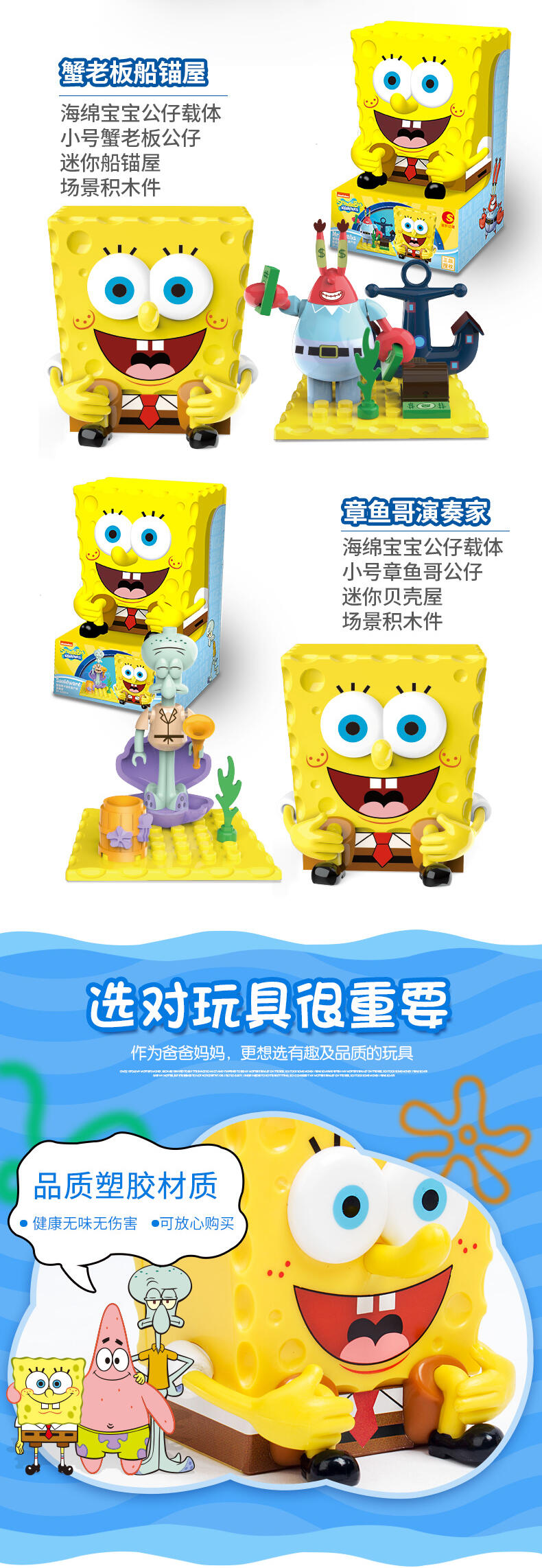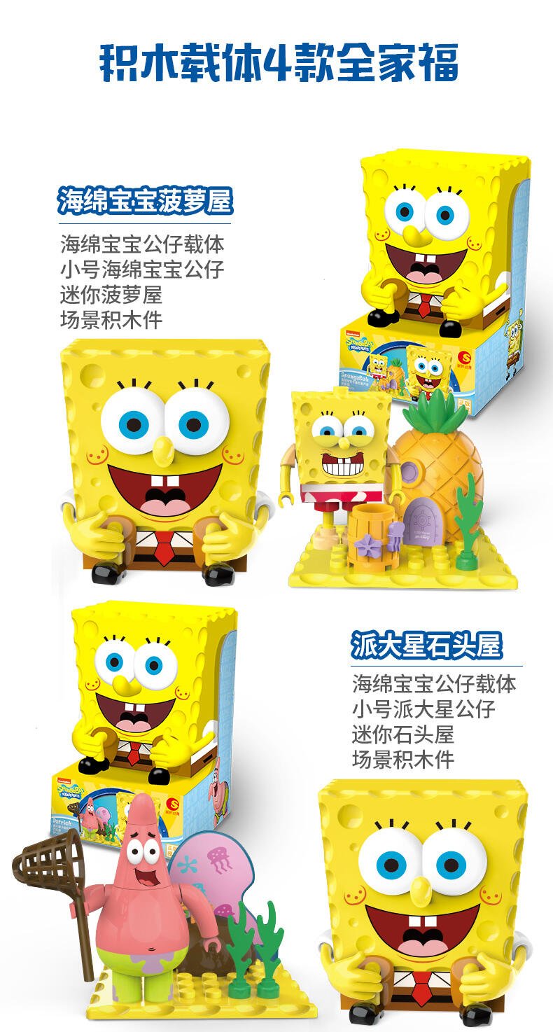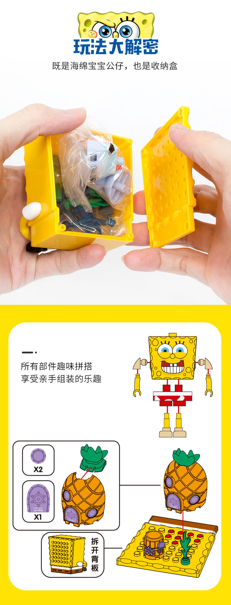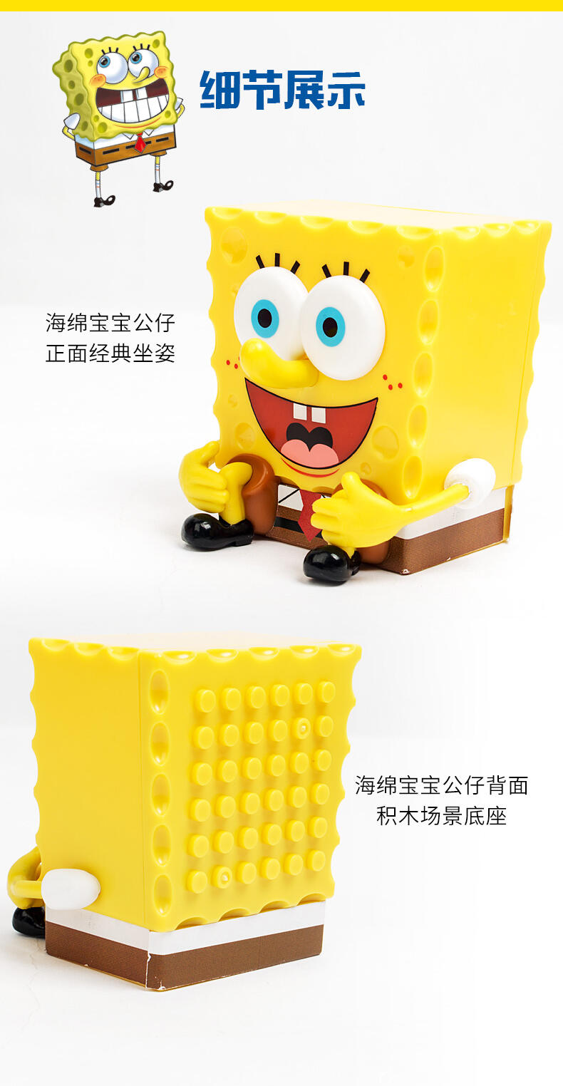 海绵宝宝正面经典坐姿,产品背面为场景底坐,小可爱们可以通过积木配件拥有自己的海绵宝宝海洋乐园,产品本身是一个收纳盒,也可供收纳糖果等小玩具。积木拼搭,锻炼儿童想象力,结构思维,空间知觉,创造力等能力发展,养成孩子全方位思维模式,通用配件,自由搭配,想换就换。