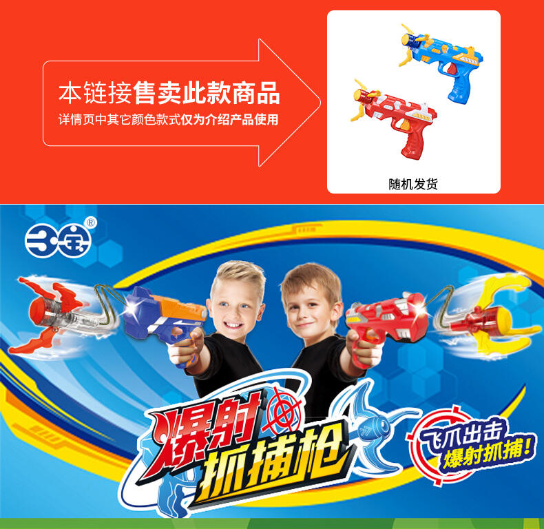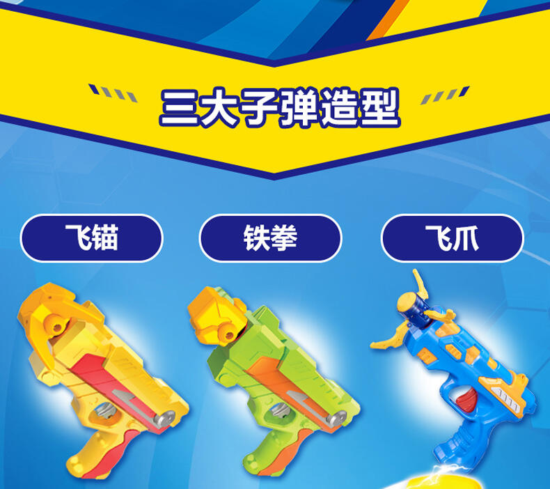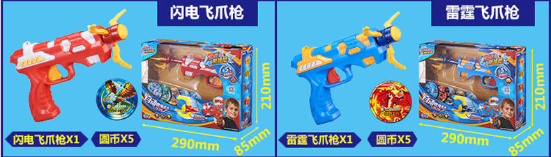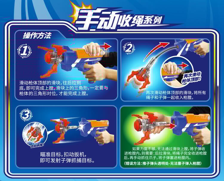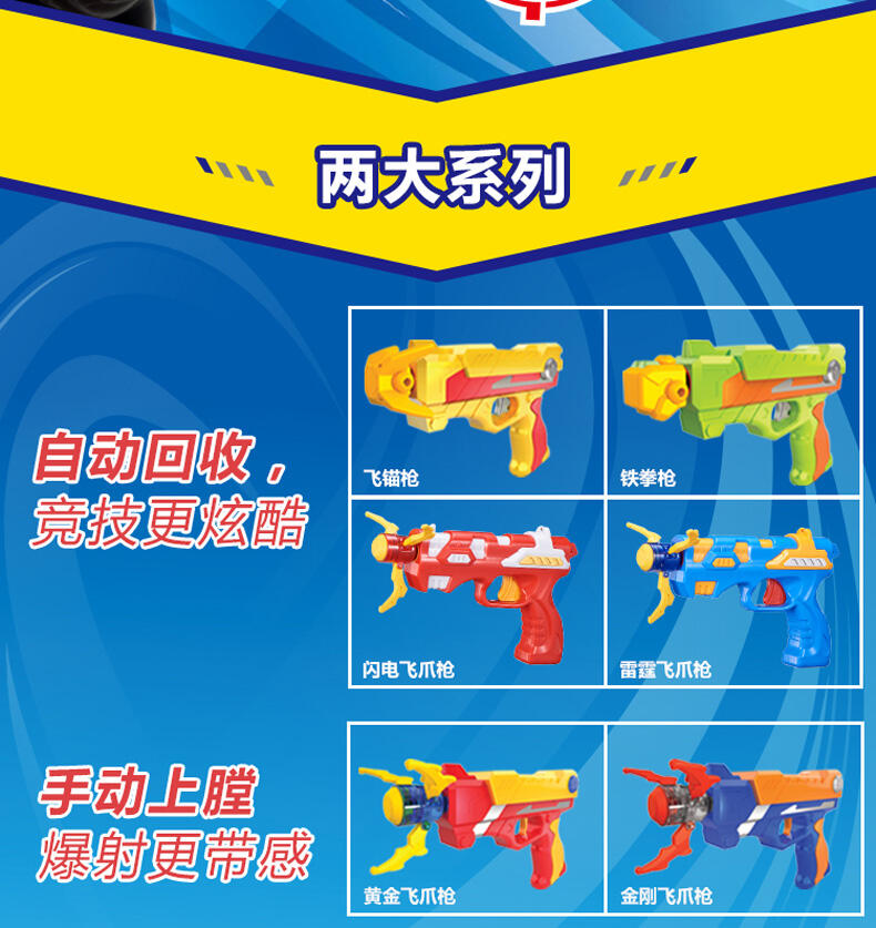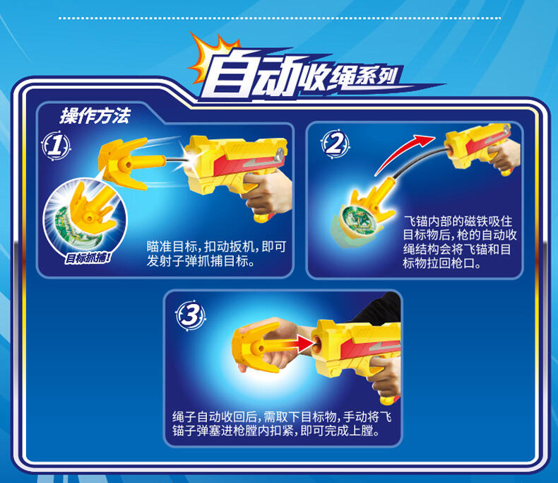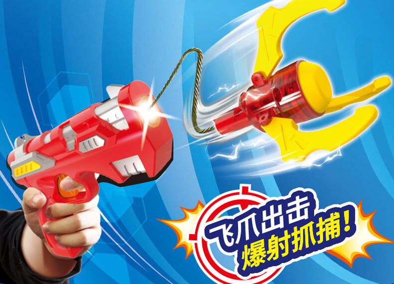 1、闪电飞爪以及雷霆飞爪款产品,需按压子弹塞进枪膛卡紧,完成上膛。子弹打出后能够自动收绳,且其爪子在抓捕圆币后,会形成合拢的抓取姿态,使得圆币抓取更加牢靠,有更强的擒获满足感。 2、可玩单人的花式定点射击、高空捕捉以及同一圆币的多人射击争夺竞赛 ;在圆币比拼竞赛中,可推出比拼数量、数值、速度、包剪锤等等的玩法,1、只需按压子弹塞进枪膛卡紧,完成上膛,2、子弹打出后能够自动收绳,3、爪子在抓捕圆币后,会形成合拢的抓取姿态,使得圆币抓取更加牢靠,有更强的擒获满足感,4、可玩单人的花式定点射击、高空捕捉以及同一圆币的多人射击争夺竞赛,5、在圆币比拼竞赛中,可推出比拼数量、数值、速度、包剪锤等等的玩法。材质:ABS、PVC