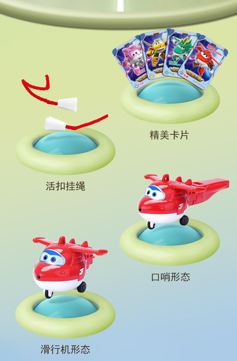 乐迪形象可滑行小飞机,部件可拆卸,可当口哨,又可当滑行飞机。配备4个镭射卡。