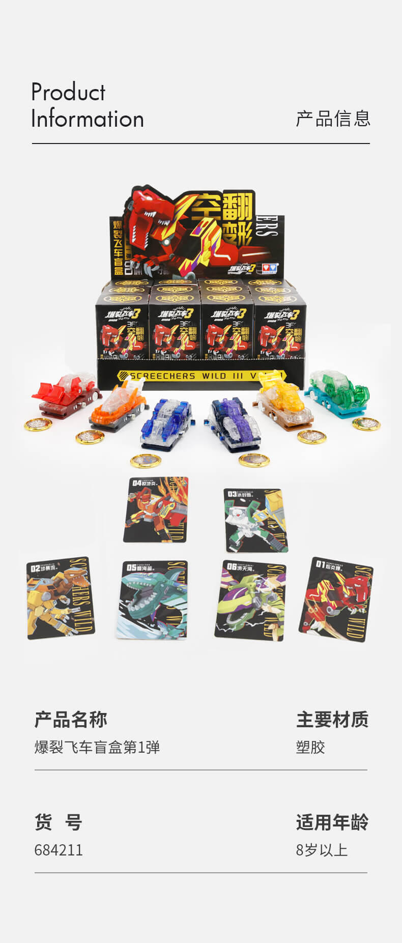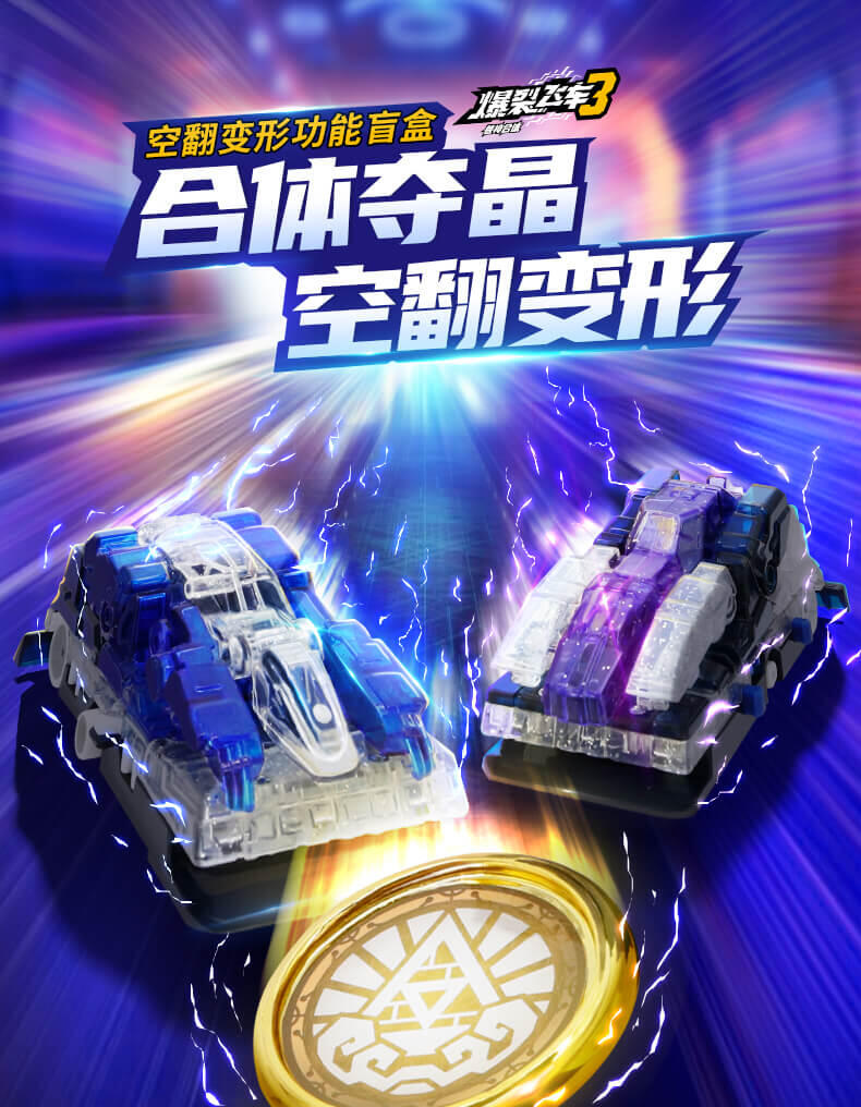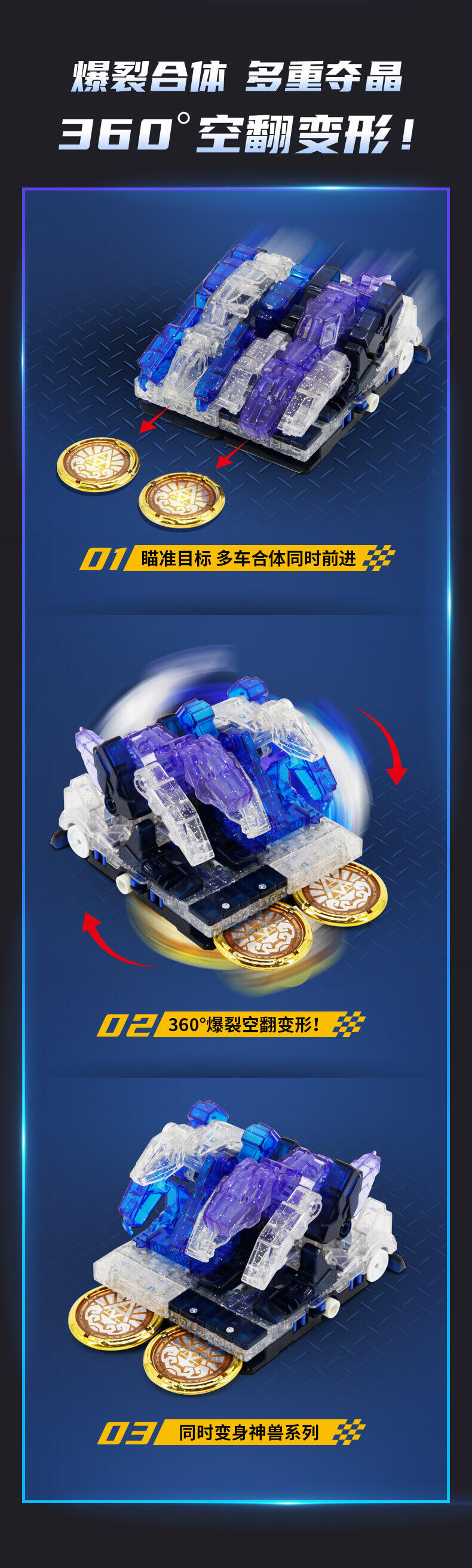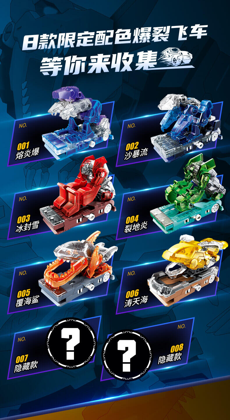 6款常规款+2款隐藏款配置(均单独出售),可拼接多车合体夺晶,360°空翻变形