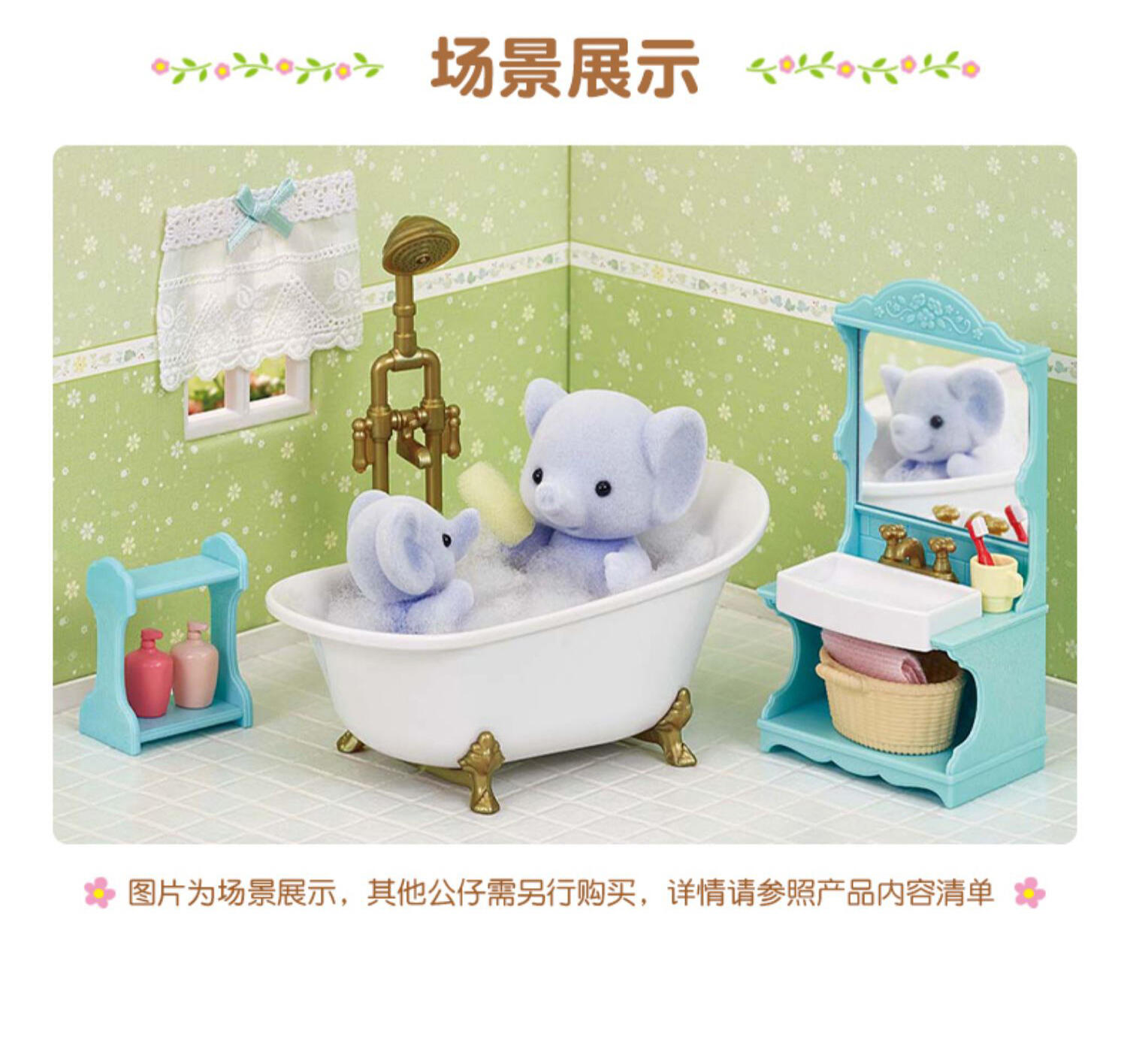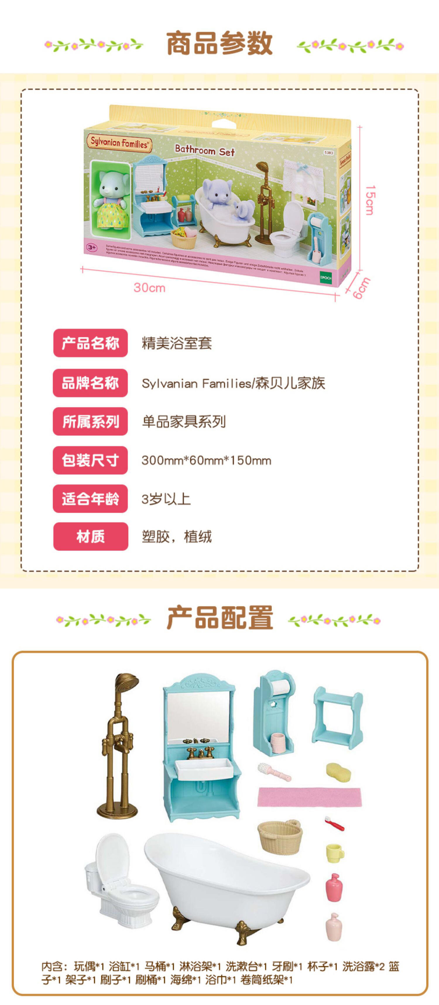 森贝儿家族浴室套装,包括漂亮的经典浴缸,淋浴,水槽,花瓶和许多配件。适合三岁或三岁以上的人使用。一套豪华的浴室设施。