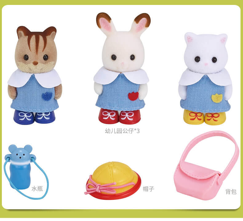 在这个“幼儿园伙伴”组合中,巧克力兔宝宝,核桃松鼠宝宝和波斯猫宝宝穿着可爱的幼儿园衣服。 每个婴儿都穿着不同颜色的标志,并配以匹配的鞋子。 这套产品还包括一组婴儿可以穿或携带的小物件:帽子,饮料瓶和托儿所书包。