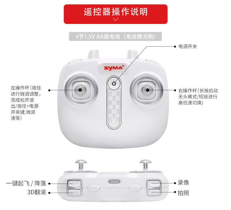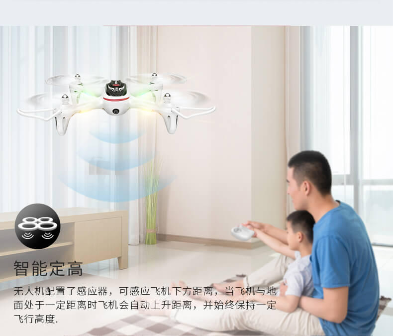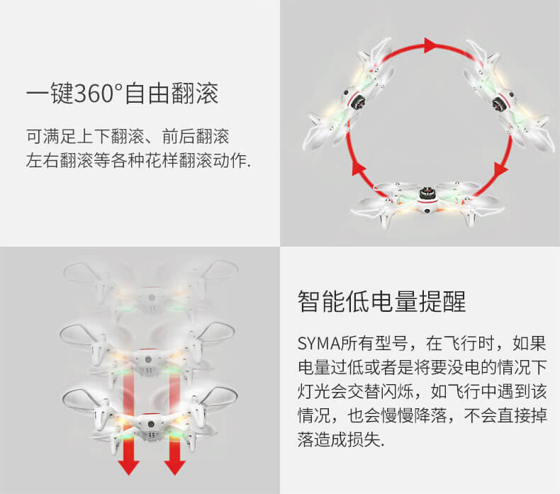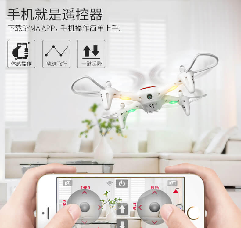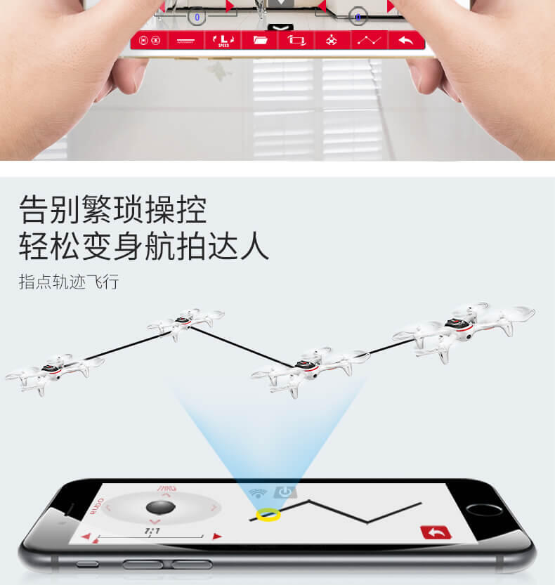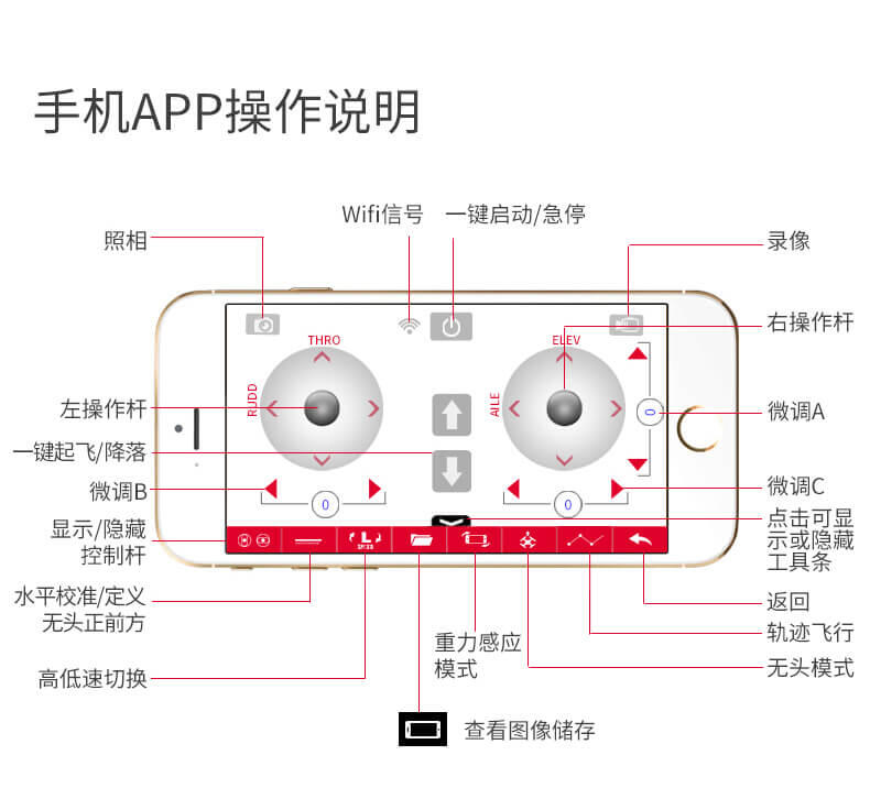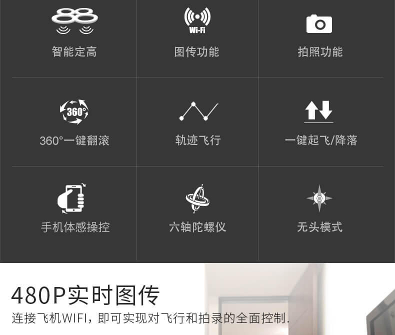 飞行器在室内外均可飞行,具有360度全方位3D翻滚特技功能 ,上升/下降/前进/后退/左右转/左右.飞行器具有一键起飞/降落和水平定高功能,FPV实时航拍传输。轨迹飞行功能,重力感应。