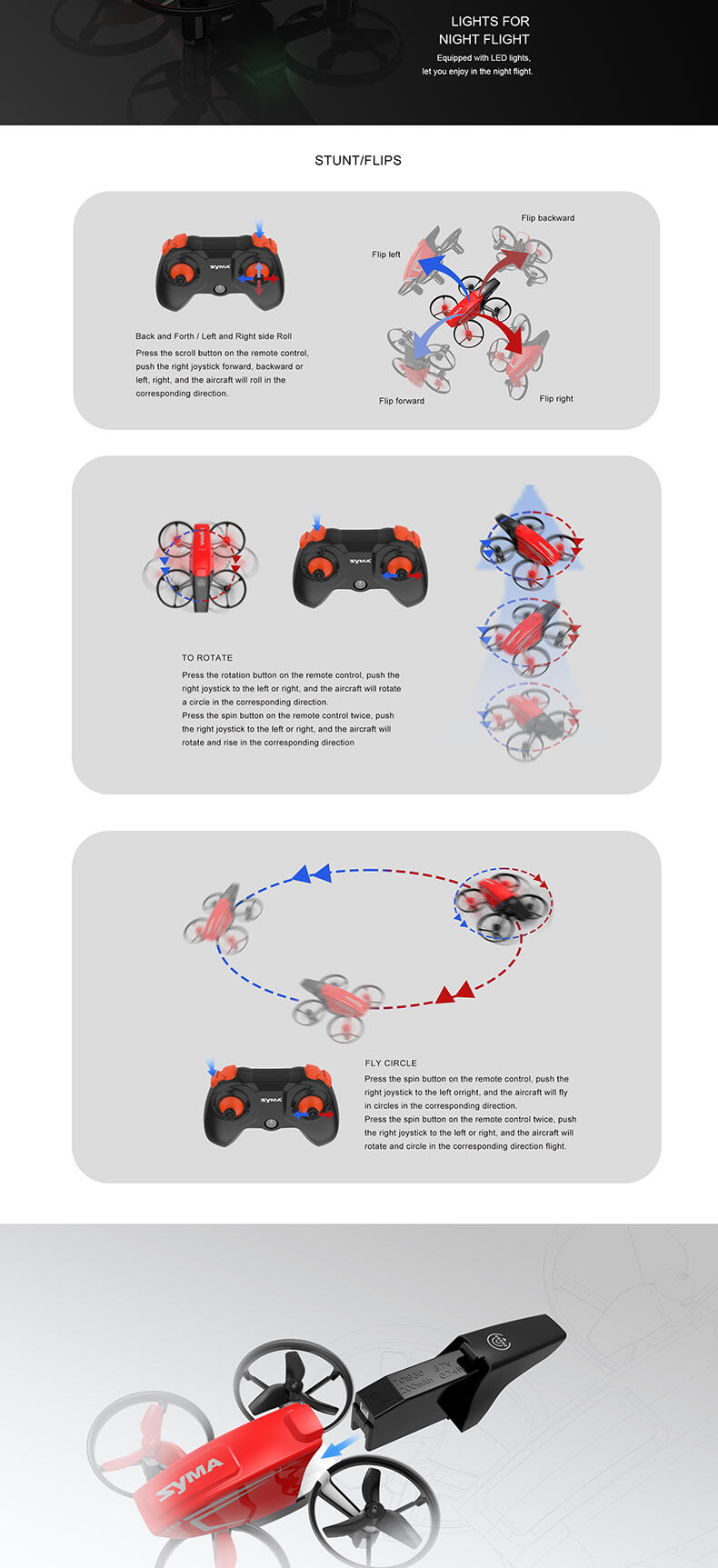 飞行器适合在室内飞行,具有360度全方位3D翻滚特技功能(快档时) ,上升/下降/前进/后退/左右转/左右侧飞等全比例操作普通功能 飞行器具有一键起飞/降落和水平定高,前进方向避障功能(慢档时)