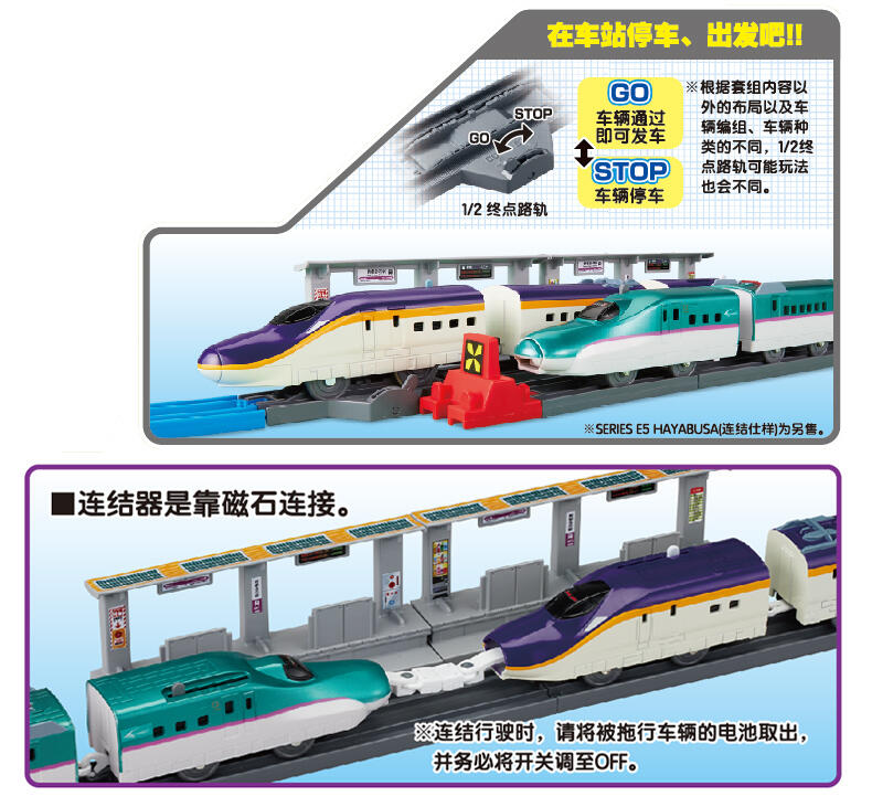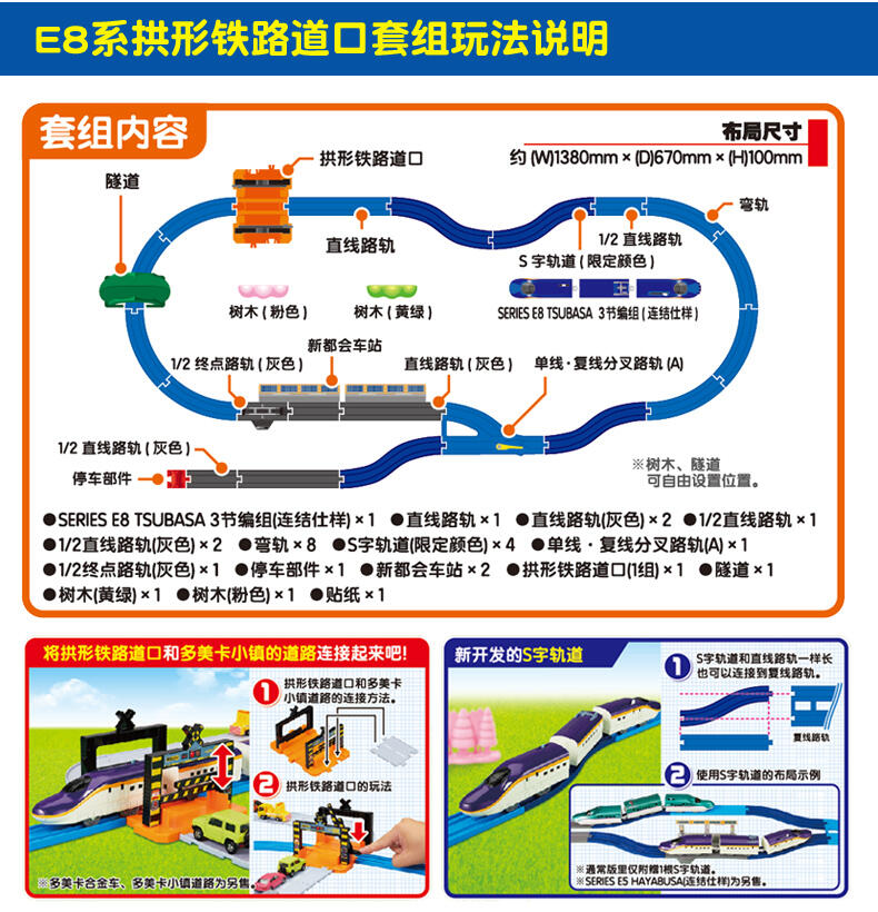 新型新干线的E8系翼很早就在轨道上登场了!更能享受E8系的托米卡拱门道口,新开发S字轨道的限定颜色也附有的多功能一体套装! 因为车辆是连接规格,所以也可以与另售的E5系新干线连接,再现实际的编成! 作为初回特典追加3条限定颜色的S字轨道!