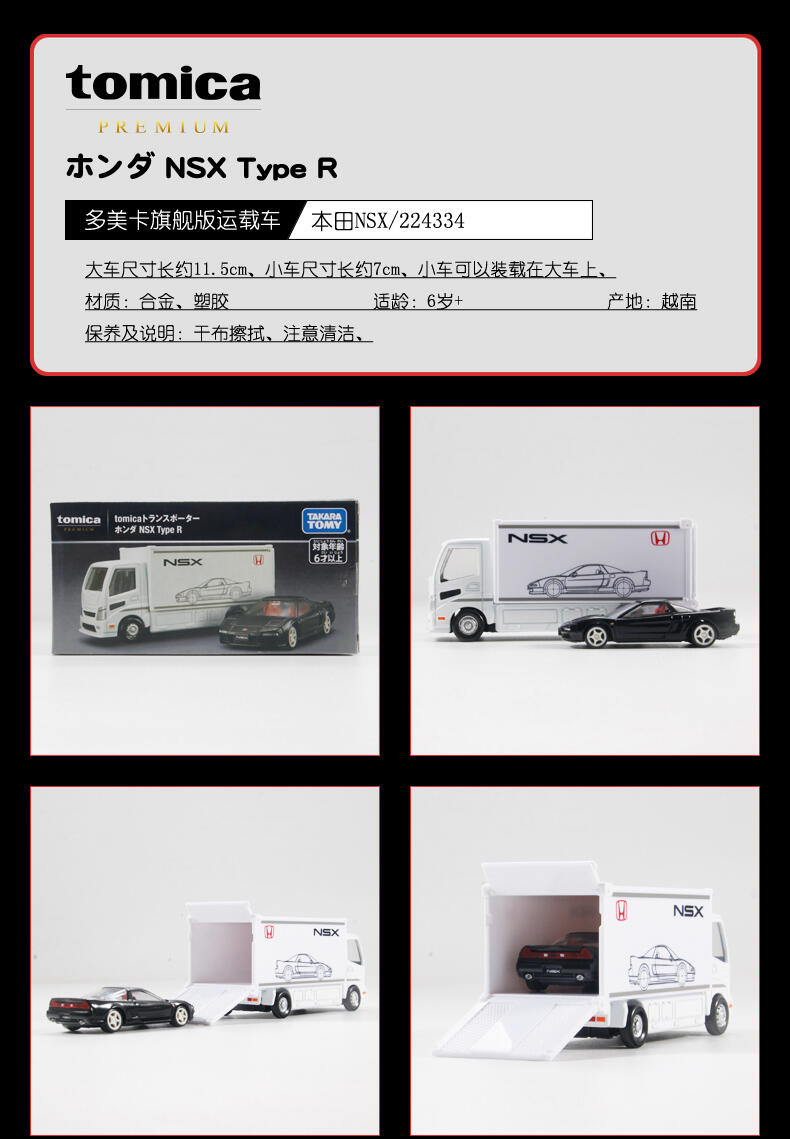 让我们把Tomica Premium放在带有汽车制造商标志的原始运输车上!带有原始颜色[本田NSX Type R]!产品内容:tomica运输车(1),本田NSX R型(1)