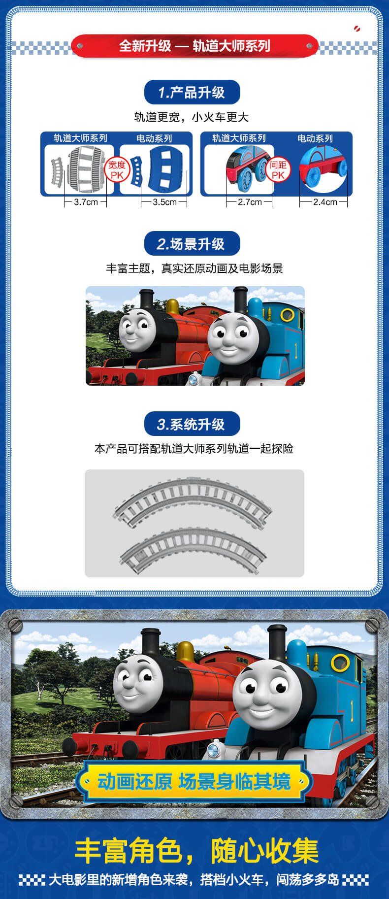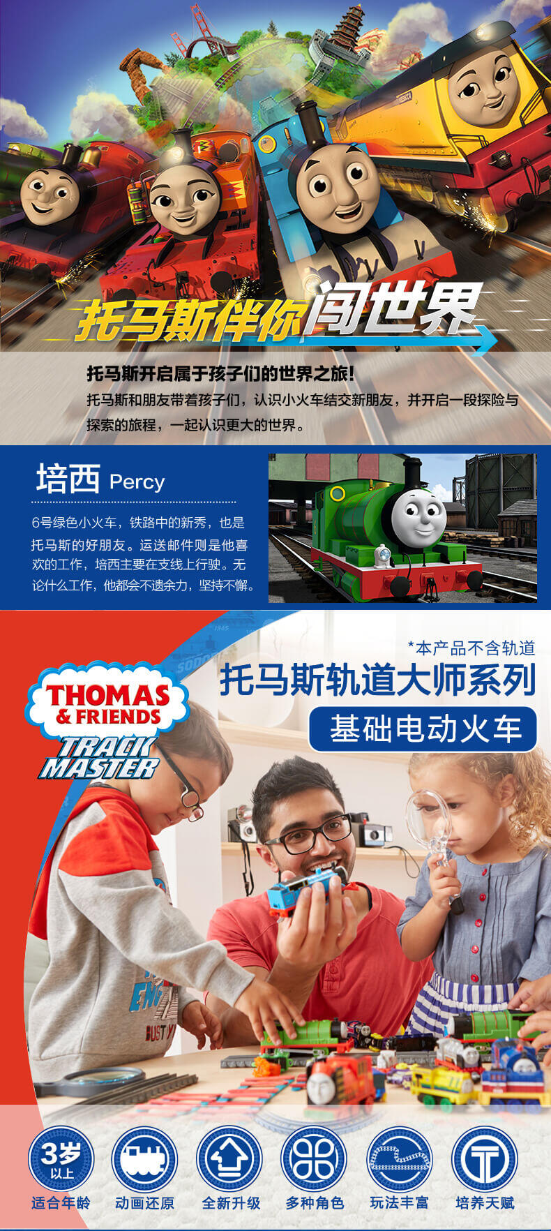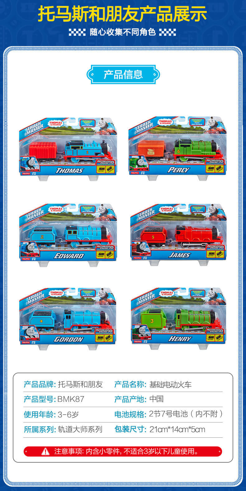 费雪出品的TrackMaster电动小火车令Thomas&Friends速度更快,跃升得更高,也有的历险!电视节目中你喜欢的角色都齐备,他们会为你的TrackMaster世界带来更多惊险旅程,并且会成为极佳的玩具火车收藏。你按动开关,就会看到他们进行另一场令人兴奋的竞赛!集齐所有火车,建造一条满布真正火车头的TrackMaster电动铁路吧!适合三岁或以上儿童。每列车需要用两枚AAA电池。