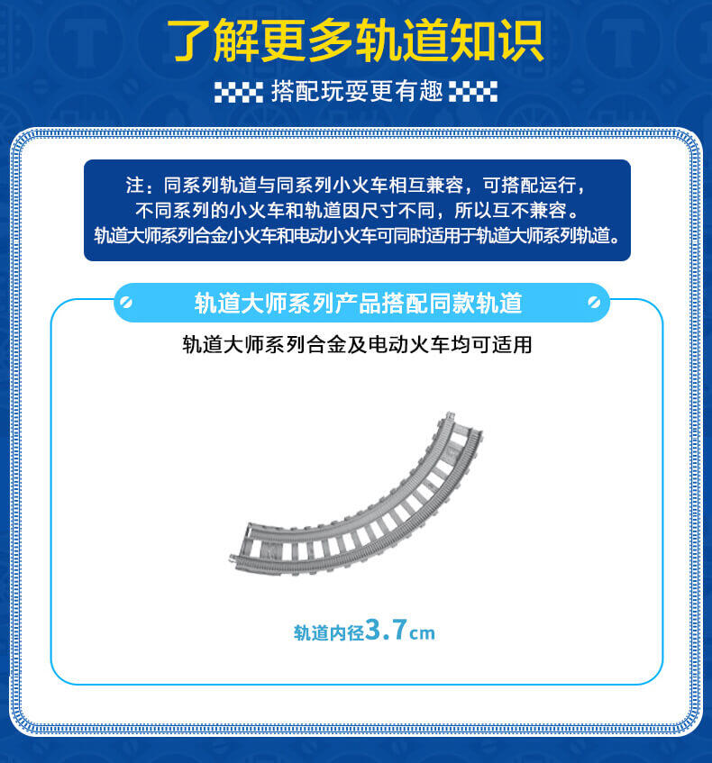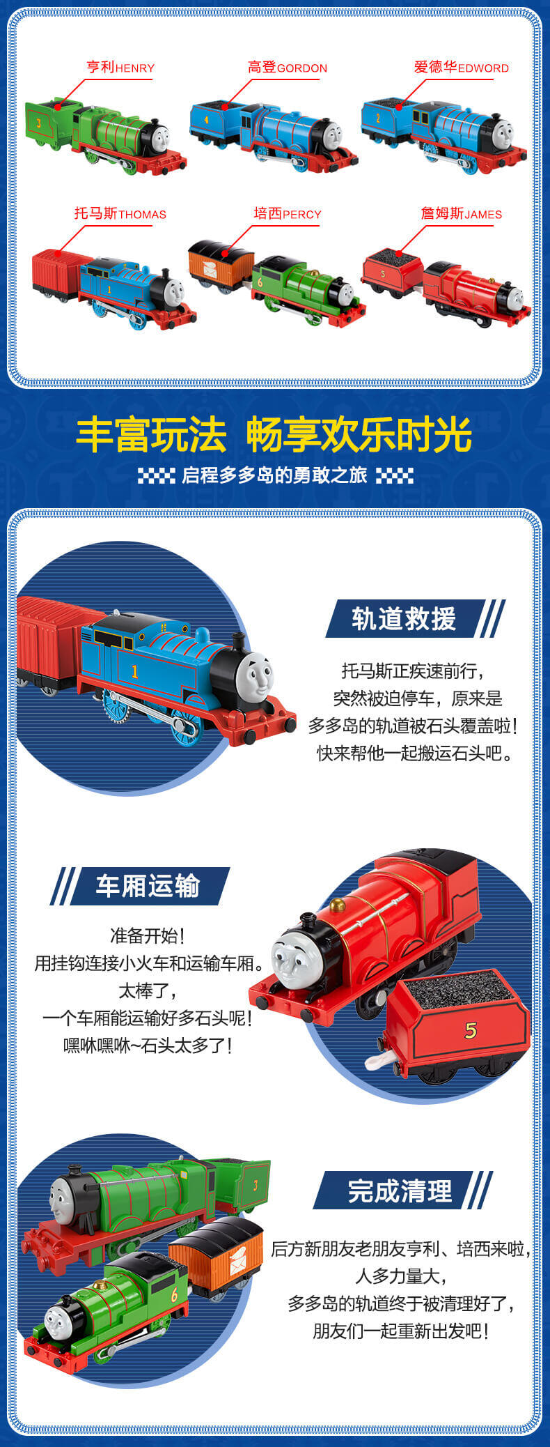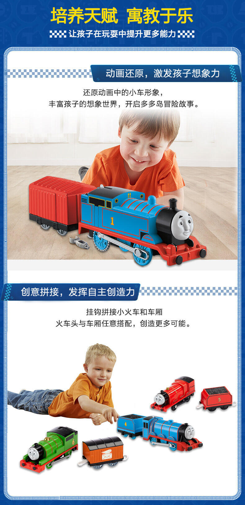 费雪出品的TrackMaster电动小火车令Thomas&Friends速度更快,跃升得更高,也有的历险!电视节目中你喜欢的角色都齐备,他们会为你的TrackMaster世界带来更多惊险旅程,并且会成为极佳的玩具火车收藏。你按动开关,就会看到他们进行另一场令人兴奋的竞赛!集齐所有火车,建造一条满布真正火车头的TrackMaster电动铁路吧!适合三岁或以上儿童。每列车需要用两枚AAA电池。