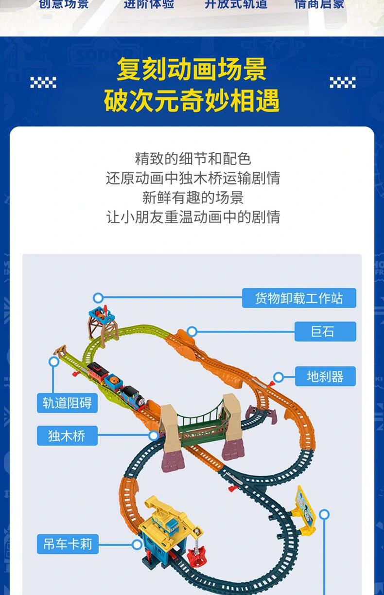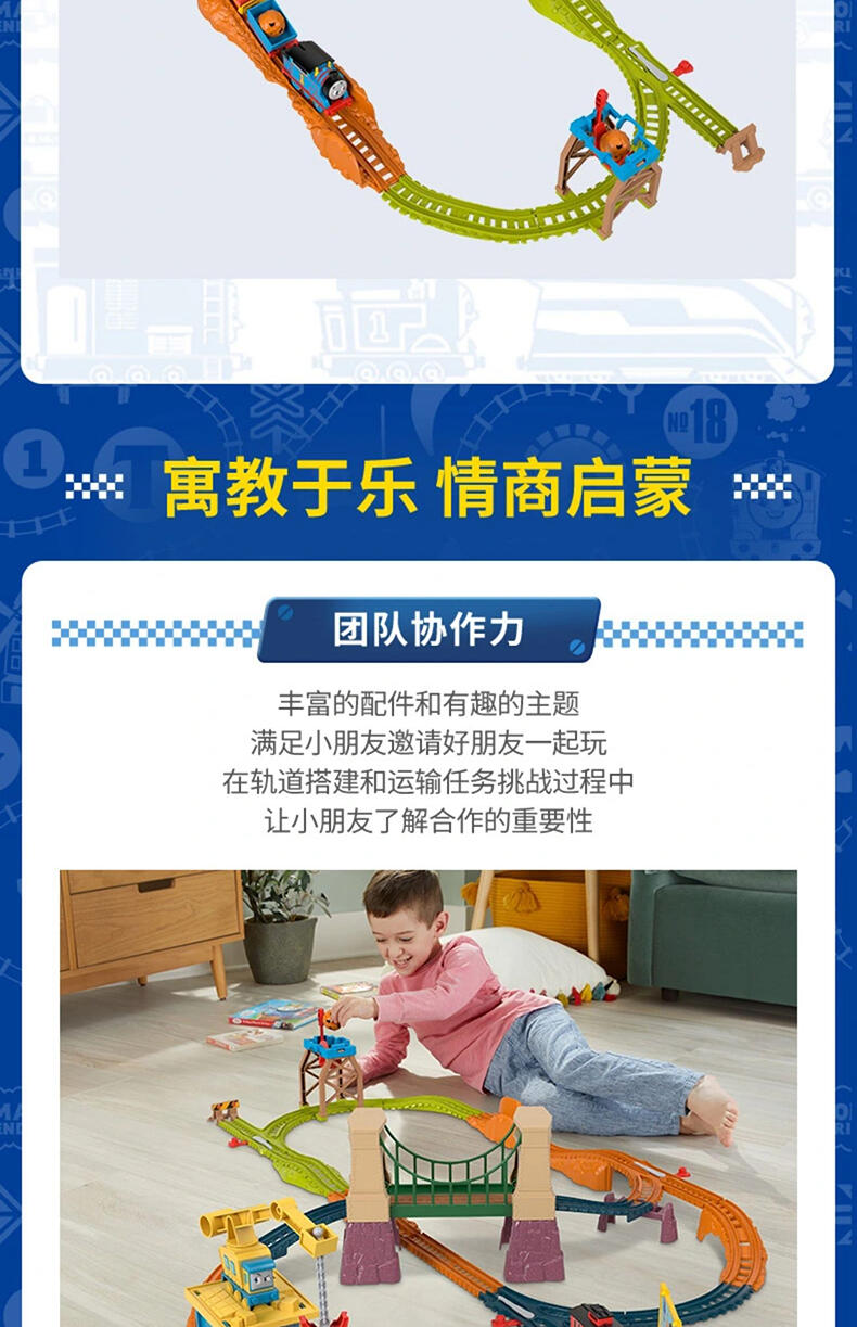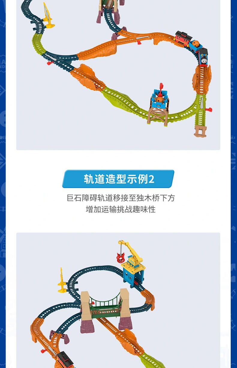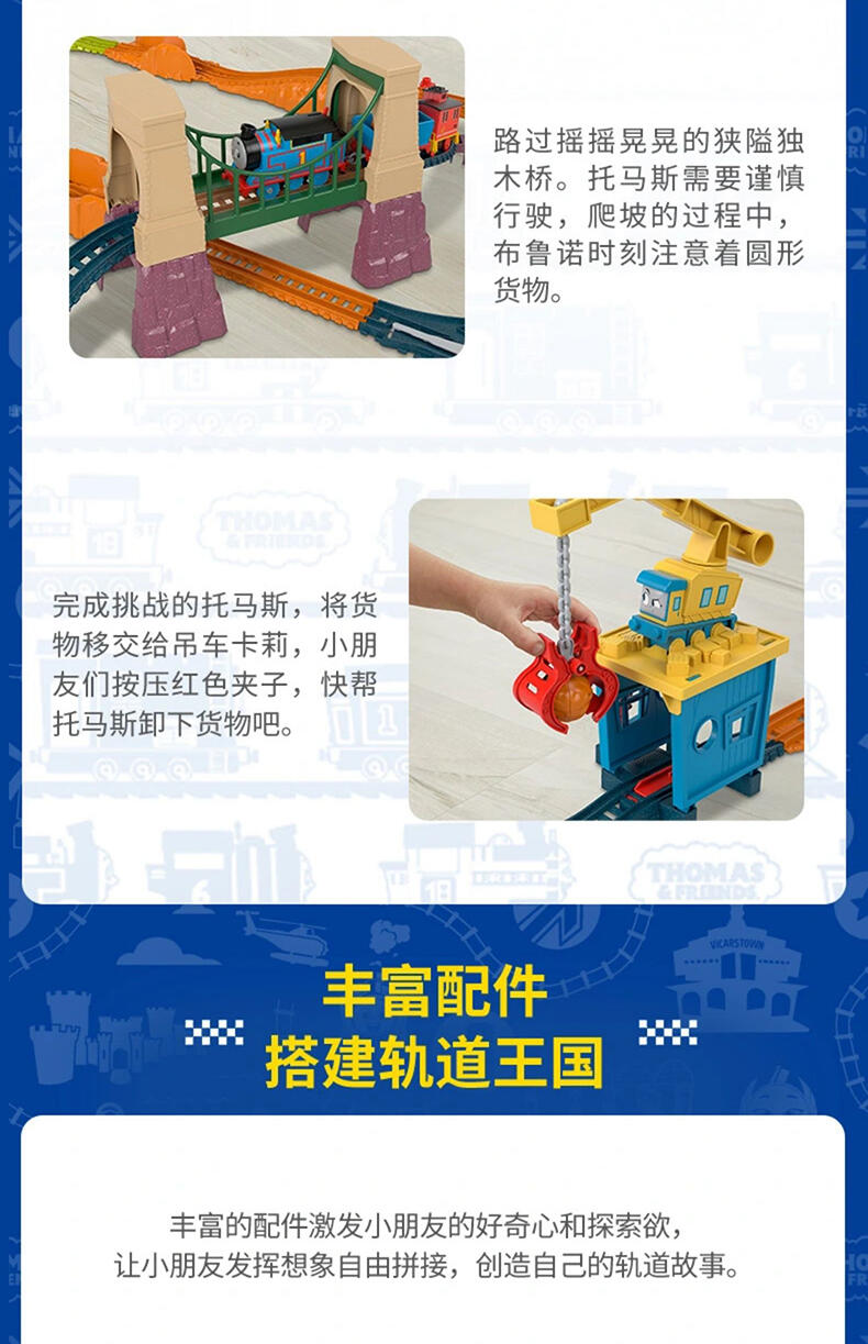 只需轻单击开关,孩子们就可以让电动托马斯小火车沿着轨道飞驰 从吊车卡莉处接载货物,然后连接缓急车布鲁诺,别忘注意摇摇晃晃的轨道和巨石! 孩子们可以拼搭这个有趣的轨道来创造属于他们自己的铁路故事