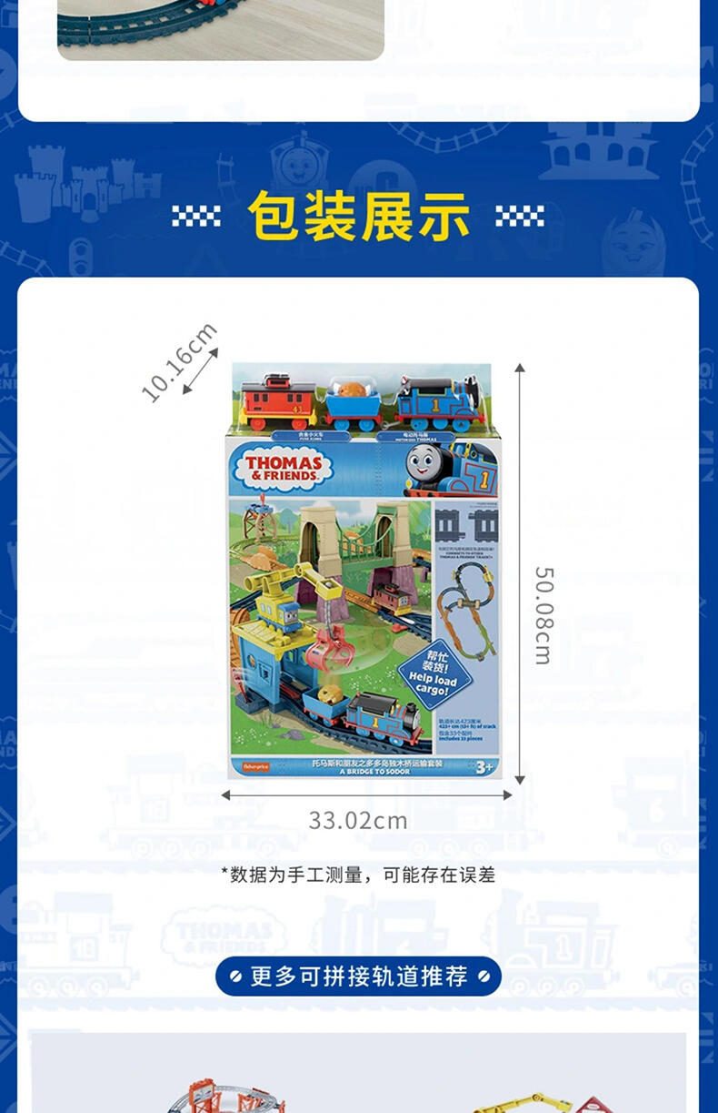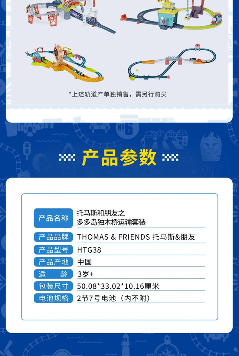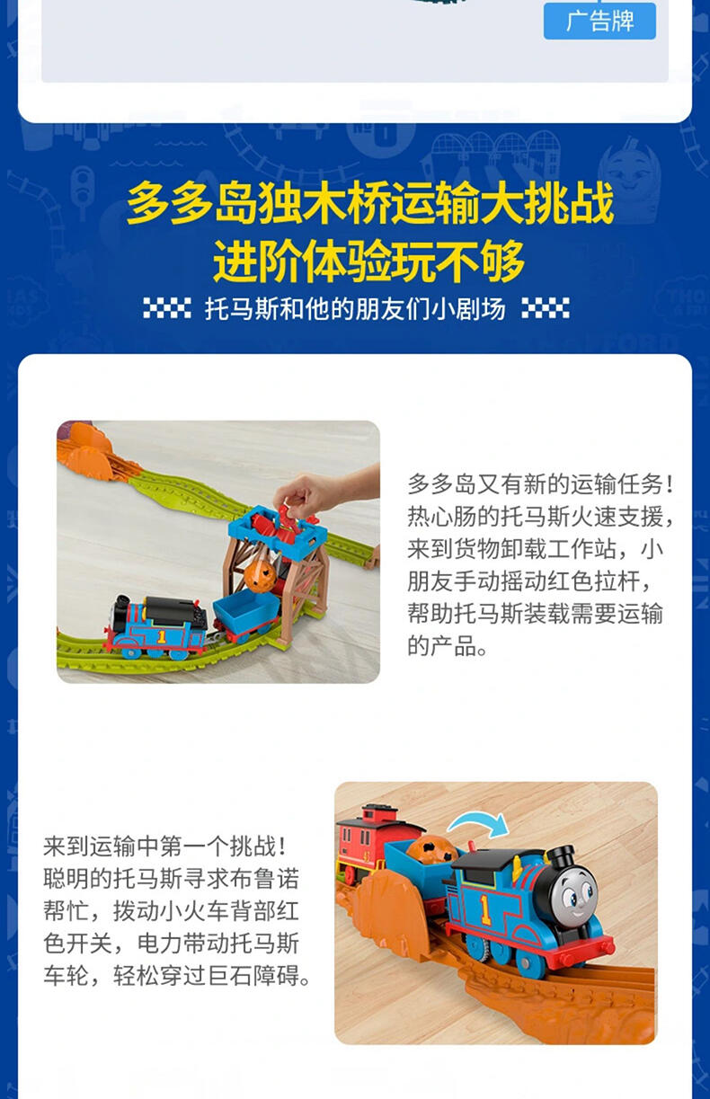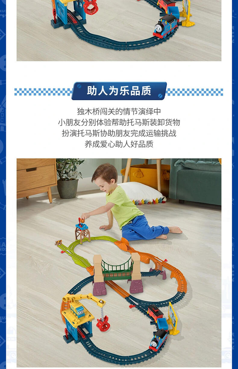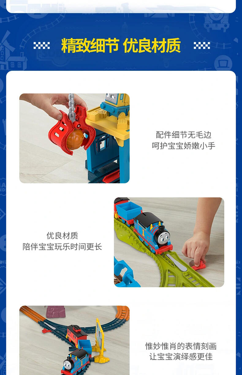 只需轻单击开关,孩子们就可以让电动托马斯小火车沿着轨道飞驰 从吊车卡莉处接载货物,然后连接缓急车布鲁诺,别忘注意摇摇晃晃的轨道和巨石! 孩子们可以拼搭这个有趣的轨道来创造属于他们自己的铁路故事
